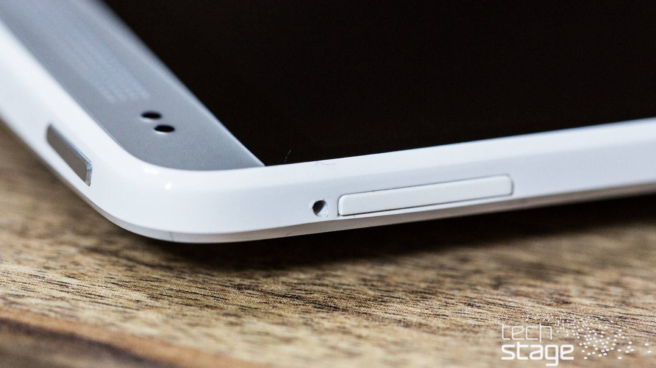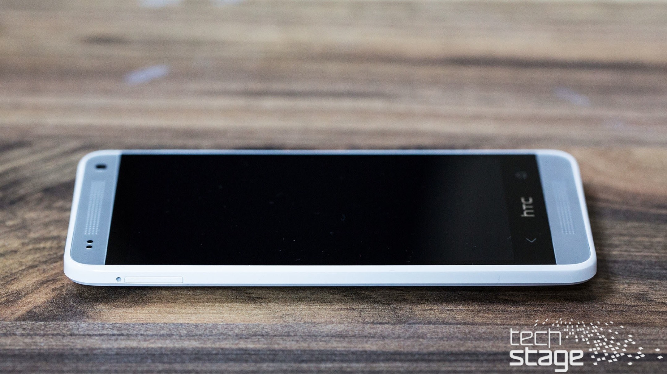 Die Oberseite trägt den Ein-Aus-Taster, der einfach aus Kunststoff gefertigt ist und nicht, wie das große Modell, eine Infrarot-Schnittstelle integriert. Weiter rechts sitzt die Klinkenbuchse. Am rechten Rand sind zwei einzelne Tasten zur Regelung der Lautstärke anstelle eines Wippschalters, unten befindet sich die Micro-USB-Buchse, links der versenkte Micro-SIM-Slot. Hier kann man eine potentielle Schwachstelle des One mini erahnen: Durch häufige Wechsel der SIM-Karte beim Prototypen zeigt der Plastik-Rahmen schon leichte Ermüdungserscheinungen – sprich Kratzer und Abschabungen. Also: Vorsicht mit der Büroklammer.