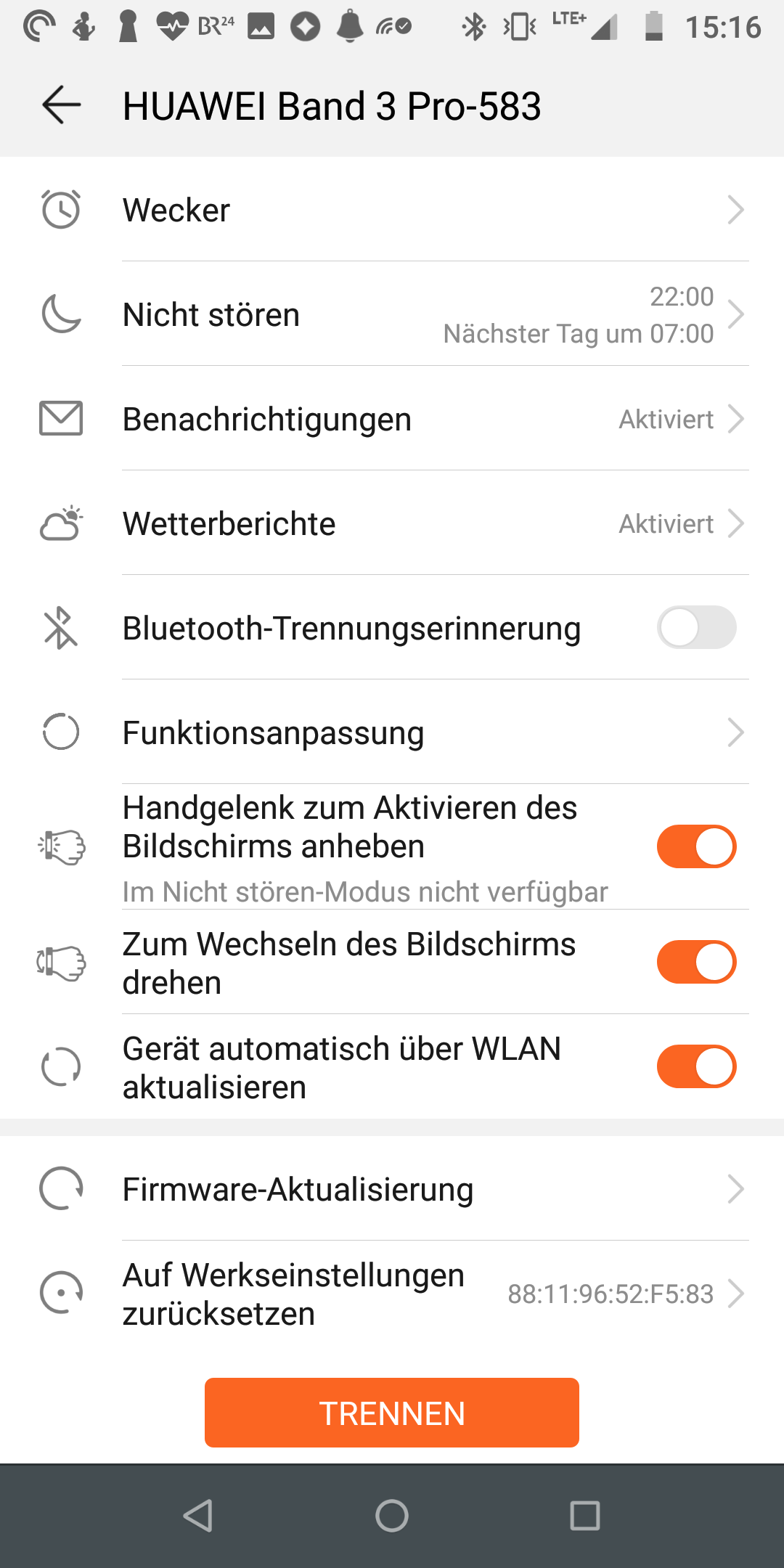 Etwas mehr Mühe hätte sich Huawei bei der Übersetzung des Trackers machen können. „Watch Faces”, also die verschiedenen Designoptionen, wurden mit „Gesichter” übersetzt. Der Wecker verlangt, dass man die seitliche Taste drücken soll, um den Snooze-Modus zu aktivieren. Doch das Band 3 Pro hat keine seitliche Taste, nur eine unterhalb des Bildschirms. „Free Training” wurde nicht mit „freiem Training”, sondern „Kostenlos Training” übersetzt. Das sind Kleinigkeiten, doch etwas mehr Mühe hätte sich das Unternehmen hier geben können.