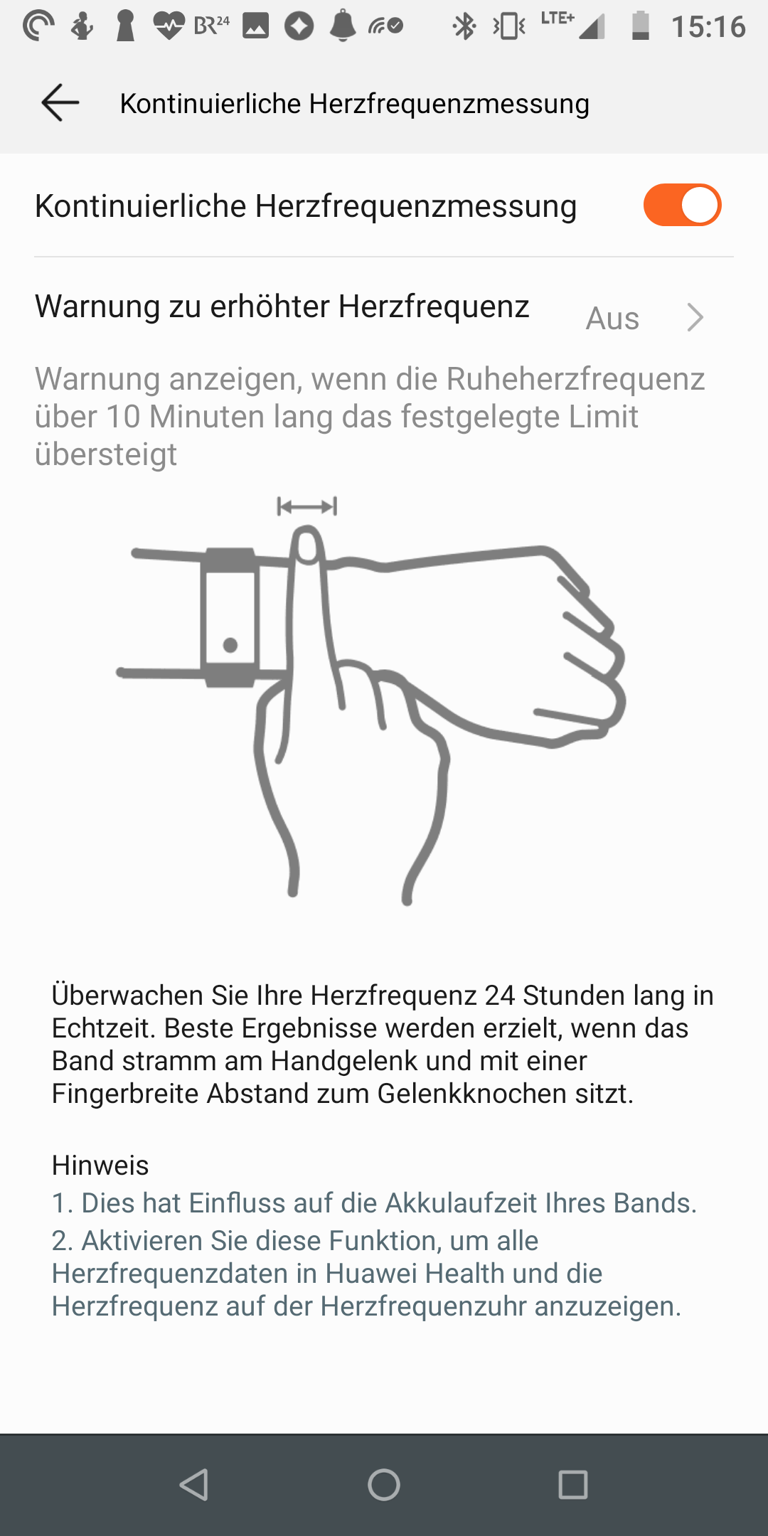 Die Steuerung ist einfach, mit einer Wischgeste von unten nach oben schaltet man zwischen den verschiedenen Optionen durch. Huawei hat zudem die Unterstützung für die Drehgeste des Vorgängers übernommen: Dreht man das Handgelenk, erkennt der Tracker das und schaltet die Ansicht um. Gerade beim Sport ist das enorm praktisch, da man beim Laufen nicht mit verschwitzten Fingern auf dem Display herumtippen muss.