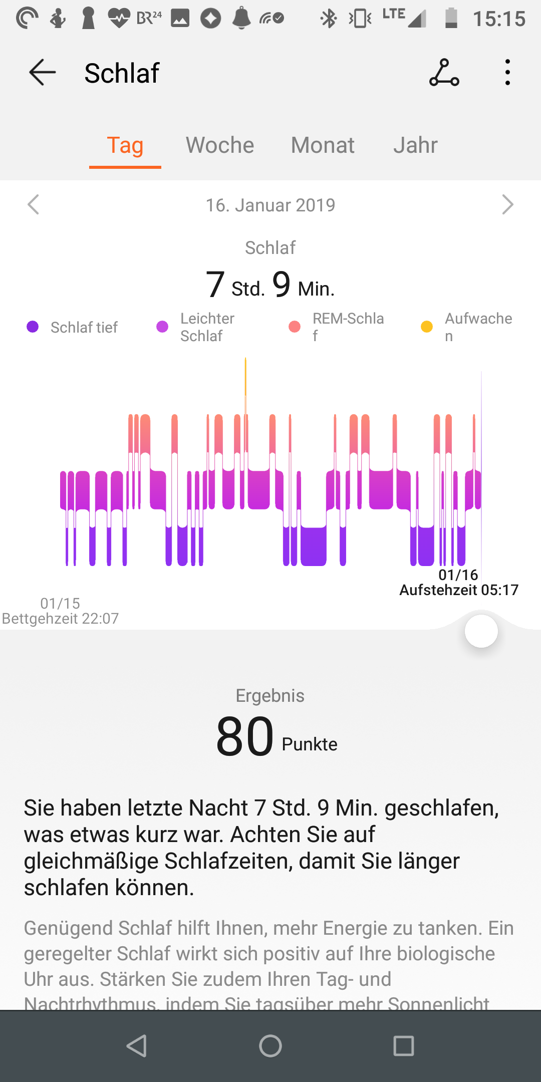 Ein wichtiges Feature von Fitness-Trackern ist die Überwachung des Schlafs. Das geschieht anhand der Bewegung sowie des Pulses. Huawei liefert hier auf der technischen Seite wie beim Band 2 Pro ein sehr gutes Bild ab. Die „Tru-Sleep”-Erkennung klappt gut, die Schlafdaten wirken nahe an der Realität. Klar, mit den Messungen eines professionellen Schlaflabors kann das Band 3 Pro nicht mithalten, doch gerade über einen längeren Zeitraum liefert es sinnvolle Daten. Wer ungut schläft, kann dank der schön aufbereiteten Informationen und der Tipps in der App seine Routine so ändern, dass er langfristig besser ausgeruht ist.