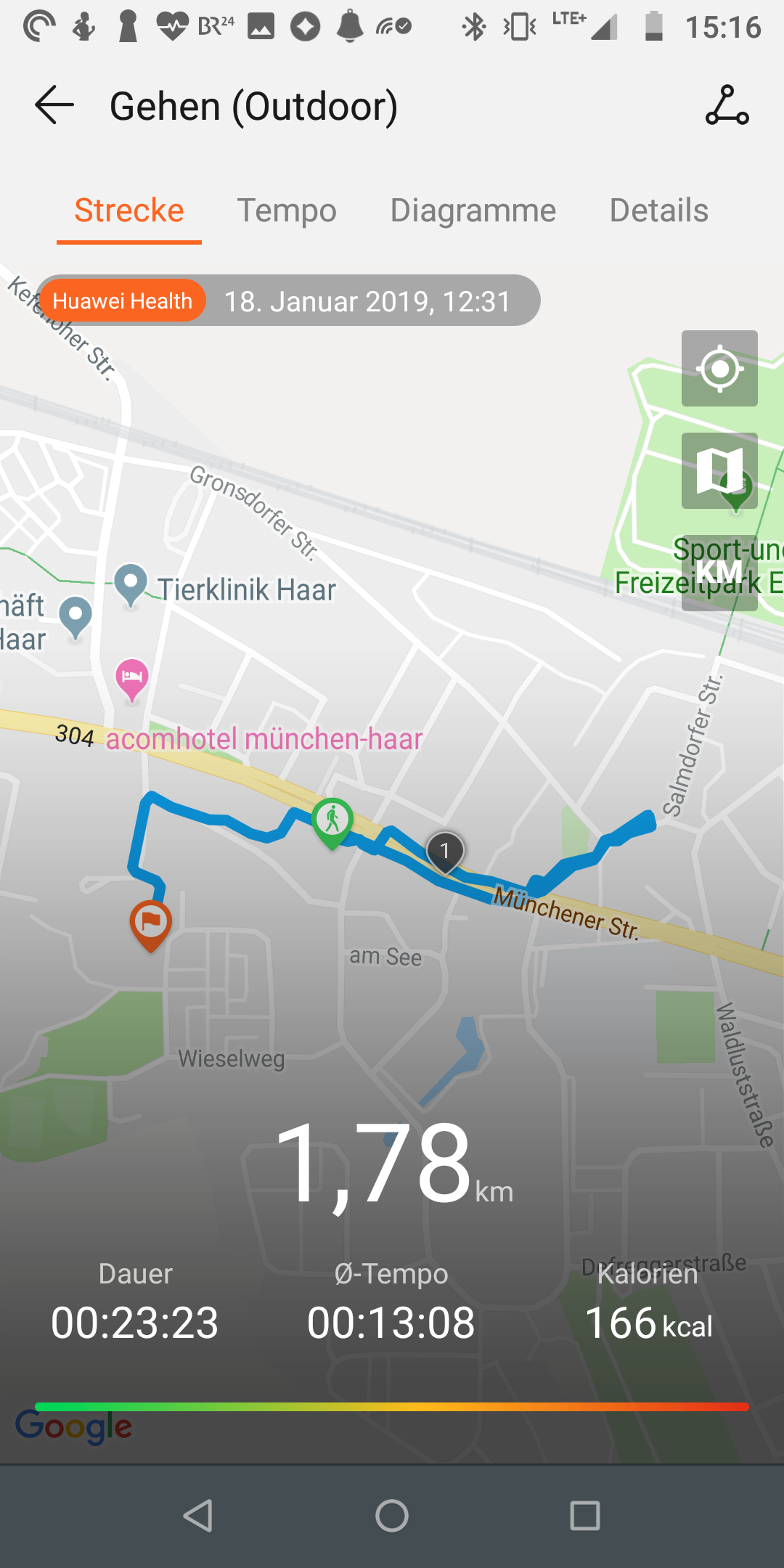 Wie der Vorgänger hat auch das Band 3 Pro ein integriertes GPS-Modul, das die Strecken beim Laufen oder Radfahren mit aufzeichnet. Im Test dauerte es etwas, bis das GPS den ersten Fix bekommen hatte, danach waren die Daten aber zuverlässig. Gut gefallen hat uns, dass Huawei offenbar deutlich am Stromverbrauch gearbeitet hat. Wo GPS beim Band 2 Pro den Akku enorm belastet hat, schlägt sich das Band 3 Pro besser. Eine knapp 20-minütige Testmessung hat knapp 10 Prozent Leistung gekostet. Das ist immer noch nicht prickelnd, erlaubt aber deutlich längere Trainings.