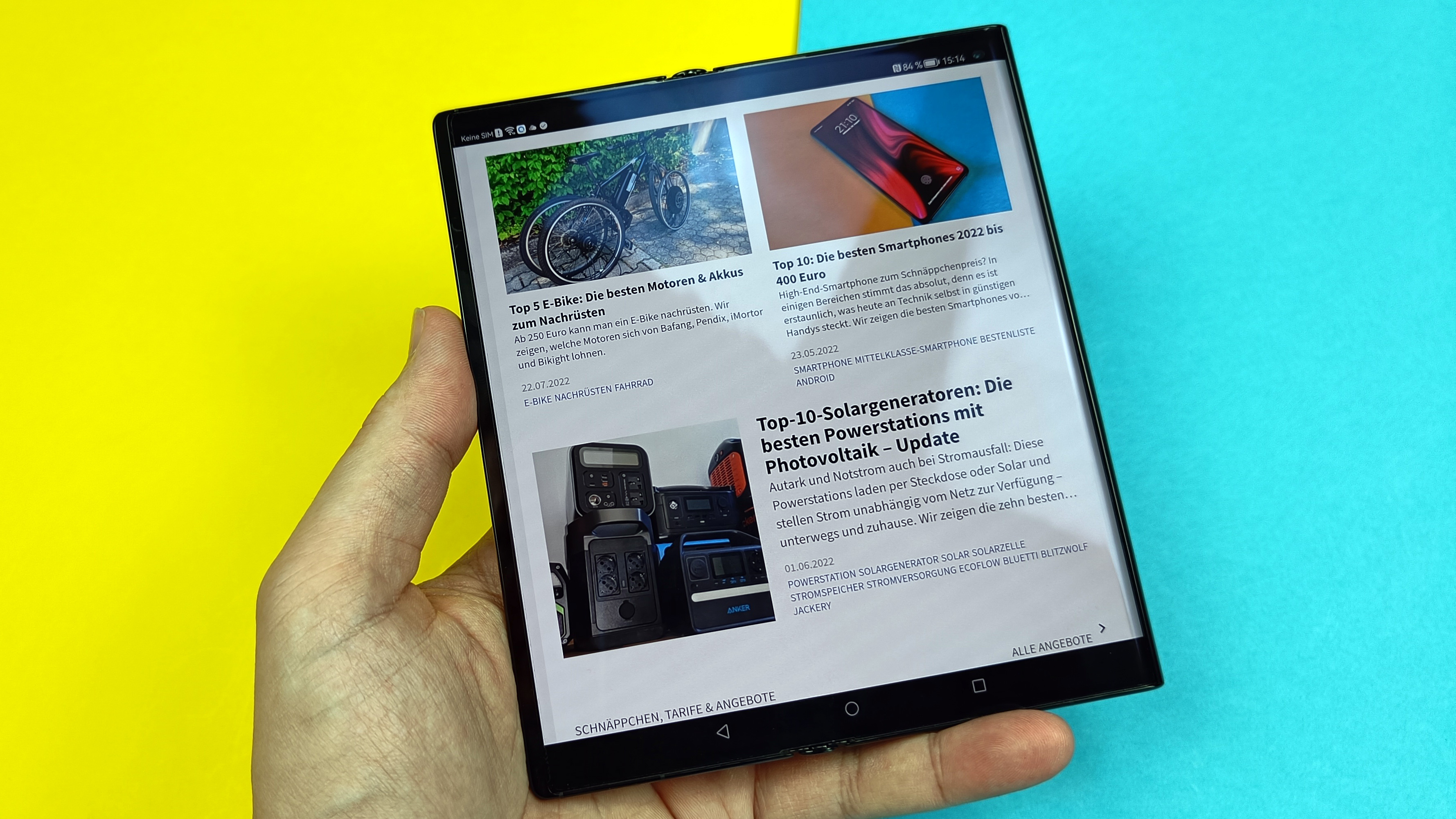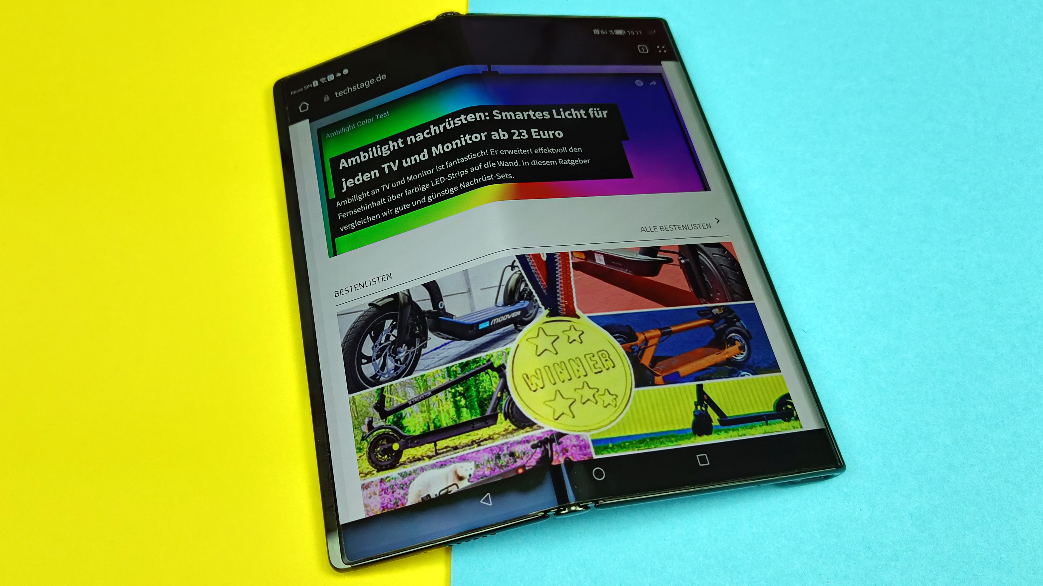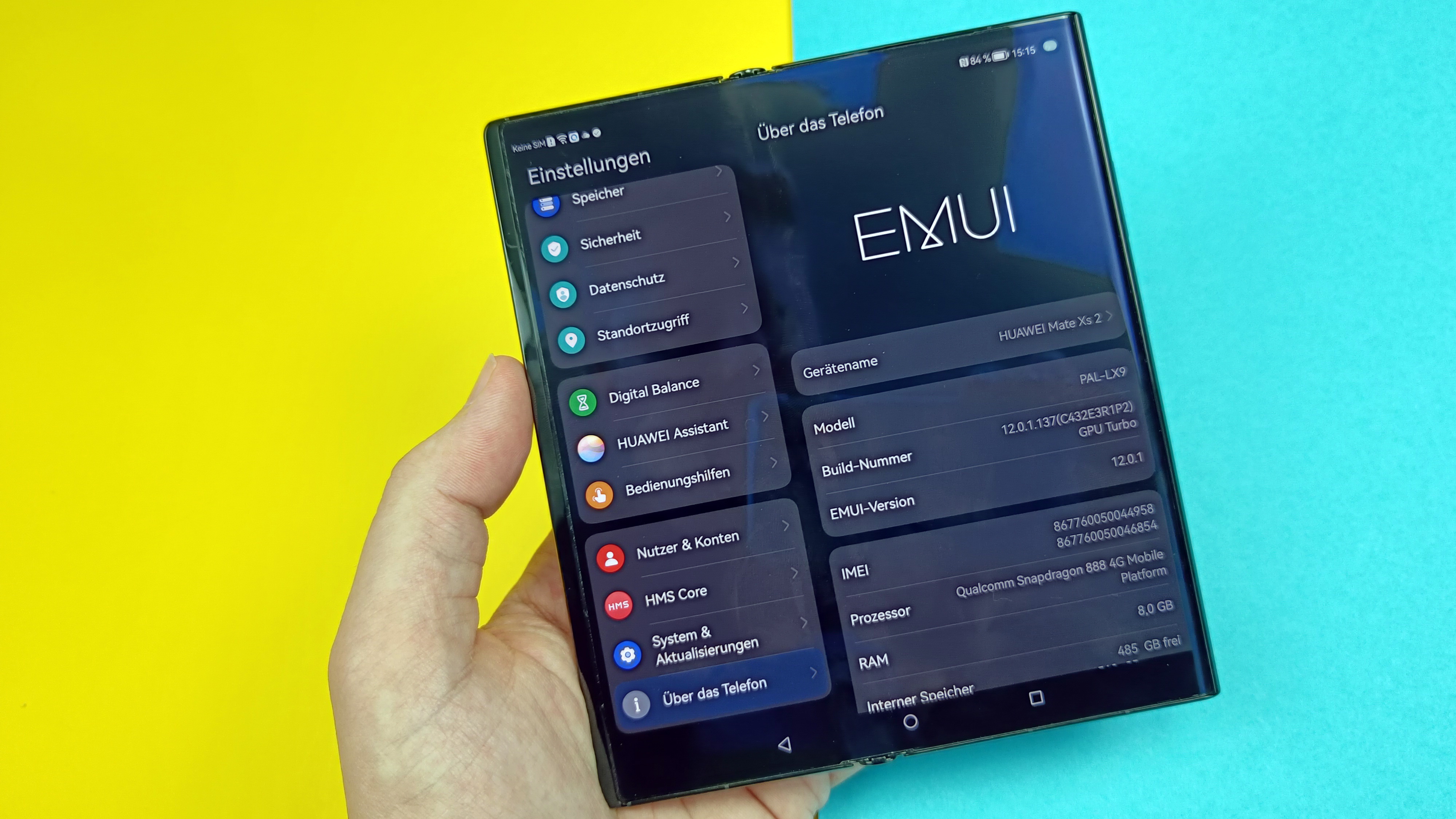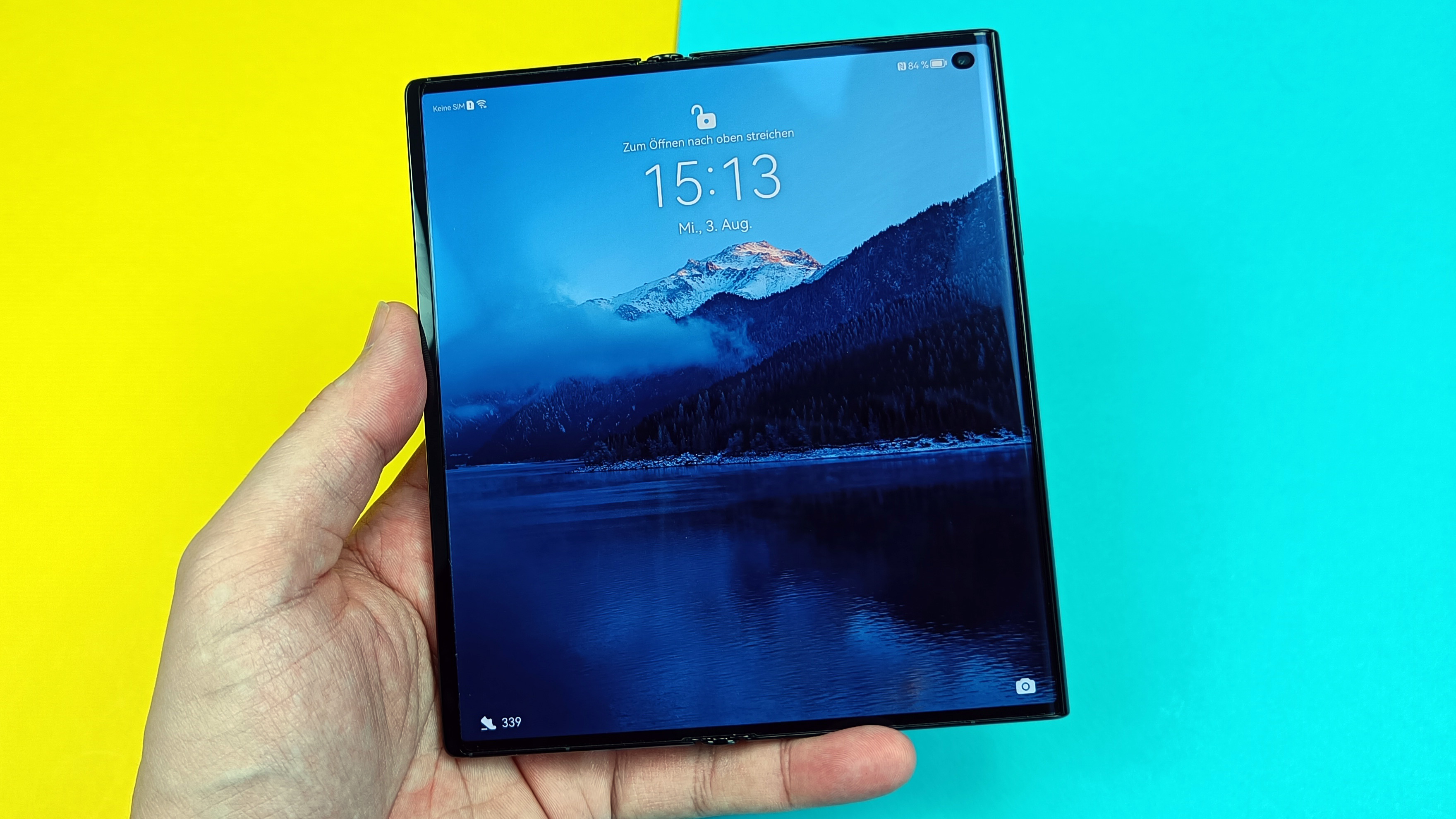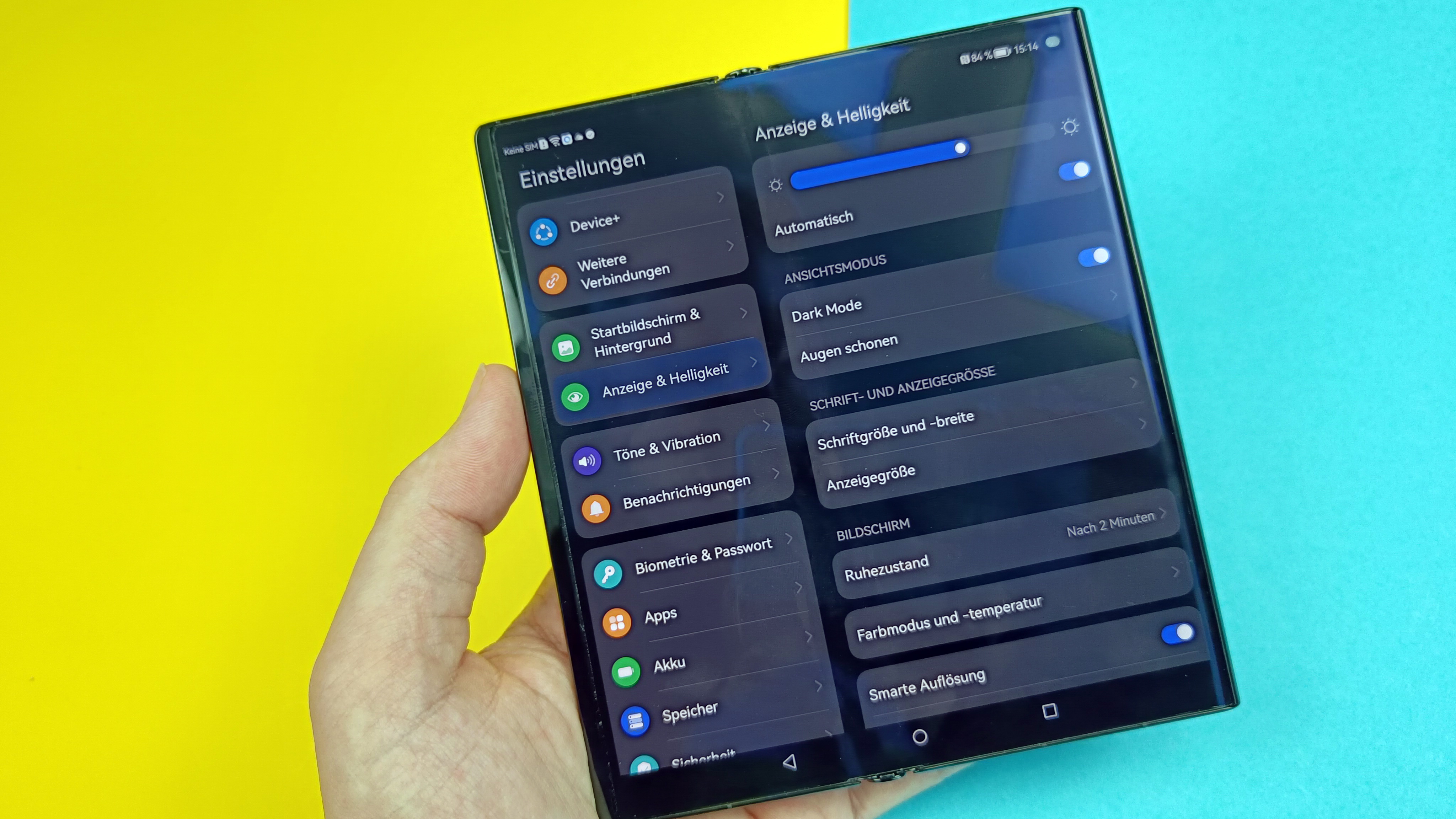 Ansonsten gibt es nur Positives zu berichten. Farben lassen sich auf Wunsch natürlich oder auch sehr intensiv darstellen, der Weißabgleich ist in Ordnung und darf vom Anwender angepasst werden. Die Blickwinkelabhängigkeit ist wie von OLED-gewohnt vorbildlich und die Helligkeit wurde beim neuen Modell weiter nach oben geschraubt. Im manuellen Modus konnten wir 465 cd/m² messen, im Automatikmodus bei Sonneneinstrahlung maximal 675 Candela. Das ist längst nicht auf dem Niveau der besten Modelle mit starrem Panel, aber im Alltag durchaus ordentlich. Das Always-On-Display bietet zahlreiche Anpassungsmöglichkeiten. Insgesamt überzeugt der Screen sowohl zusammengefaltet als auch ausgeklappt. Im Vollformat sieht man die Faltstelle jetzt wie von Huawei beworben tatsächlich weniger bis gar nicht. Dabei scheint die Falte immer etwas Zeit zu brauchen, um sich glattzuziehen: anfangs sieht man noch leichte Unebenheiten, nach kurzer Zeit selbst gegen das Licht oder in Reflexionen gezwungen nicht mehr – klasse!