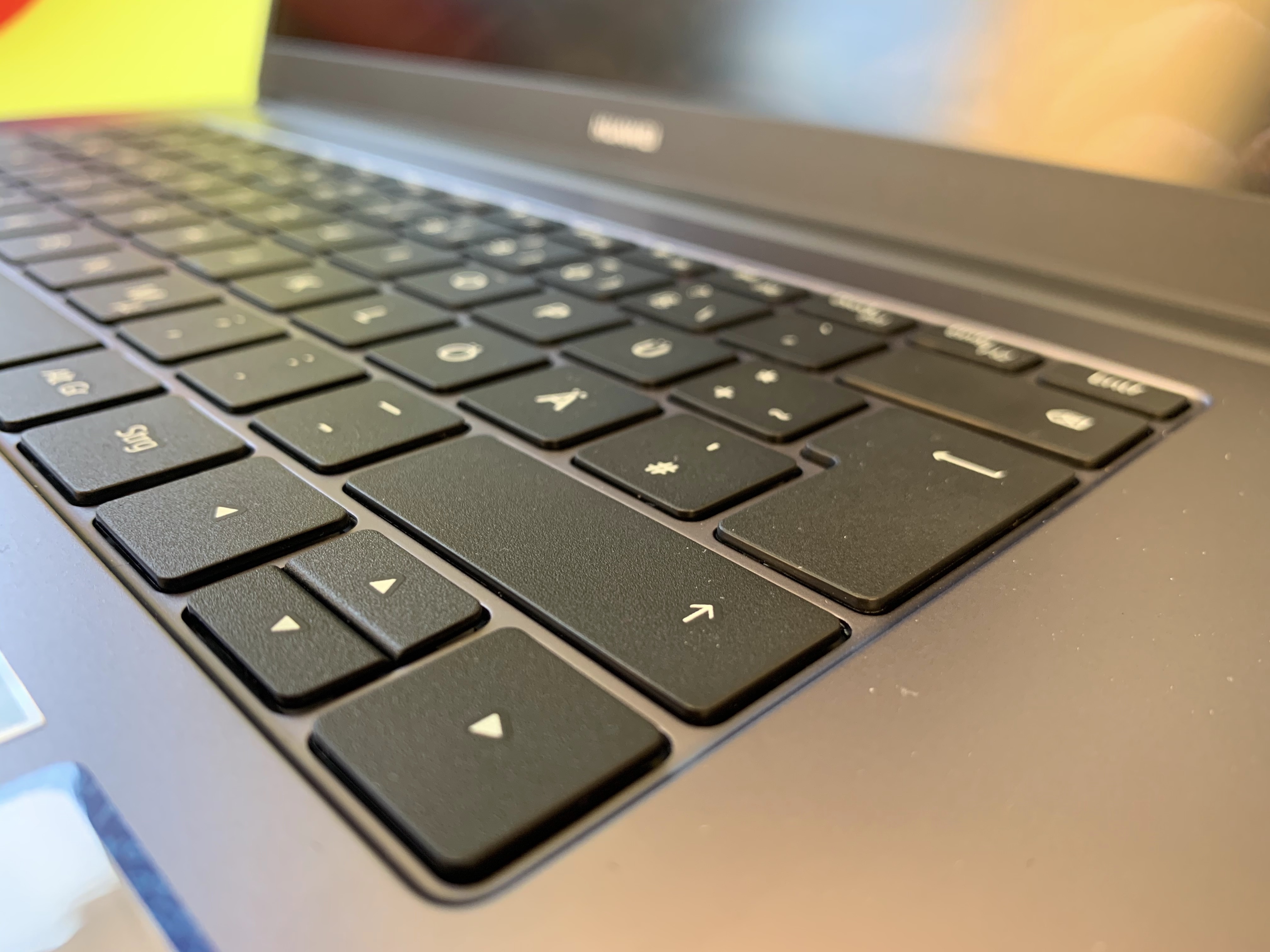 Breite und Tiefe der Tastatur des D15 sind stimmig und entsprechen einer klassischen externen Tastatur. Einzig bei den F-Tasten muss man sich umgewöhnen. Diese hat Huawei verkleinert und verschoben, damit die Webcam mittig Platz findet. Weniger schön empfinden wir die raue Haptik der Tastatur. Warum der Hersteller das gemacht hat, ist unklar. Für uns bietet es keinen ersichtlichen Mehrwert. Der Tastenhub ist ausreichend komfortabel und ähnelt dem der aktuellen Macbooks (ab Ende 2018).