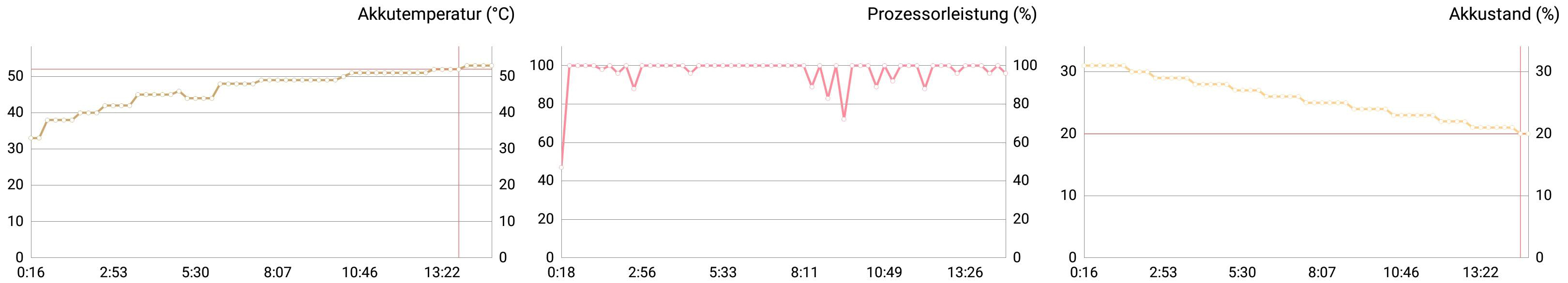 In dem 15 Minuten langen Stresstest von Antutu reagiert das System äußerst stabil und teilweise besser als der aktuelle Snapdragon 845 im LG G7 Thinq (Testbericht) . Der erste Leistungsabfall macht sich bei der dritten Minute mit 90 Prozent der abrufbaren Prozessorleistung bemerkbar. Der Extremwert von -25 Prozent erscheint erst bei der neunten Minute. Das ist bemerkenswert strapazierfähig. Gleichzeitig fällt auf: Die Temperatur des Akkus steigt in einer ungewöhnlichen Höhe: Binnen Minuten entwickelt das P20 Pro eine Wärme von 33 auf 52 Grad Celsius. Das ist weniger positiv. Huawei sollte entweder die Leistungsfähigkeit des Prozessors drosseln – dann wäre die Kurve volatil – oder an der Wärmeentwicklung arbeiten. Die Höchstleistung frisst 13 Prozent des Akkus. Der schnelle Energieverlust unter anderem bedingt durch die Wärme wirkt sich negativ auf die Akkukapazität aus. Das macht das P20 Pro nicht nachhaltig.