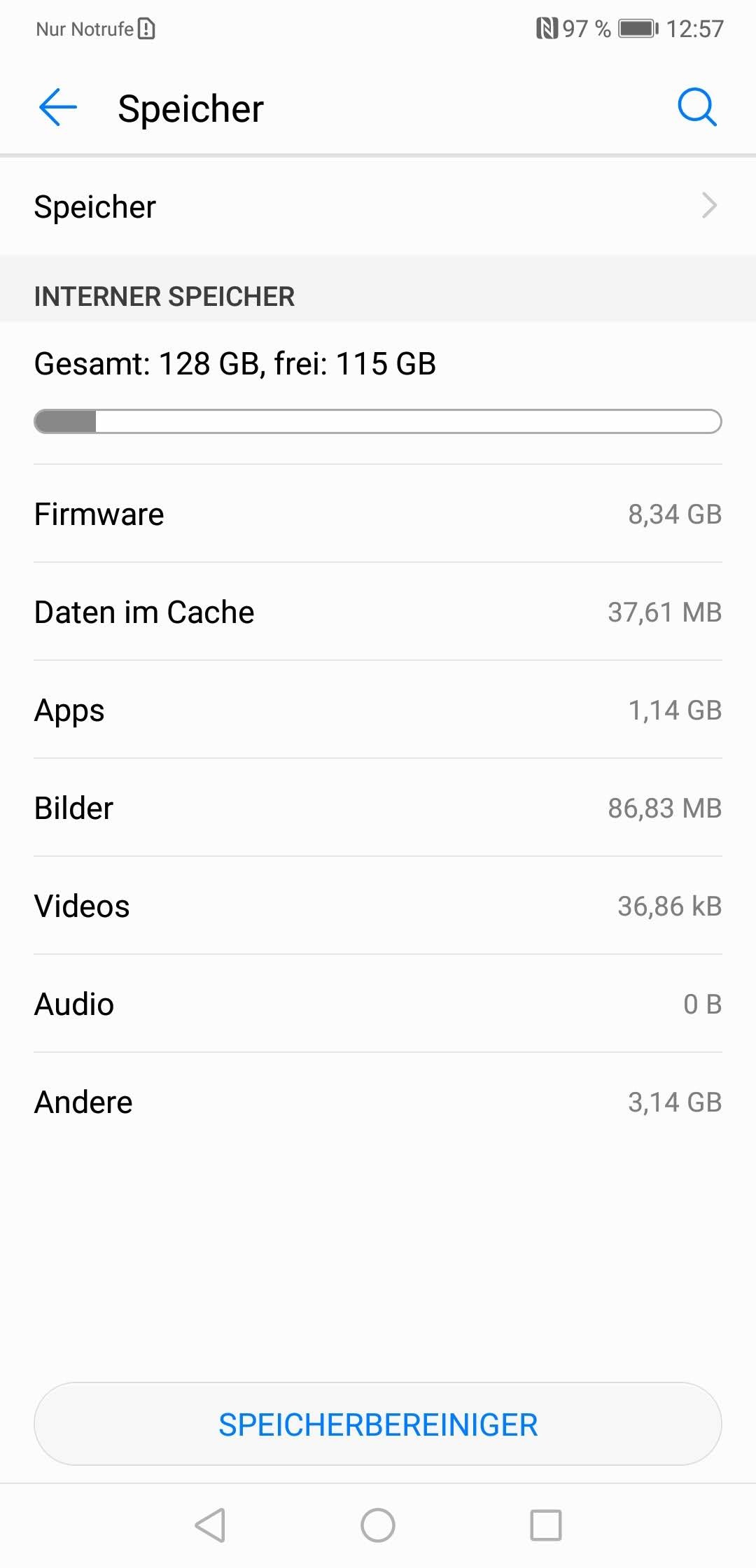Der interne Speicher des Huawei P20 Pro bietet eine Größe von 128 GByte. Nach Abzug des Betriebssystems und der Software stehen dem Nutzer etwa 112 GByte zur Verfügung. Es gibt keinen Micro-SD-Steckplatz, entsprechend lässt sich der Speicher nicht erweitern. Die 112 GByte dürften aber für einen Großteil der Nutzer ausreichen.