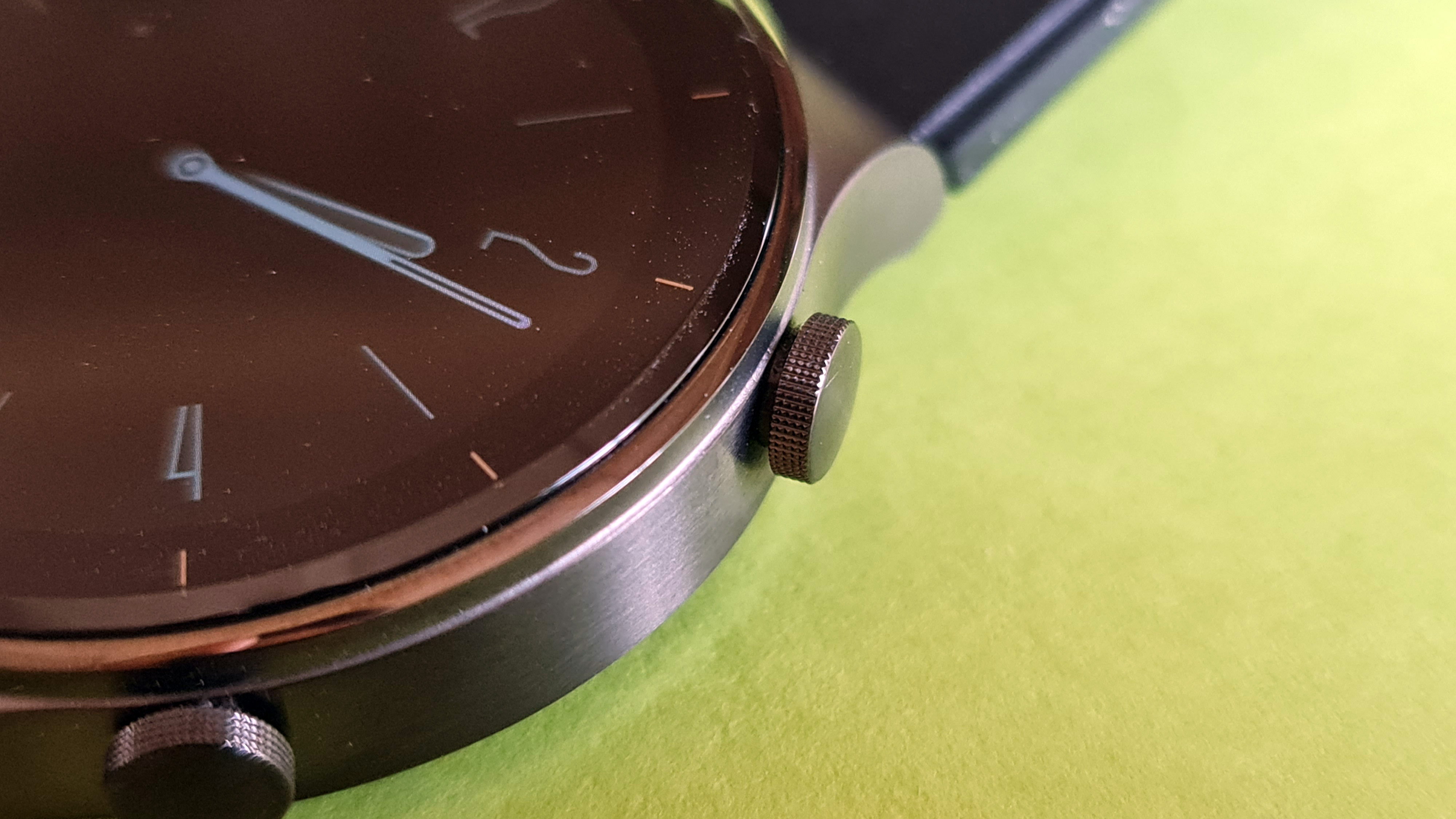 Was die reinen Zahlen belegen, versucht der Hersteller bei der Pro-Version nicht einmal mit optischen Tricks zu kaschieren. Ist bei der GT 2 die bereits erwähnte Lünette noch deutlich nach außen abgeflacht und selbst in der silbernen Version die Rückseite schwarz und versteckt damit am Handgelenk getragen bei einem Blick von der Seite noch einen weiteren Teil der tatsächlichen Gehäusedicke, so verzichtet die Pro auf derartige Tricks. Ihr Display steht insgesamt sogar deutlich sichtbar aus dem Gehäuse hervor. Der auch hier schwarze Keramikboden kann diesen vergleichsweise klobigen Screen-Aufsatz entsprechend gar nicht mehr beschönigen - trotz ihres sportlicheren Auftritts ist die GT 2 (Testbericht) filigraner. Da hilft es auch nichts mehr, dass der Rand der beiden seitlichen Druckknöpfe bei der Huawei Watch GT 2 Pro fein geriffelt ist. Genau genommen ist das sogar Unsinn, denn drehen – und nur dafür wäre diese Riffelung für besseren Gripp sinnvoll – lassen sich die Knöpfe ohnehin nicht.