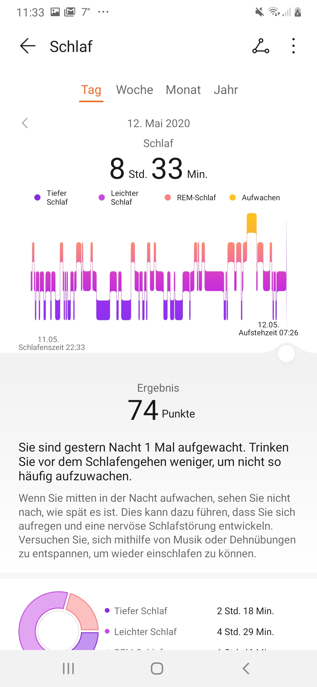 Die Smartwatch misst während des Schlafens unseren Puls, unsere Körperbewegungen und unsere Atmung. Daraus bestimmt sie in Kombination mit der Schlafdauer unsere einzelnen Schlafphasen und errechnet eine Schlafbewertung für jede Nacht. Die Huawei Health App zeigt dann alle Schlafdaten und die einzelnen Phasen in einer detaillierten Übersicht an. Wir können die Schlafdauer selbst aber auch direkt über die Smartwatch abrufen.
