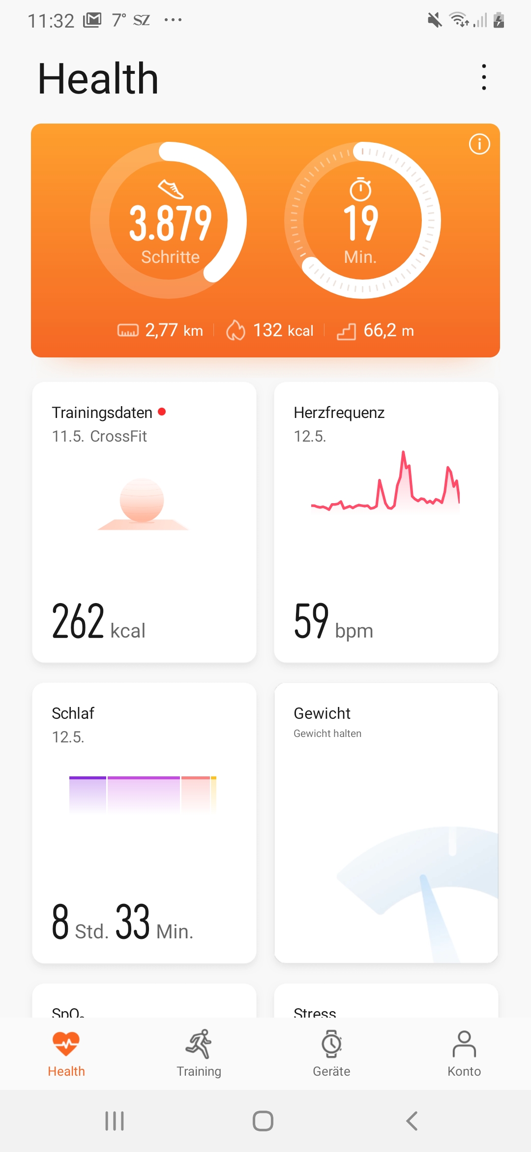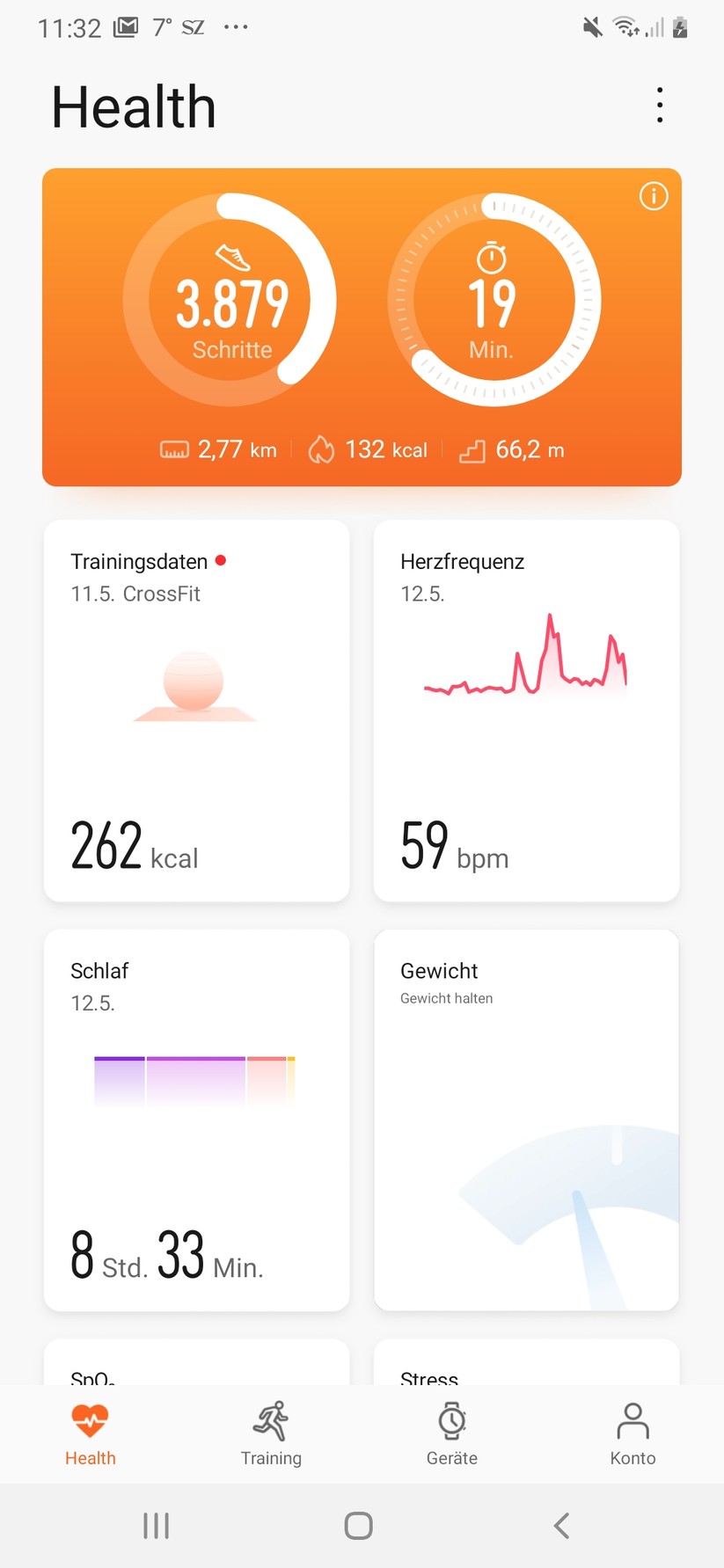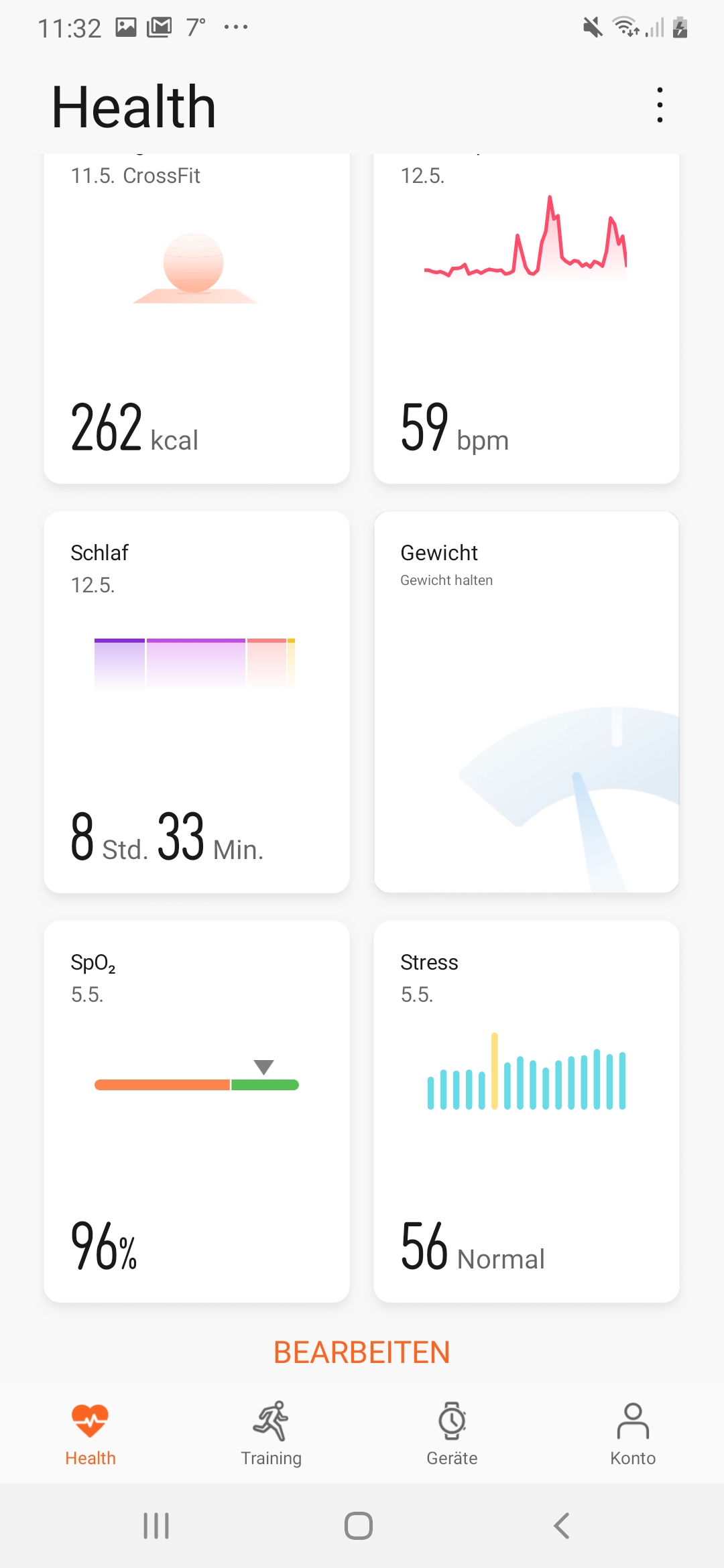 Der Health-Tab der App zeigt uns auf einen Blick die am aktuellen Tag zurückgelegten Schritte, Kilometer, verbrannte Kalorien, Aktivitätsminuten und gestiegene Höhenmeter an. Außerdem können wir über einzelne Kacheln unsere Trainingsdaten, unsere Schlafanalyse, Herzfrequenz, Sauerstoffmenge im Blut und Stresslevel anzeigen lassen.
