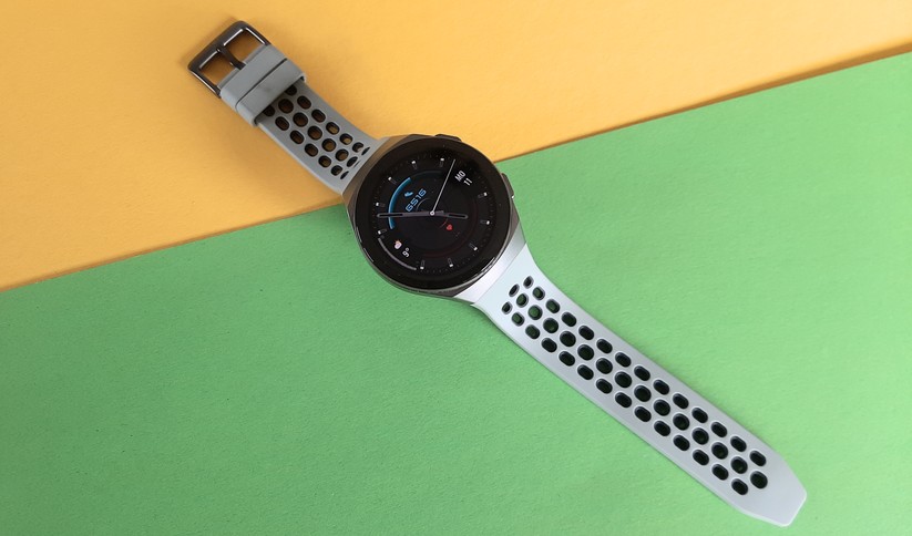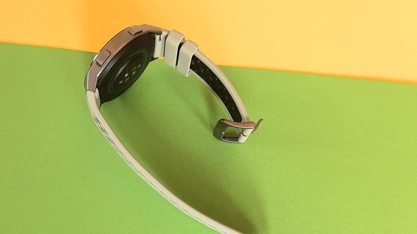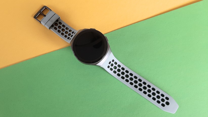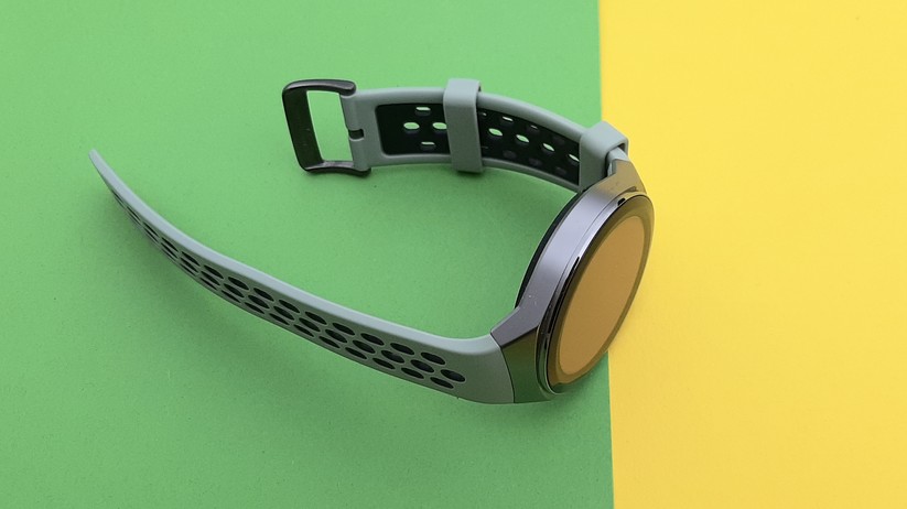Das Gehäuse der GT 2e besteht aus Metall und Kunststoff, verfügt über zwei dezente Bedienknöpfe an der Seite und geht direkt in das Kunststoffarmband der Uhr über. Das Silikonarmband orientiert sich ebenfalls am sportlichen Design der Uhr und richtet sich mit der leichten Dehnbarkeit und vielen Löchern explizit an Nutzer, die die GT 2e bei physischen Aktivitäten tragen möchten.