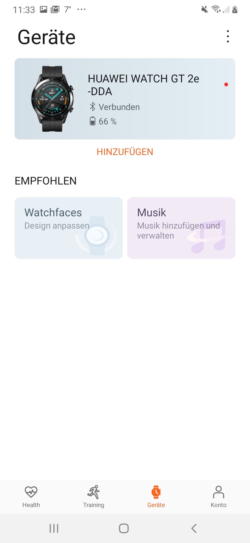 Um die Watch GT 2e einzurichten, müssen wir zuerst die Huawei Health App auf unserem Smartphone installieren, eventuell fordert diese zudem noch die Huawei Mobile Services. Dazu benötigen wir einen Huawei-Account, sonst funktioniert die App nicht. Ist das erledigt, koppeln wir die Smartwatch per Bluetooth 5.1 mit unserem Telefon. Das funktioniert ganz einfach über das entsprechende Geräte-Menü in der App und ist in ein paar Sekunden erledigt.