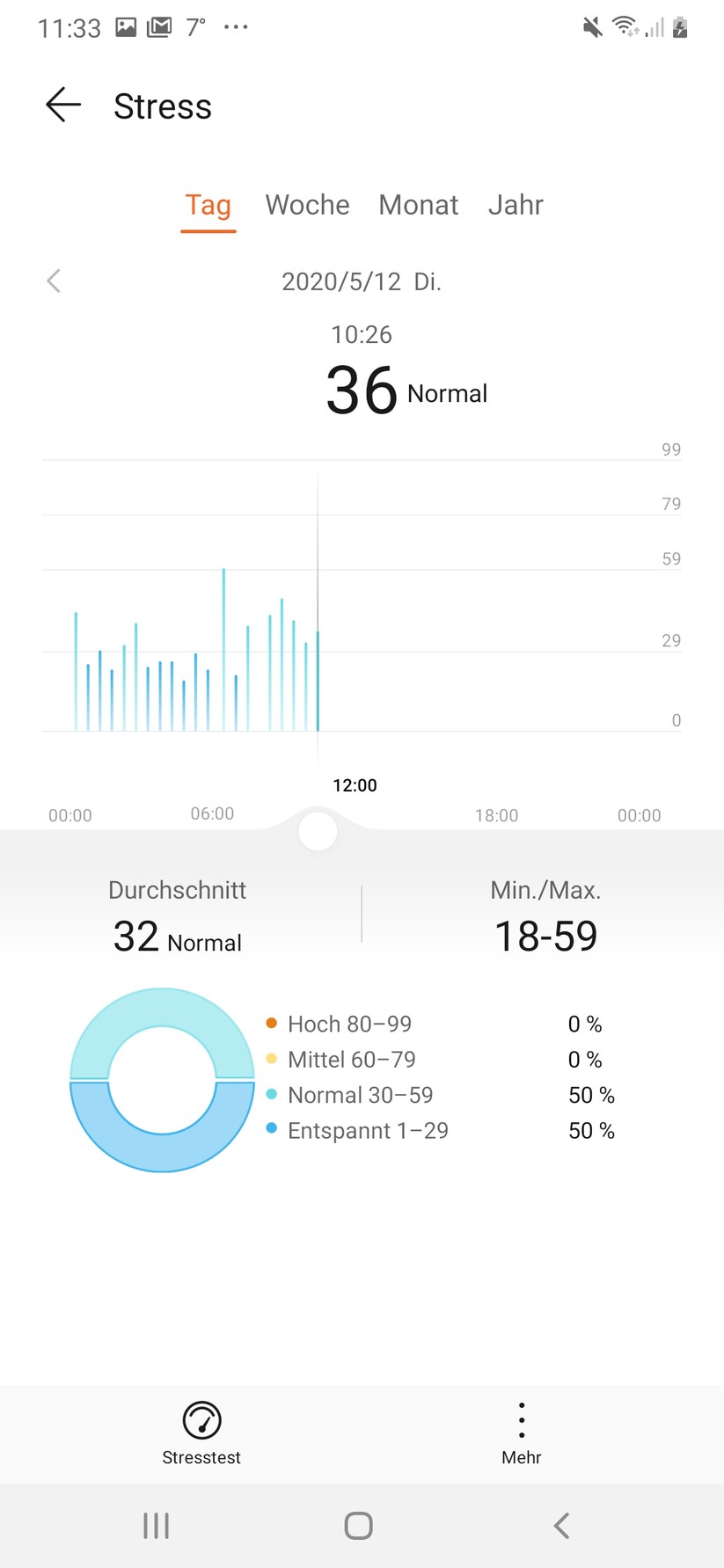 Die Smartwatch misst unseren Puls, den sie uns zusammen mit den gezählten Schritten, der Uhrzeit, aktuellen Wetterdaten und dem Tagesdatum prominent auf dem Display der Uhr anzeigt. Die Watch GT 2e nutzt die Pulsmessung, um uns mit diversen zusätzlichen Analysedaten zu versorgen. Dabei bestimmt sie anhand unserer Herzfrequenz unseren Stresslevel und bewertet ihn in vier Kategorien.