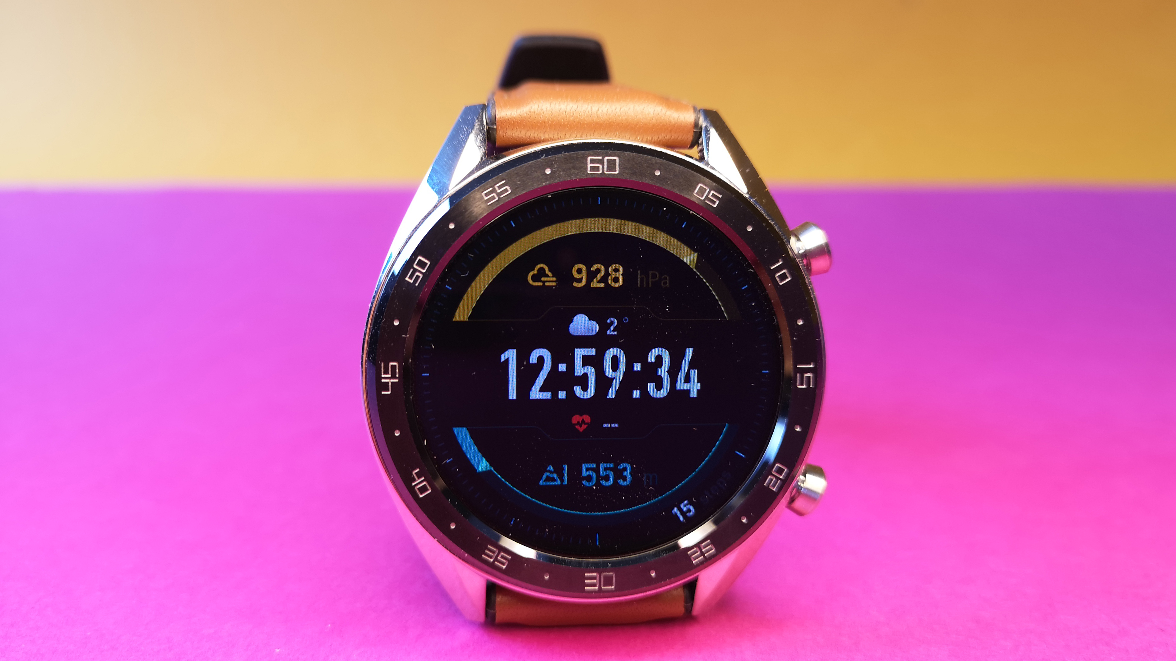 Für die Rechenleistung der Smartwatch sorgt ein ARM-Cortex-M4. Viele Details zu dem Prozessor finden wir nicht, in der Praxis ist die Leistung auf jeden Fall ausreichend, um einen flüssigen und ruckelfreien Betrieb zu gewährleisten. Das sehr helle AMOLED-Display hat eine Auflösung von 454 × 454 Pixeln. Das Ablesen bei direkter Sonneneinstrahlung ist kein Problem. In der Praxis war die Nutzung lediglich in der Nacht kritisch. Denn selbst auf niedrigster Helligkeitsstufe ist die Uhr noch sehr hell.