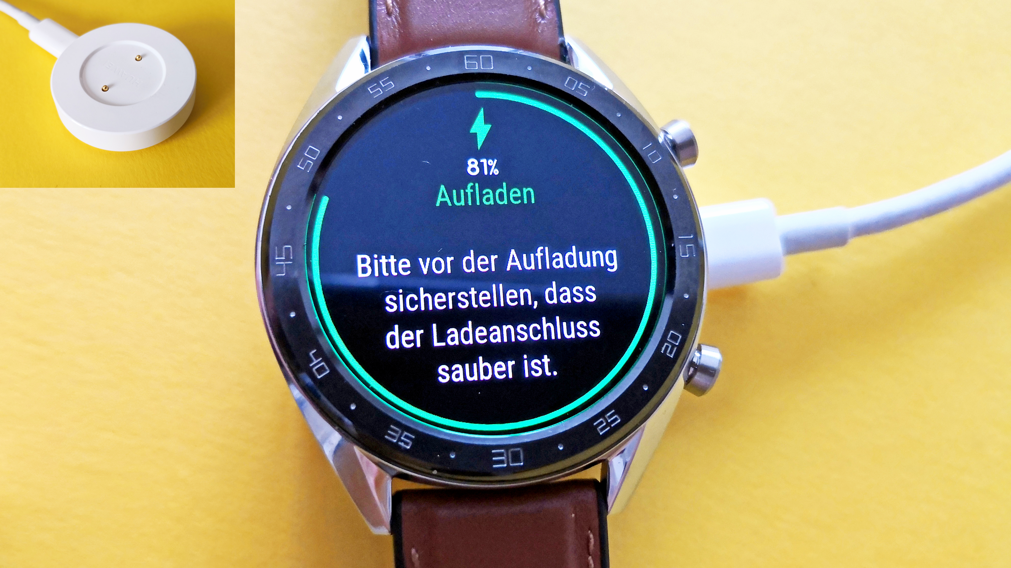 Der Akku der Watch GT hat eine Kapazität von 420 mAh und soll laut Huawei bis zu rekordverdächtigen 30 Tagen durchhalten. In der Praxis funktioniert das eigentlich nur, wenn die Uhr nicht genutzt wird. Aber selbst bei aktiver Bluetooth-Verbindung und dauerhafter Herzfrequenzmessung kommt die Uhr im Test auf gute zehn bis zwölf Tage Akkulaufzeit. Damit schlägt die Watch GT sogar die gute Leistung der Samsung Galaxy Watch (Testbericht) . Wer die Uhr täglich zur Messung von Trainingseinheiten nutzt, dürfte auf ein paar Tage weniger kommen. Eine Woche lang, sollte die Uhr aber auch dann noch durchhalten. Ein Kritikpunkt vieler Smartphone-Hater geht somit auf jeden Fall verloren: Tägliches Aufladen der Uhr ist bei diesem Modell definitiv nicht notwendig.