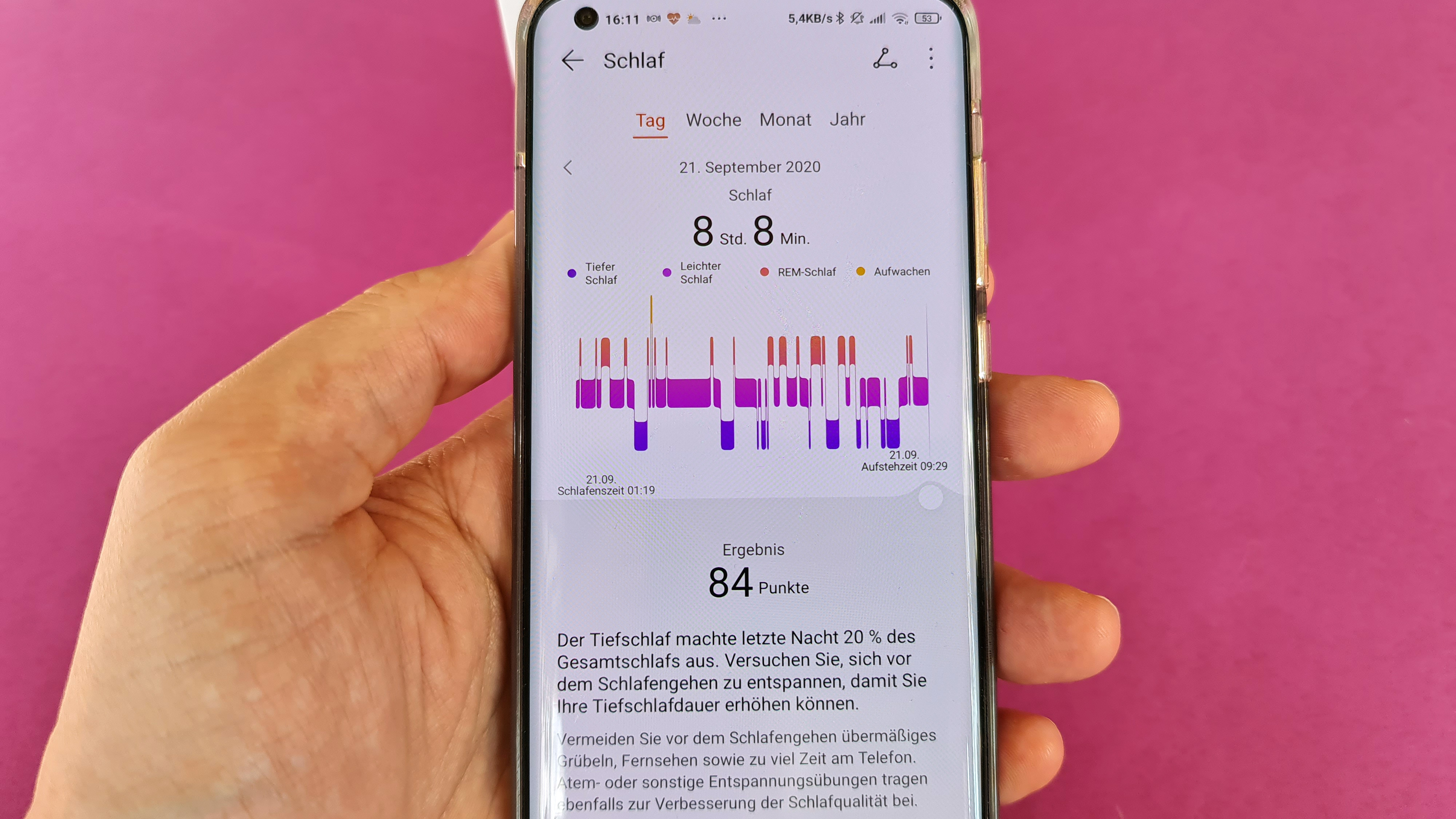 Das gilt auch für das Schlaftracking der Uhr. Während wir bei anderen Uhren und Trackern schon grobe Diskrepanzen zwischen tatsächlicher und von der Uhr gemeldeter Schlafzeit feststellen mussten, passten die Ergebnisse der Watch Fit im Test gut. Weitere Angaben zur recht detaillierten Aufzeichnung der Schlafqualität konnten wir nur bedingt nachprüfen, sie passten aber zum Erfrischungsgrad, den die jeweilige Nacht brachte.