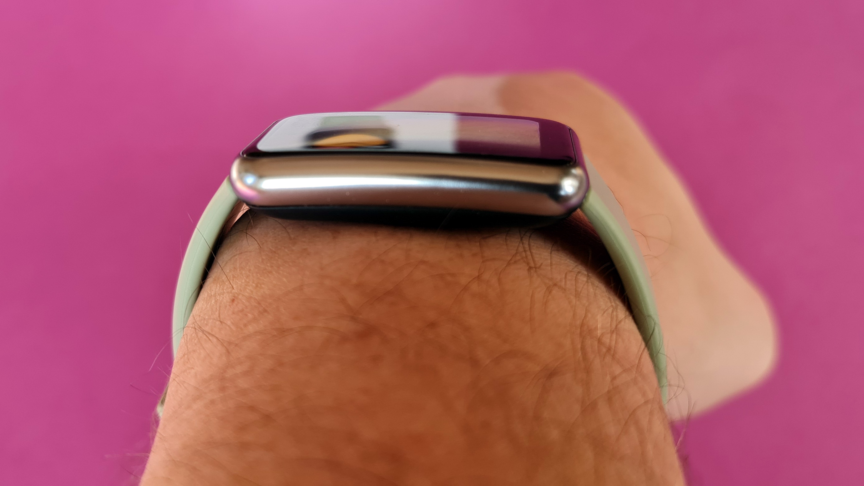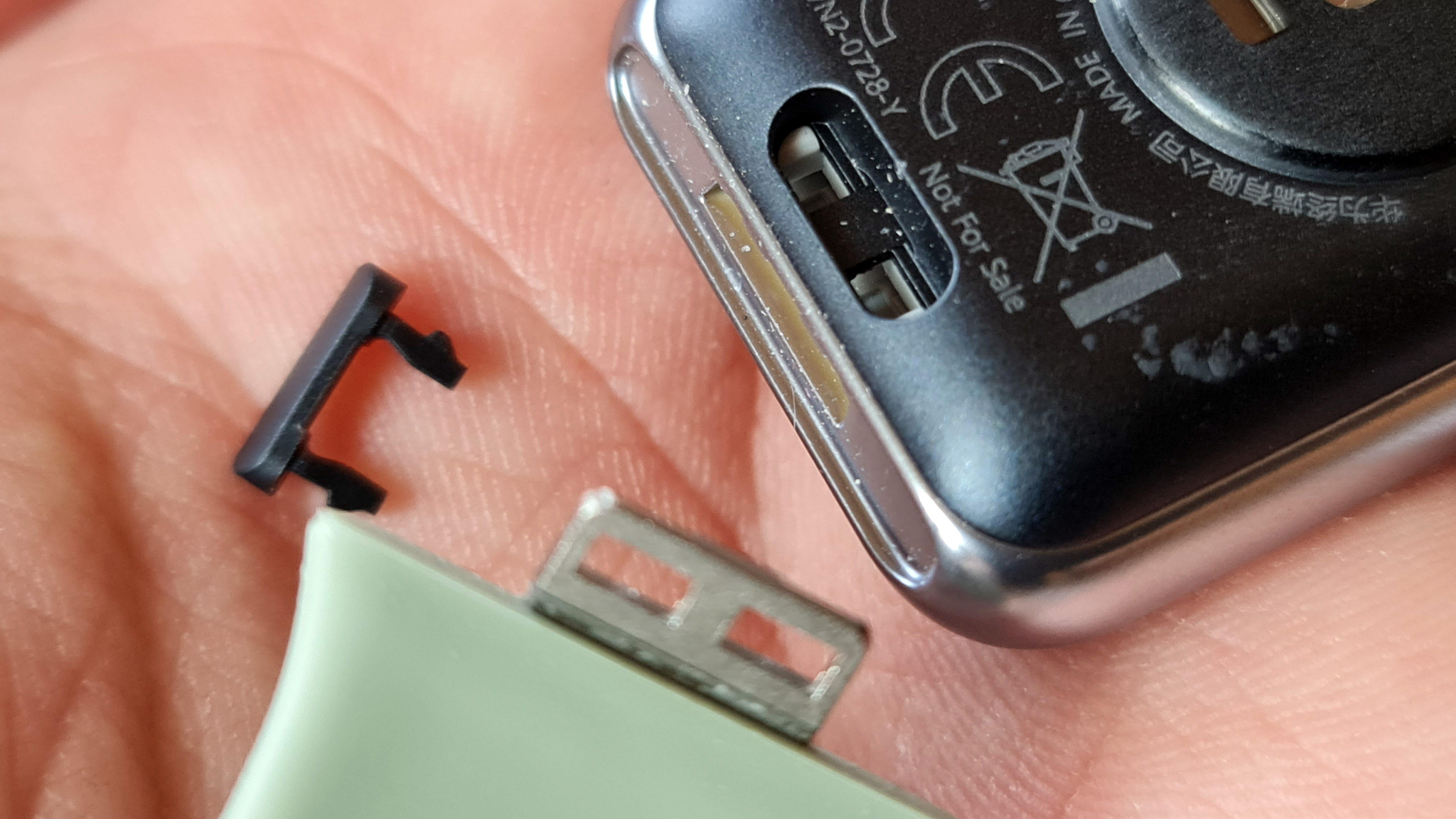 Während die Apple Watch eine längliche Taste und eine schicke Krone für weitere Einstellungs- und Steuerungsoptionen bietet, setzt Huawei ausschließlich auf den sehr ähnlich geformten Druckknopf. Der weist einen sehr gut definierten Druckpunkt auf und wirkt hochwertig. Weiterer Unterschied: Das Armband, das es bei Apple in zahlreichen Varianten, darunter auch aus Metall, gibt, ist bei der Huawei Watch Fit immer aus Silikon. Alternativen zu den in Weiß, Orange, Schwarz und Mintgrün erhältlichen Bändern gibt es derzeitig seitens Huawei nicht und wegen der außergewöhnlichen Befestigungsmethode ist auch kein Wechsel auf Standard-Armbänder von Drittherstellern möglich. Bei der Fit weisen die Bandenden nämlich einen filigranen Haltemechanismus aus Metall auf, der im Inneren der Uhr verschwindet. Dort wird er von einem Kunststoff-Clip gehalten, der nur in die Uhr gesteckt ist und sich ausschließlich mit einem spitzen Werkzeug entfernen lässt. Das erlaubt zwar ein Design, bei dem die Armbänder direkt in das Uhrengehäuse übergehen, sonderlich hochwertig wirkt das aber nicht und auch beim Thema Langlebigkeit kommen Zweifel auf. Denn gerade bei sportlicher Aktivität bleibt man schon mal an der Uhr hängen und dann dürften die filigranen Kunststoff-Nupsis (definitiv ein Fachausdruck!) schnell brechen.