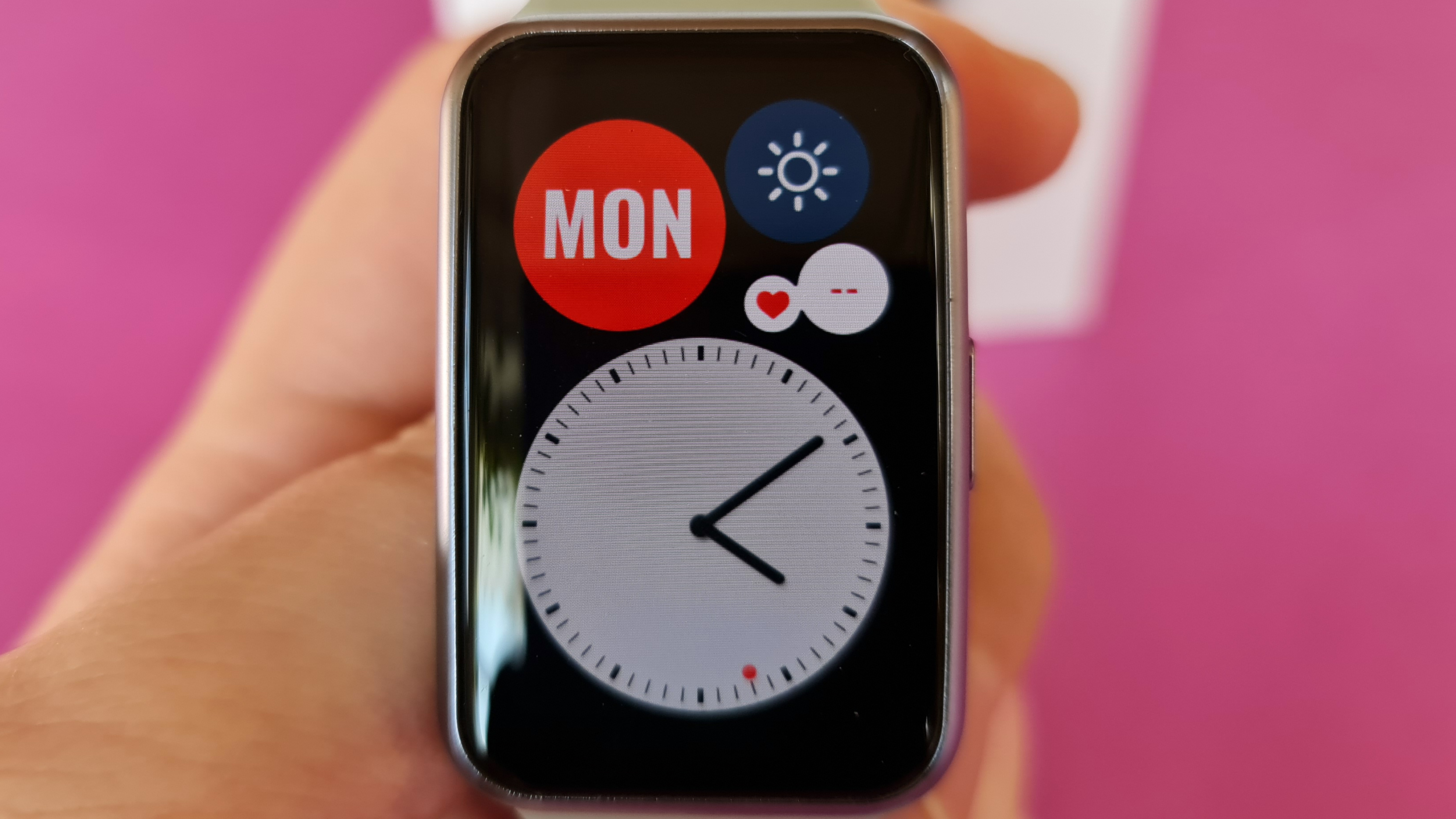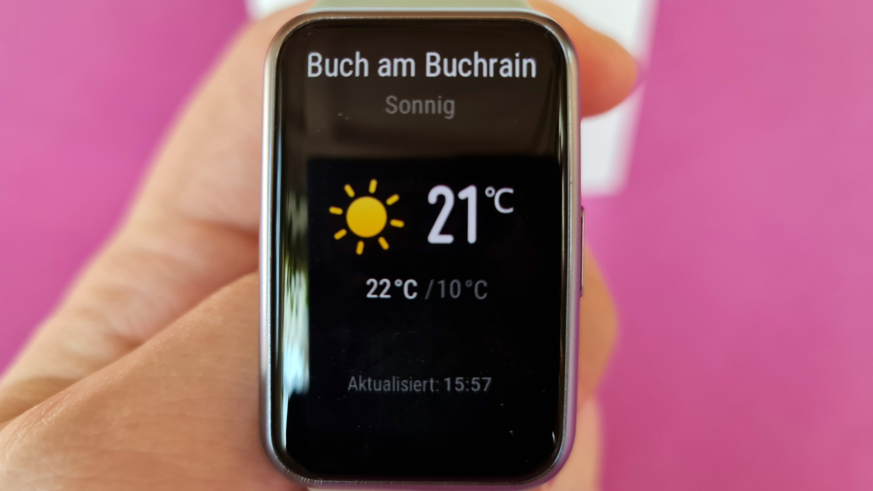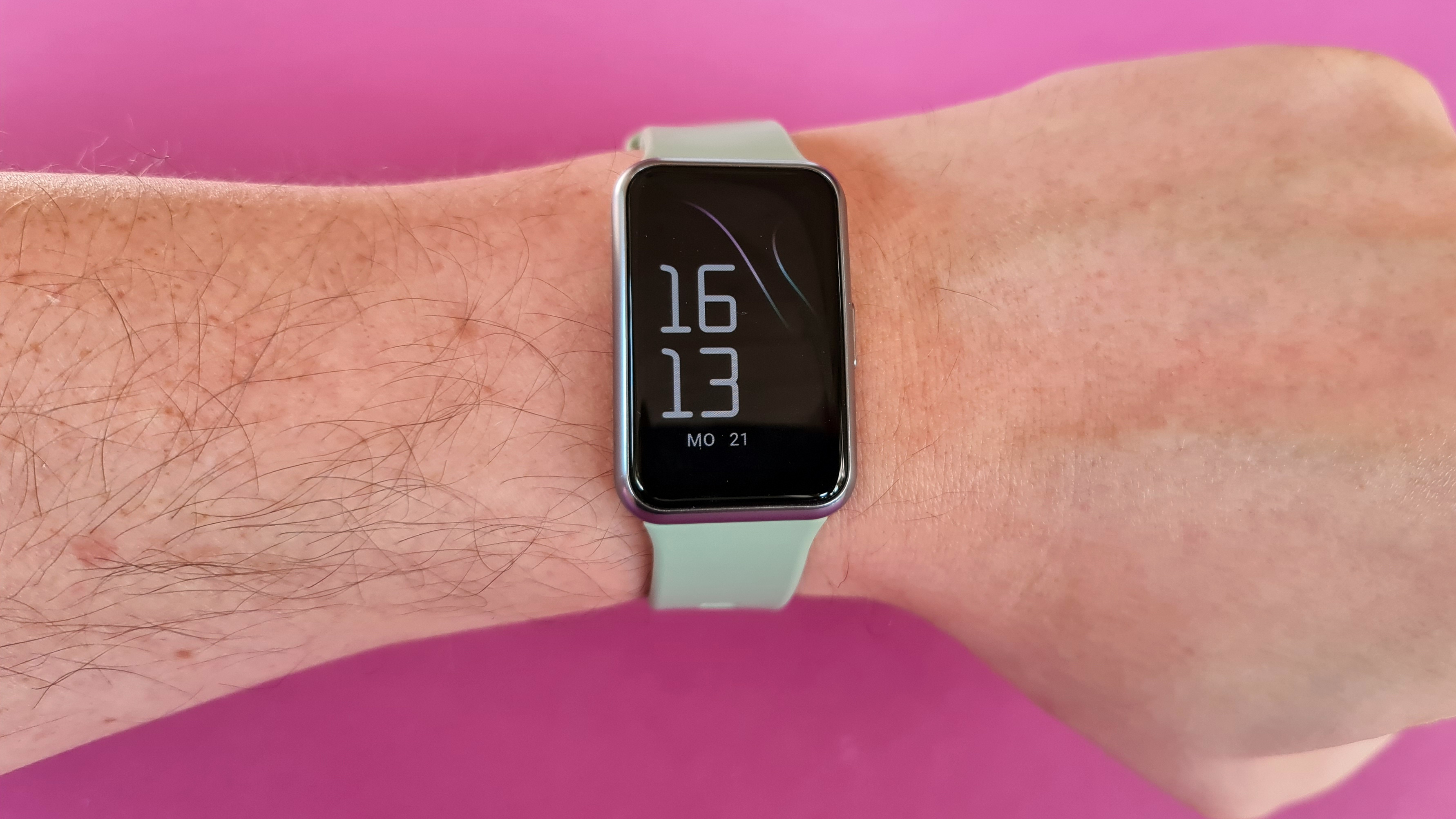Huawei setzt wie bei seinen teureren Smartwatches auf OLED als Display-Technologie. In der Watch Fit bietet der Screen 1,64 Zoll Diagonale bei einer Auflösung von 456 × 280 Pixel. Das entspricht einer Bildschärfe von rund 326 Pixel pro Zoll, einzelne Bildpunkte sehen Nutzer daher nicht. Wegen der Verwendung von OLED mit typischem perfektem Schwarzwert ist der gut 1,5 Millimeter breite Rand zwischen Darstellungsfläche und silber eingefärbtem Rahmen nur bei bestimmten Watchfaces zu sehen, normalerweise scheint der Screen direkt bis an den Rahmen heranzureichen. Das unterstreicht den recht hochwertigen Eindruck der Uhr.