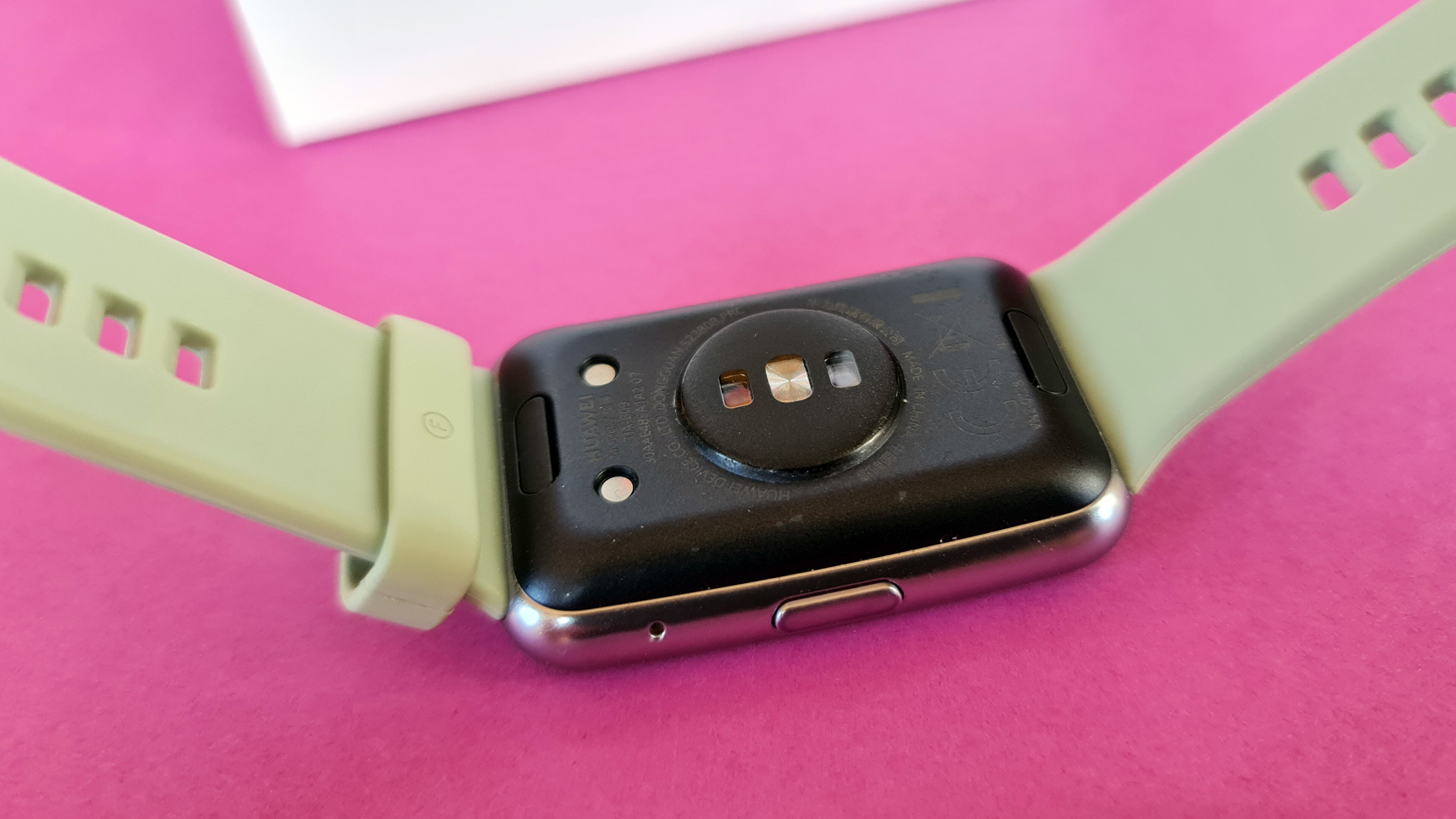 Ansonsten gefällt die Huawei Watch Fit. Sie wiegt gerade einmal 21 Gramm (mit Armband rund 35 Gramm), ist nicht ganz 11 Millimeter dick und sieht auf den ersten Blick sehr hochwertig aus. Das liegt unter anderem am gewölbten Display, wodurch die Uhrenform leicht der natürlichen Rundung des Handgelenks folgt. Zum Rahmen hin belässt es Huawei bei leichter 2,5D-abrundung, was ebenfalls schick aussieht. Die Rückseite aus Kunststoff passt zum sportlichen Auftritt der Uhr, das ist auch bei der Huawei Watch GT 2 (Testbericht) nicht anders, die ansonsten mit Metallgehäuse zum Kunden kommt. Die Größe von 46 × 30 Millimeter macht die Fit aber im Gegensatz zur runden Huawei-Smartwatch auch für schmale Frauen-Handgelenke zum optimalen Accessoire. Die Wasserdichtigkeit wird hier mit 5 ATM angegeben, dauerhafte Funktionalität der Uhr bei Schwimmen und Tauchen ist damit also nicht gewährleistet. Unter der Dusche nimmt die Uhr hingegen keinen Schaden.