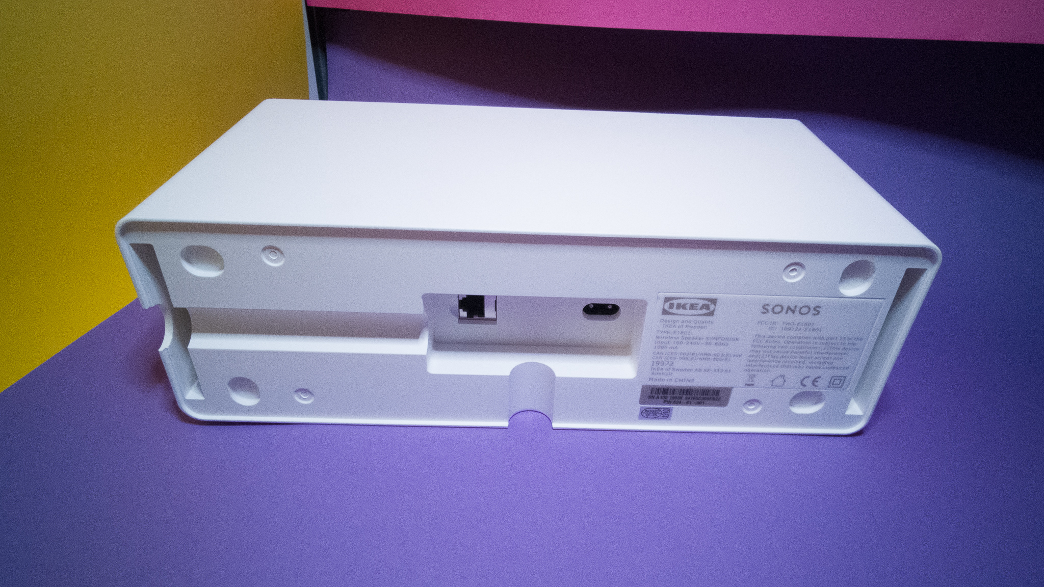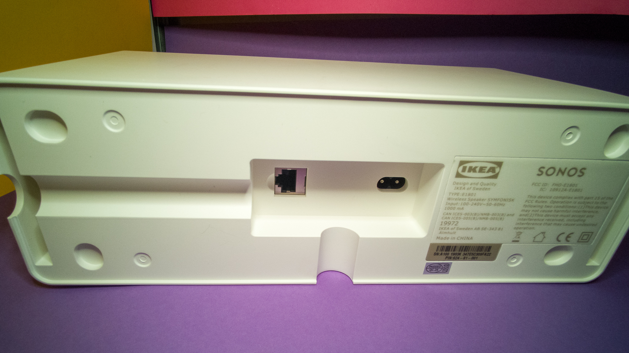 Der Ikea Symfonsik ist ein Quader mit 10 × 31 × 15 cm Seitenlänge. Damit passt er hochkant in ein Billy-Regal, sicher kein Zufall. Ansonsten erinnert er an ein Küchenradio, das unter einem Regal festgemacht ist. Der Lautsprecher lässt sich liegend oder hochkant betreiben. Um ihn an die Wand zu hängen, gibt es ein separat erhältliches Aufhängesystem, mit dem der Lautsprecher zusätzlich zu einer Ablage wird. Bis zu 3 kg kann man dann darauf ablegen. Hinten ist ein Strom- und LAN-Anschluss, wobei der Symfonisk wie jeder Sonos-Lautsprecher auch WLAN beherrscht.