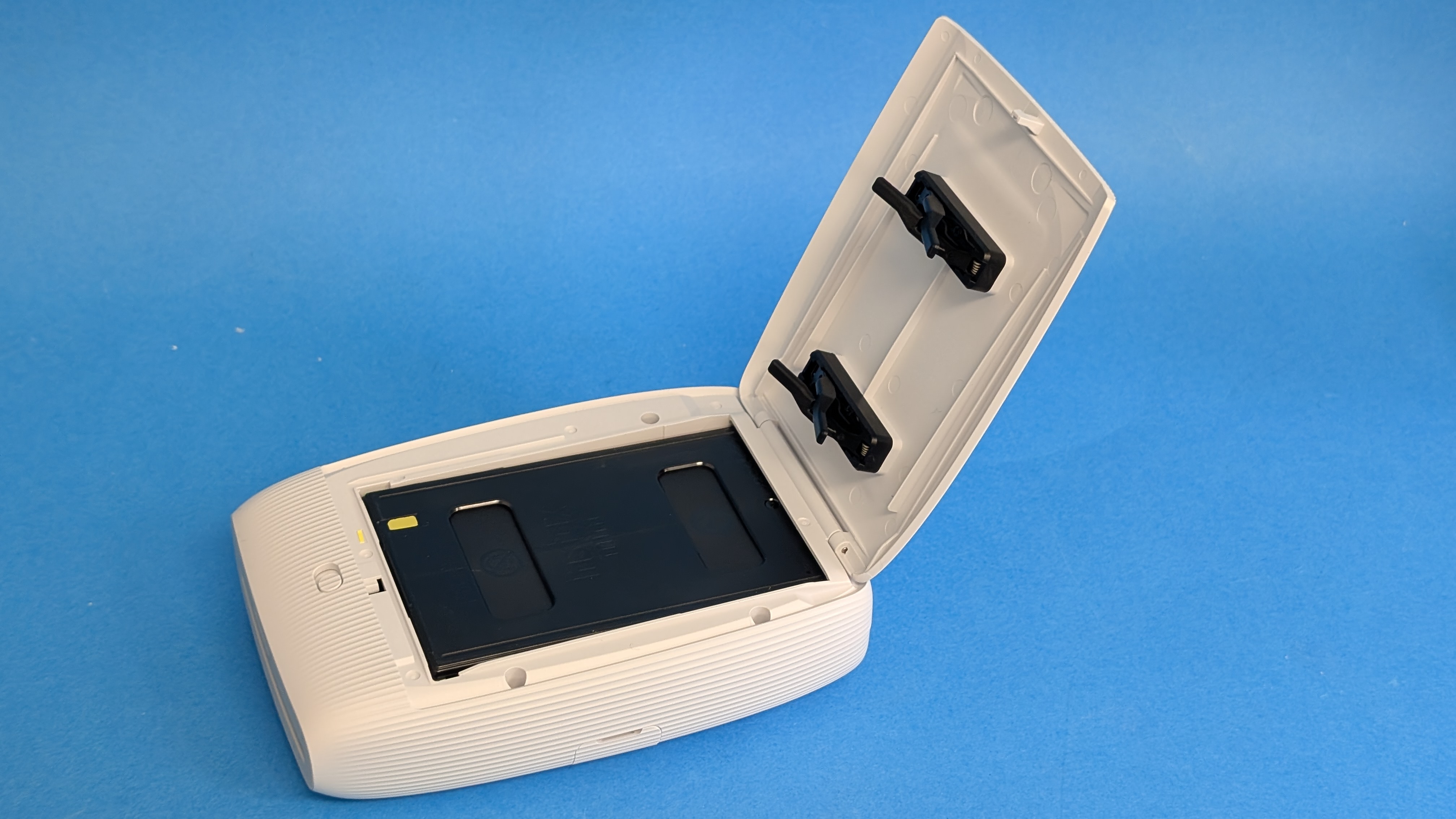 An der Unterseite befindet sich ein Schiebeschalter, mit dem sich das Fotofach öffnen lässt. Hier muss man beim Einlegen der lichtempfindlichen Fotokassette aufpassen. Kommt Licht an das Fotopapier, sind die Bilder unbrauchbar.