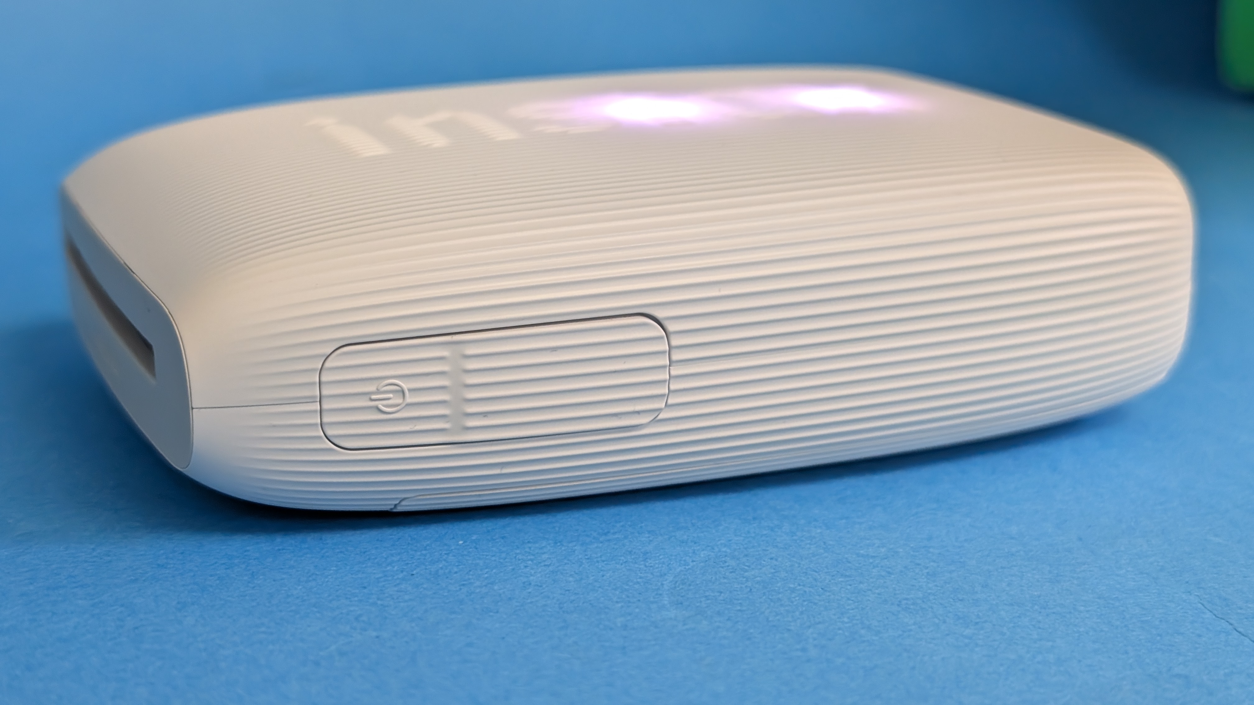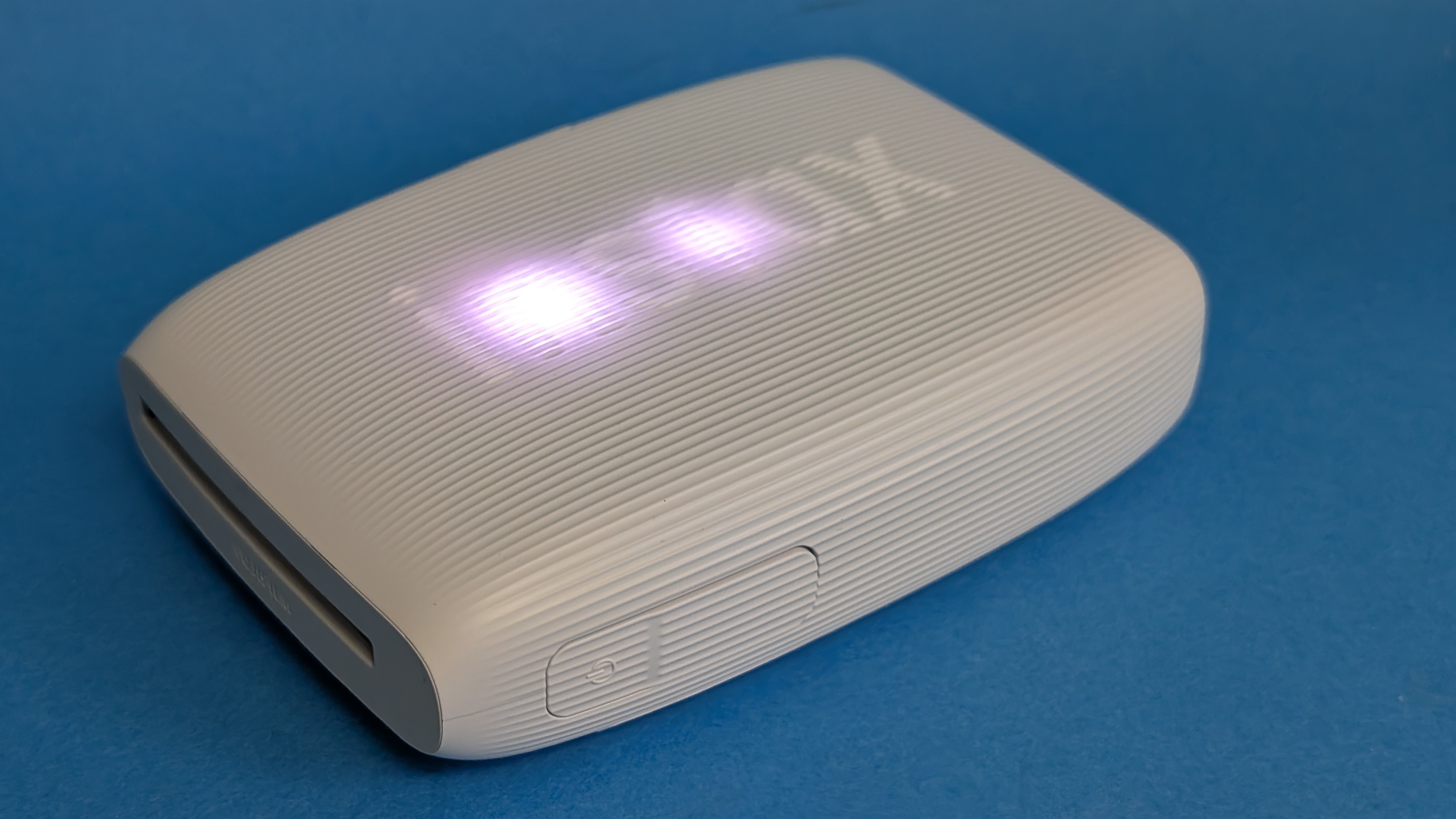 Fujifilm bietet den Mini-Drucker in den Farben Weiß, Hellgrün und Rosa an. Die komplette Oberfläche ist angenehm geriffelt, sodass der Instax Mini Link 3 stets griffig in der Hand liegt. Auf der Vorderseite prangt der große und leicht erhabene Instax-Schriftzug. Dahinter verbergen sich drei LEDs, die durch die Kunststoffhülle scheinen und Informationen wie einen niedrigen Akkustand anzeigen.