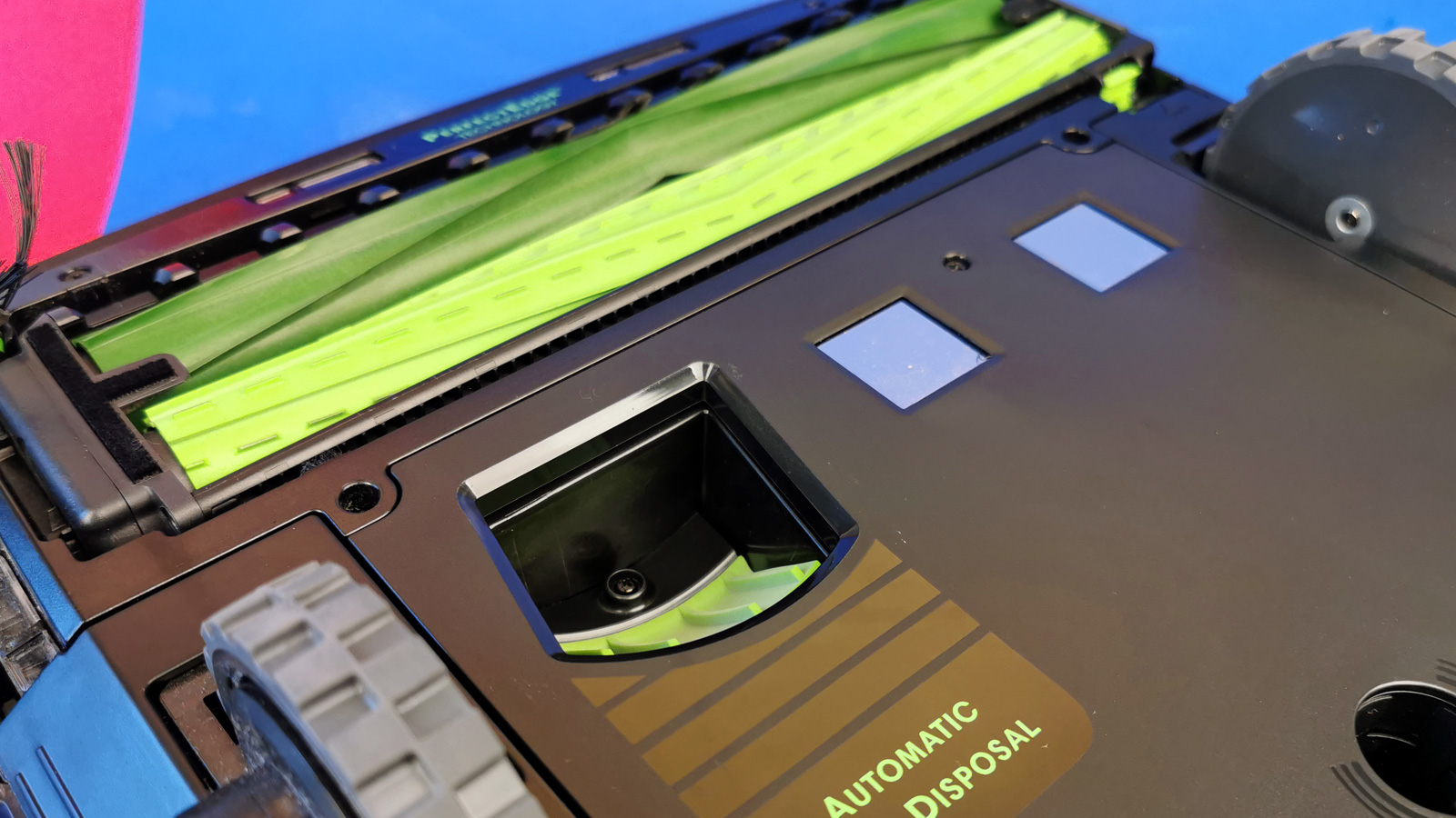 Ansonsten setzt der Hersteller auf elegantes Äußeres mit einer Mischung aus glänzenden und matten Oberflächen, zudem auf hervorragende Verarbeitung. Beides gehört zum Besten was man derzeit bei Saugrobotern finden kann – für 1500 Euro darf man das aber auch erwarten. Insgesamt gibt es an dem 31,6 × 31,2 × 8,7cm großen Gerät nichts zu meckern. Bemerkenswert ist die niedrige Bauhöhe des 4,2 Kilo schweren Modells. iRobot erreicht die durch einen Verzicht auf Laser-Navigation, ein entsprechendes Türmchen oben auf dem Roboter entfällt somit. Stattdessen tastet eine nach schräg vorn oben gerichteter Kamera die Übergänge von Wänden zu Decken ab, um sich ein Bild von seiner Umgebung zu machen. Dazu setzt der Hersteller auf seine Cslam genannte Kameratechnik, der Roboter tastet nach Angaben des Herstellers sein Umfeld ständig mit 230.400 Datenpunkten ab. Auf der Oberseite des Gerätes befinden sich ansonsten vorn noch drei Knöpfe für Starten, Beenden und Spot-Reinigung, der vordere Bereich ist wie bei jedem Sauger als Bumper ausgelegt, der als letzte Absicherung beim Auffahren auf Hindernisse den Vorwärtsdrang des Bots stoppt.