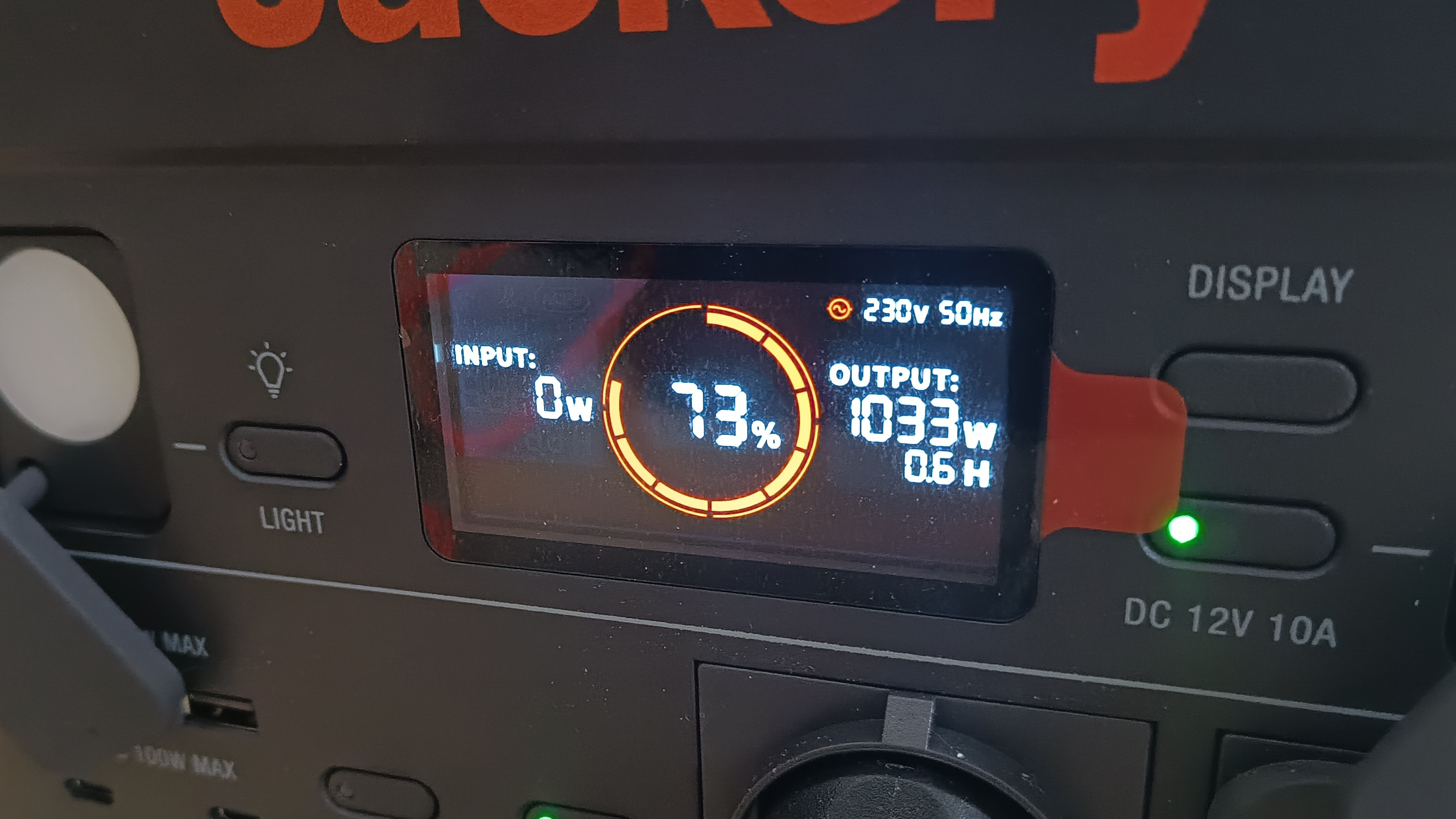 Moderate Verbraucher wie Ladegeräte, Kühlboxen, Eiswürfelmaschine, PC-Arbeitsplatz, Bohrhammer oder Rasentrimmer, sowie diverse Lampen und Strahler stellen kein Problem für den Solargenerator dar. Auch stärkere Verbraucher wie Säbelsäge, Rasentrimmer oder Toaster konnten wir im Test problemlos versorgen. Selbst unser Wasserkocher mit angeblich 1800 Watt arbeitet ordnungsgemäß. Laut Anzeige fallen hier aber tatsächlich nur 1600 Watt an. Bei höherem Leistungsbedarf, etwa mit unserer Kappsäge, deren Anlaufstrom bei fast 3500 Watt liegt, schaltet die Powerstation umgehend die 230-V-Ausgänge ab und zeigt eine kleine Warnung im Display. In den Tests hat das zuverlässig funktioniert.