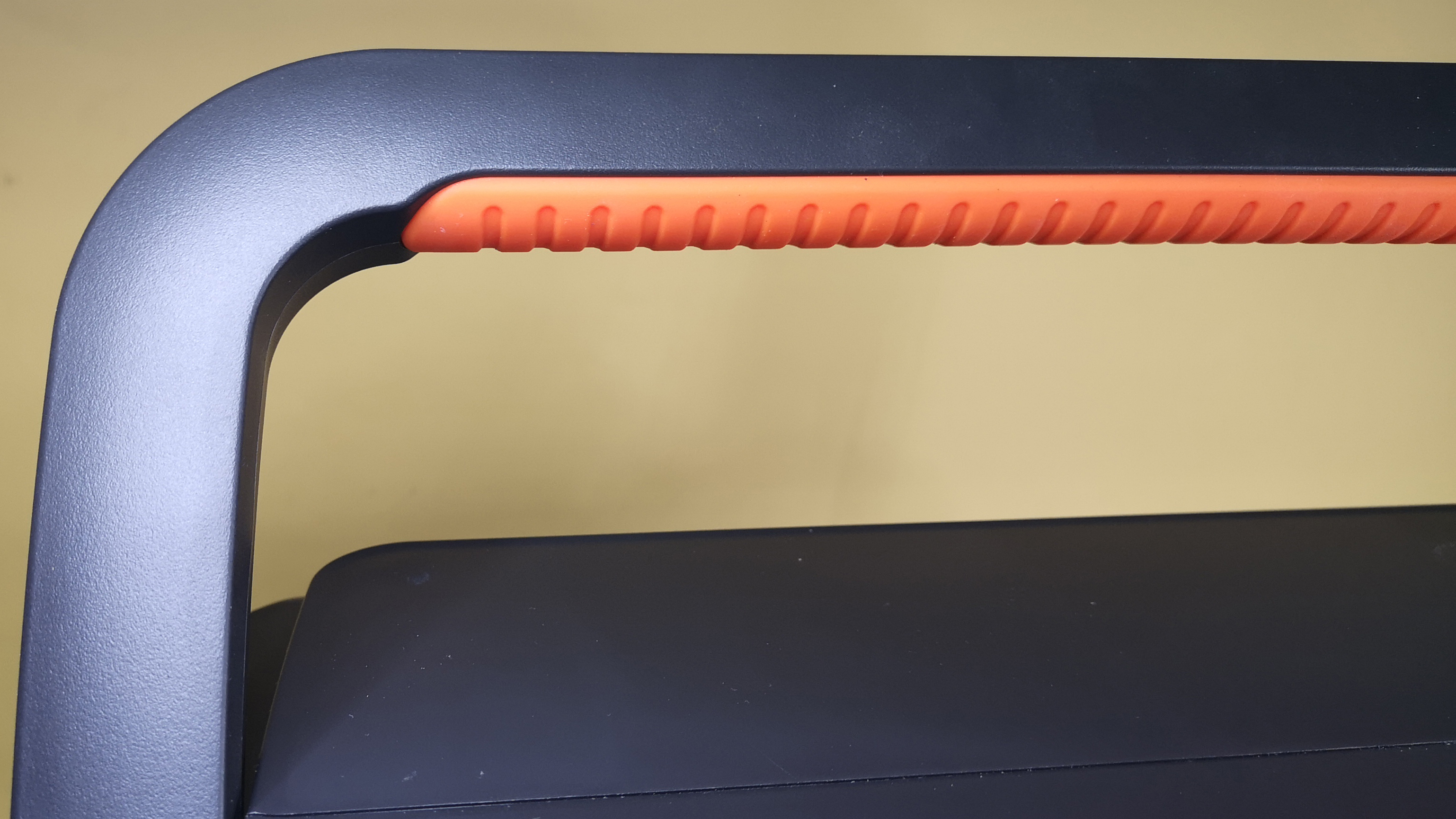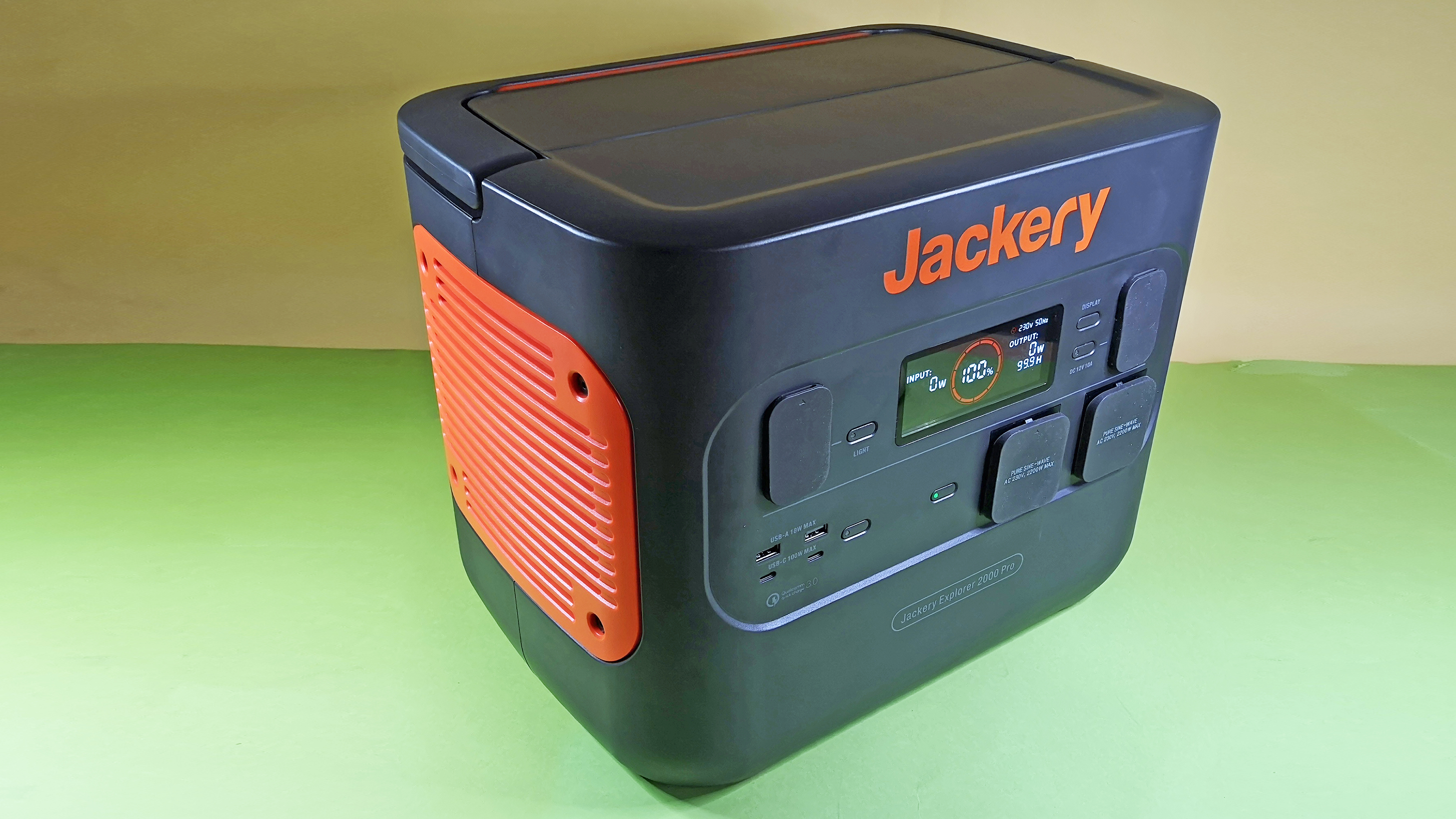 Die zum Explorer 2000 Pro ist mit Abmessungen von 38 x 27 x 31 cm und einem Gewicht von 19,5 kg die mit Abstand größte und schwerste Powerstation, die wir bisher in der Redaktion hatten. Zwar verfügt das Modell über einen klappbaren und weich gepolsterten Handgriff, über allen zu langen Strecken tragen, möchte man das schwere Gerät trotzdem nicht. Dank der Klappfunktion geht der Griff nicht im Weg, um und es ist möglich andere Dinge auf dem Gau-Orangen-Kunststoffgehäuse abzustellen. Der Solargenerator hat ein funktionales und schlichtes Design und ist hochwertig verarbeitet. Durch die Farbwahl wirkt die Explorer-Serie trotzdem weniger edel als etwa die Modelle des Herstellers Ecoflow.