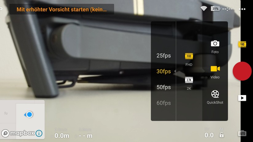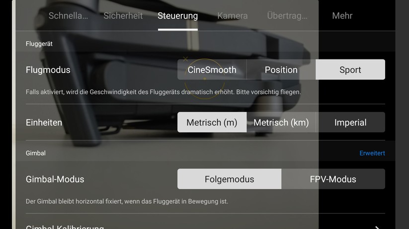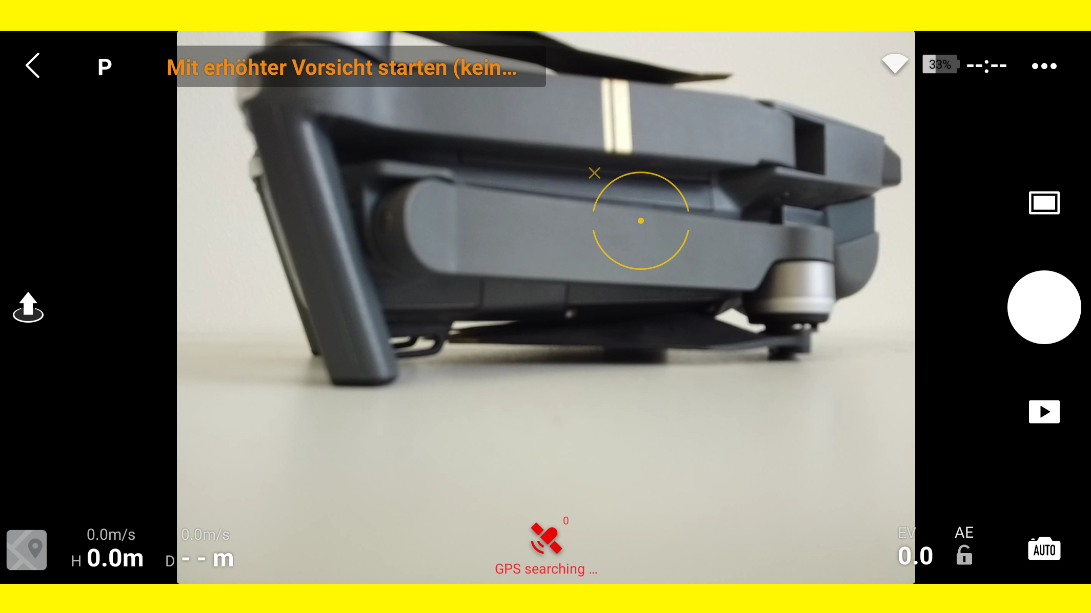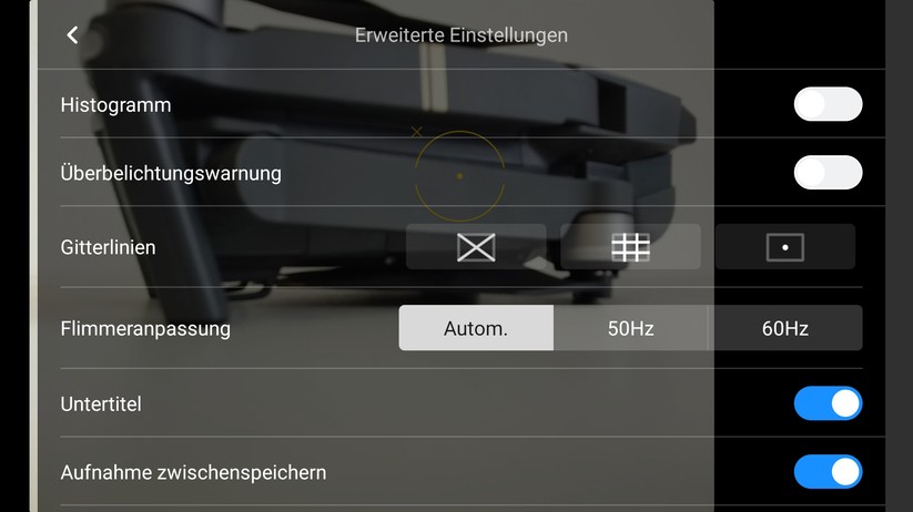 Bei Bedarf können die Aufnahmeparameter, wie Belichtungszeit oder ISO-Wert, auch manuell eingestellt werden. Das RAW-Format für Fotos steht bei der Mavic Mini im Gegensatz zu ihren größeren Geschwistern allerdings nicht zur Verfügung.