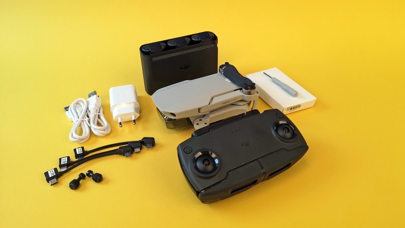 Zum Lieferumfang der Mavic Mini gehören die Drohne samt Akku, USB-Netzteil, Handsender, ein Satz Ersatzpropeller und alle benötigten Anschlusskabel.