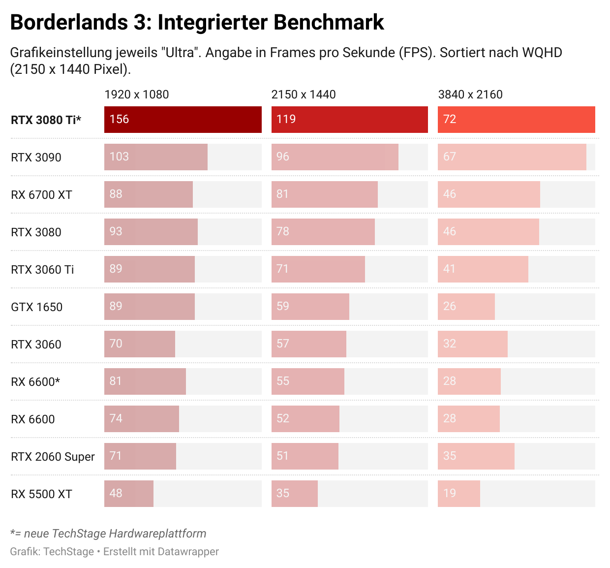 Im Timespy Benchmark schaffte die RX 6600 knapp 1000 Punkte mehr, bei TimeSpy Extreme war das neue System 350 Punkte schneller. Man sieht hier gut, wie ein aktuelleres System selbst langsamere GPUs beschleunigen kann. Im Gaming-Benchmark von Borderlands 3 ist der Abstand allerdings geringer. Bei Full-HD kann das neue System knapp 7 fps herausholen, bei WQHD sind es noch 3 FPS und bei UHD sind die Benchmarks gleich auf. Die Tests sind also grundsätzlich noch vergleichbar, wir gehen davon aus, dass alle bisherigen Karten auf dem neuen Testsystem zumindest etwas schneller sind – sich an der Platzierung insgesamt aber wenig ändert.