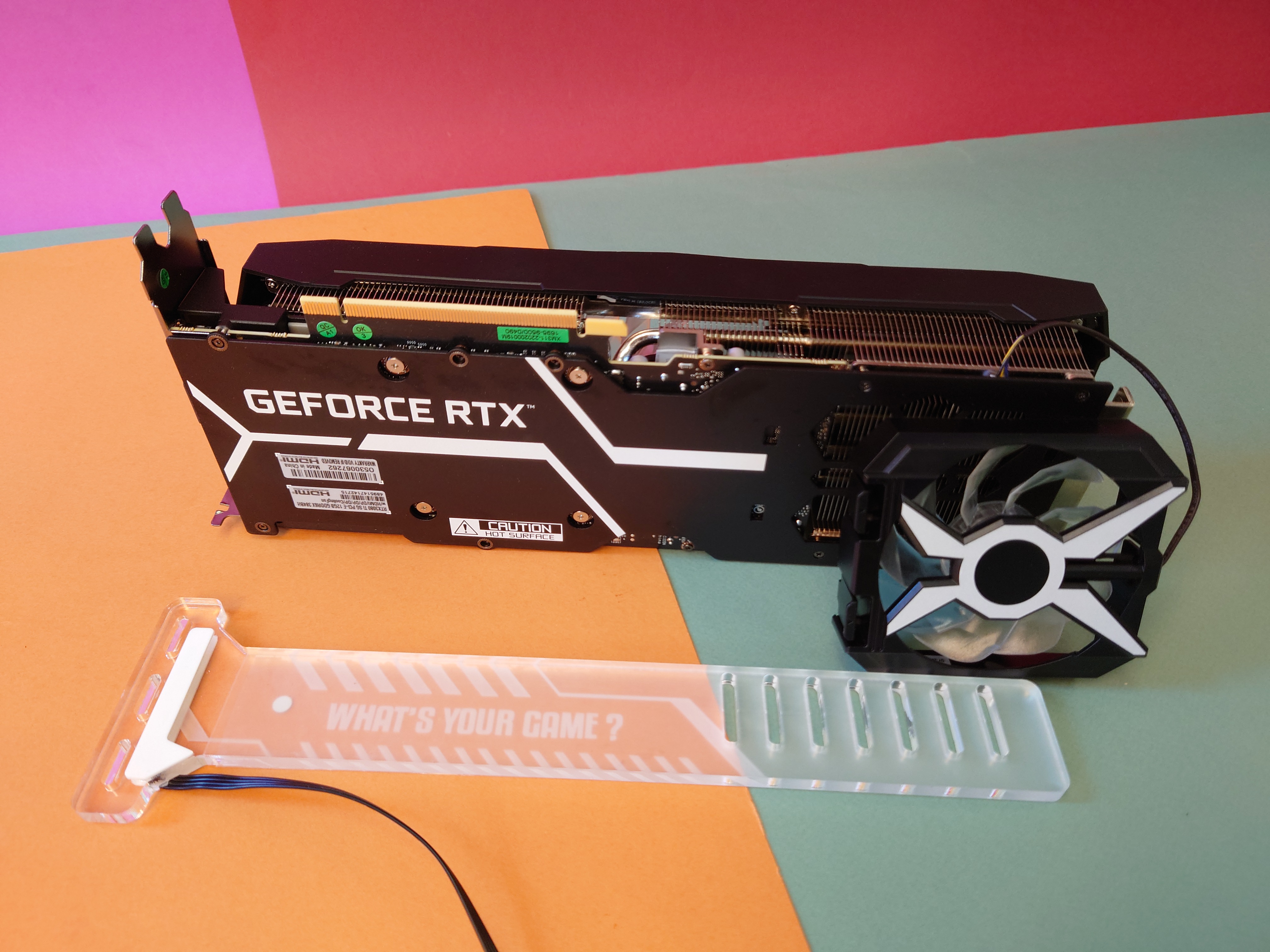 Übrigens liegt im Paket auch ein GPU-Halter, mit dem man die Karte von unten gegen Absacken abstützen kann. Damit entlastet man den PCIe-Port auf dem Mainboard enorm (und außerdem kann man die Halterung gleich noch beleuchten!)