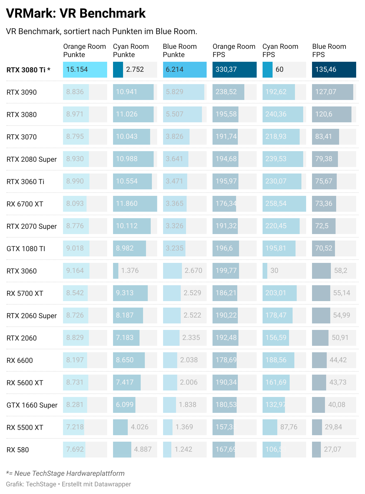 Um es kurz zu machen: Die neue KFA2 RTX 3080 Ti ist ein Leistungsmonster. Selten hatten wir eine Grafikkarte, die unsere Benchmarks derart souverän geschluckt hat und dabei so flüssig lief. Wir hatten nur ein seltsames Verhalten: Im VR Mark, einem Test für die VR-Tauglichkeit der Karte, lieferte sie in einem Benchmark, dem Cyan Room, unerwartet schlechte Ergebnisse. Im Orange Room (weniger anspruchsvoll) und dem Blue Room (deutlich anspruchsvoller) zeigte sie dagegen die erwarteten guten Daten. Wir hatten den gleichen Fehler bei der RTX 3060, irgendwie scheinen sich die GPUs und dieser Teil des Benchmarks nicht zu vertragen. VR-Spiele laufen in der Praxis problemlos.