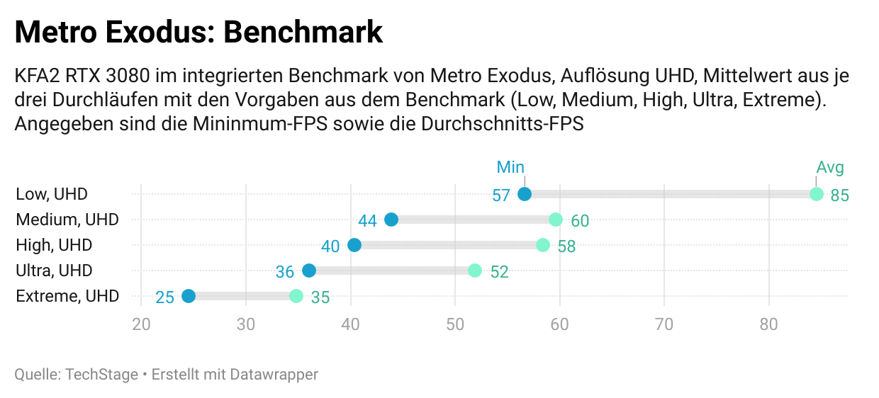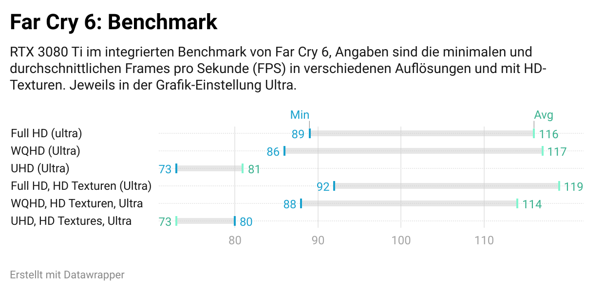 Ähnlich gut sieht es bei den Spiele-Benchmarks aus. Borderlands 3 lief selbst in 4K-Auflösung, mit allen Einstellungen auf Ultra mit über 70 fps durchschnittlich. Das Gleiche gilt für Far Cry 6. Selbst mit den HD-Texturen, UHD-Auflösung und Ultra-Einstellungen fiel der Benchmark nicht unter 68 fps. Einzig Metro Exodus in UHD-Auflösung und Extreme-Einstellungen bringt die RTX 3080 Ti auf knapp unter 25 fps. Das sind sensationelle Ergebnisse, die jedes Gamer-Herz höher schlagen lassen dürften.