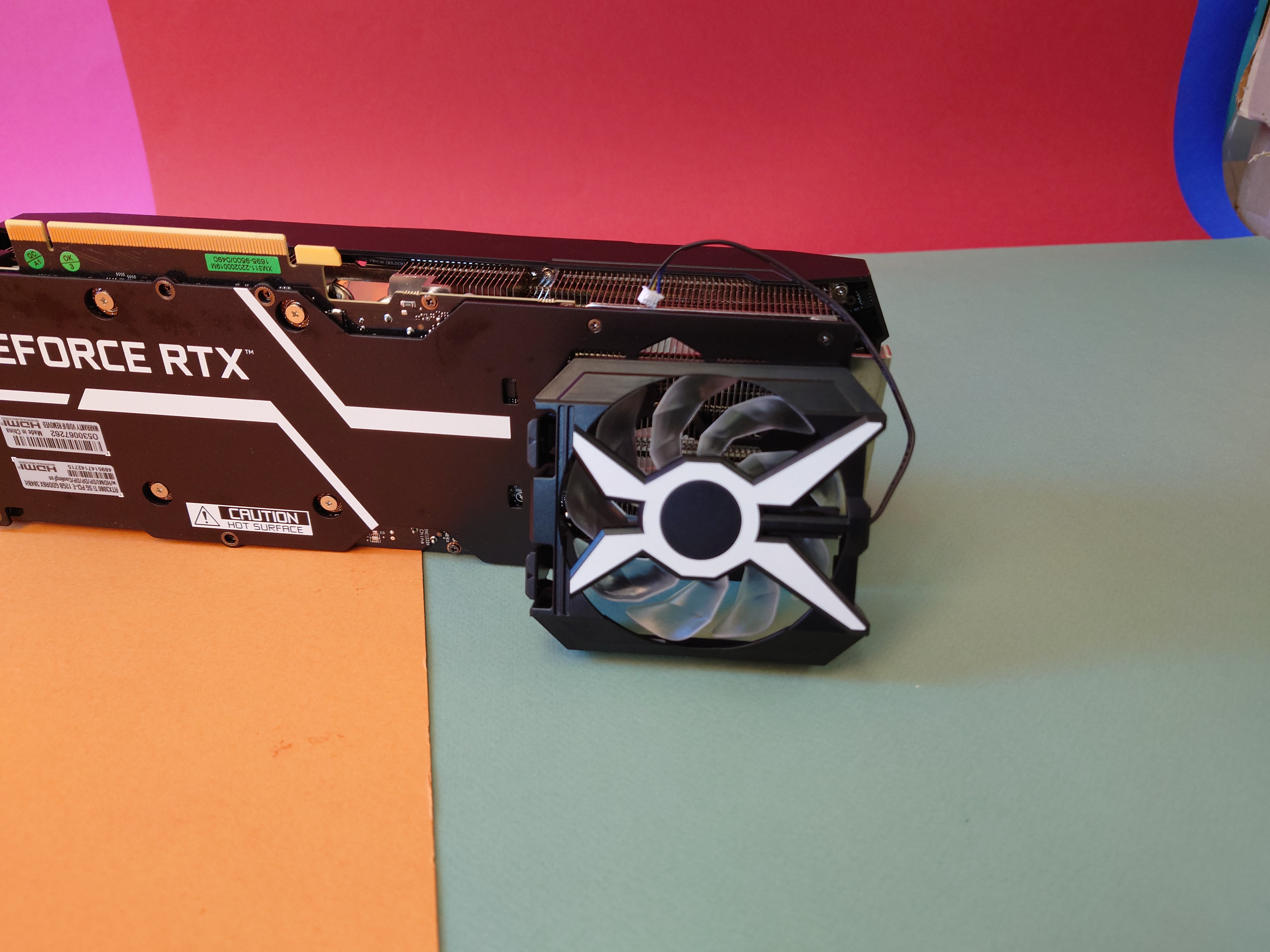 Gut gefällt uns, dass KFA2 einen optionalen ansteckbaren Ventilator für die Rückseite mitliefert. In unserem System ragte allerdings der Arbeitsspeicher zu weit heraus, so dass sich der Lüfter nicht anbringen ließ. Da aber sowohl die Aussparungen auf der Rückseite als auch ein Vier-Pin-Anschluss an der Grafikkarte vorhanden sind, kann man mit etwas Bastelei den Luftstrom so deutlich besser in den Griff bekommen. Bravo, KFA2, das ist eine sinnvolle Erweiterung für Bastler.