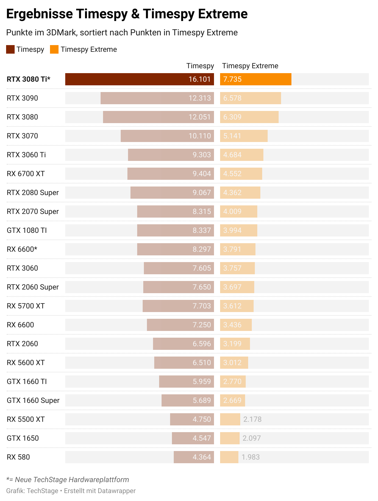 Im Timespy und Timespy Extreme, beide messen die Spieltauglichkeit des kompletten Systems, deklassierte sie alle bisherigen Grafikkarten. Sie dürfte damit in einem modernen System locker auf dem Level einer RTX 3090 liegen, die etwa 300 Euro mehr kostet.