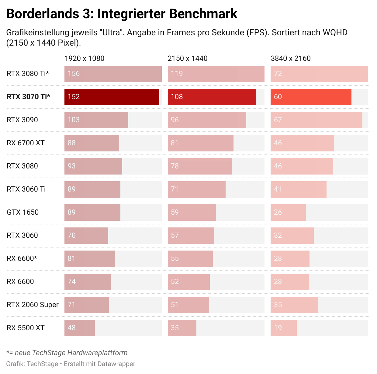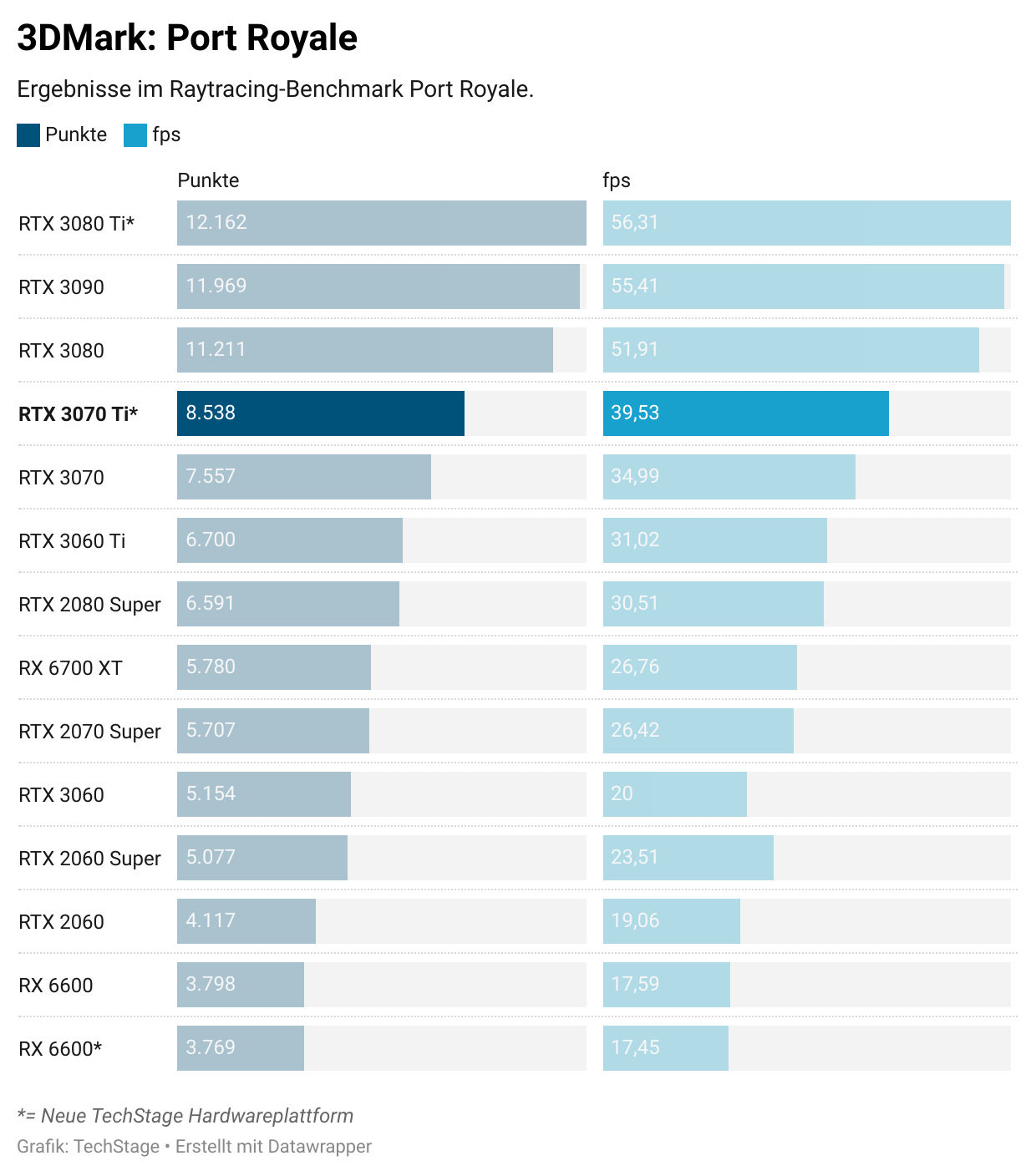 Sprich, wer eine RTX 3070 Ti nutzen möchte, der sollte ein potentes Netzteil einplanen. Dazu empfehlen wir dringend ein Mainboard mit mindestens PCIe 4.0 im x16-Slot. Denn wir haben bei den Tests der RTX 3070 bereits klar gesehen, dass langsamere PCI Express Anschlüsse hier drosseln – das kostet Leistung. Die neue KFA2 RTX 3070 Ti haben wir deswegen in der neuen Version unserer TechStage Testplattform getestet. Dank PCI Express 5.0 haben wir hier keinen Flaschenhals zu befürchten. Details zum neuen System sind im Test zu KFA2 RTX 3080 Ti zu finden. Aufgrund des Wechsels der Plattform sind die Daten nur bedingt mit den älteren Grafikkarten zu vergleichen, wir markieren die neuen Tests in den Grafiken mit einem Stern.