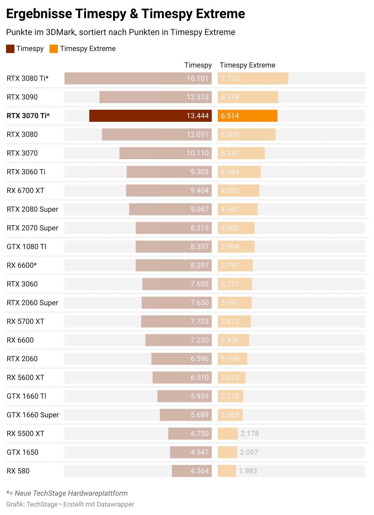Wenig überraschend reiht sich die RTX 3070 Ti brav hinter der RTX 3080 Ti am oberen Ende unseres Testfelds ein. Das sieht man bei den synthetischen Benchmarks aus dem 3D Mark sehr gut. Die RTX 3080 Ti bleibt unser Leistungsmonster, die RTX 3070 Ti schleicht sich sogar an eine RTX 3090 heran – wobei Letztere durch unser altes Testsystem massiv ausgebremst wurde.