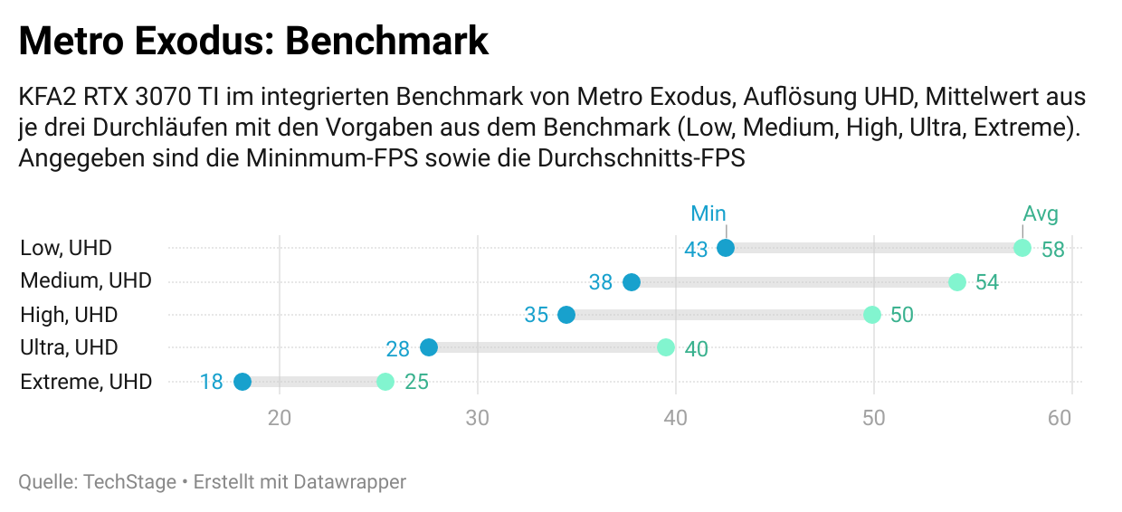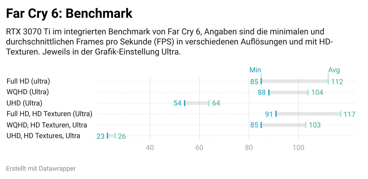 Die Leistung der KFA2 RTX 3070 Ti und anderen GPUs der Baureihe überraschte uns. Full-HD-Gaming ist damit mit hohen FPS-Zahlen möglich, auch bei WQHD-Auflösungen bekommt man ordentliche Bildraten mit hohen/sehr hohen Details. Dazu kommt DLSS, was wir bei allen kompatiblen Spielen empfehlen würden.