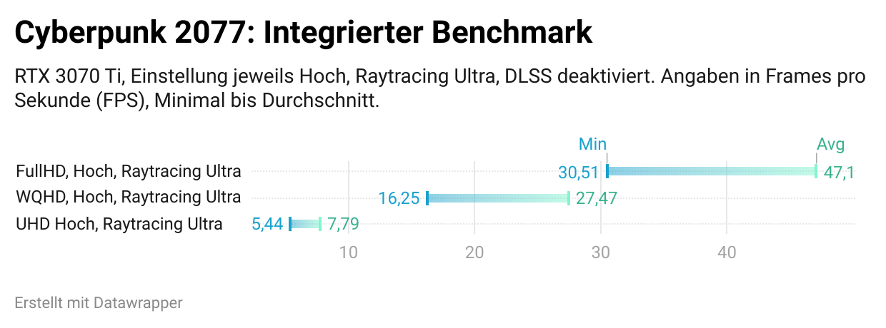 Im Benchmark von Cyberpunk 2077 lag die RTX 3070 Ti mit aktiviertem DLSS bei UHD-Auflösung, hohen Grafikdetails und Ultra Raytracing bei sehr guten 28 bis 41 Bildern pro Sekunde. Ohne DLSS schafft sie diese Bildraten nicht einmal bei WQHD. Kurz erklärt: DLSS rendert Grafikeffekte in einer niedrigeren Auflösung und skaliert diese dann auf die jeweilige Auflösung hoch – Ungenauigkeiten werden von der Grafikkarte quasi live behoben. Das funktioniert vor allem bei Auflösungen zwischen WQHD und UHD sehr gut, darunter merkt man es kaum. Zudem müssen die Spiele die Technik unterstützen.