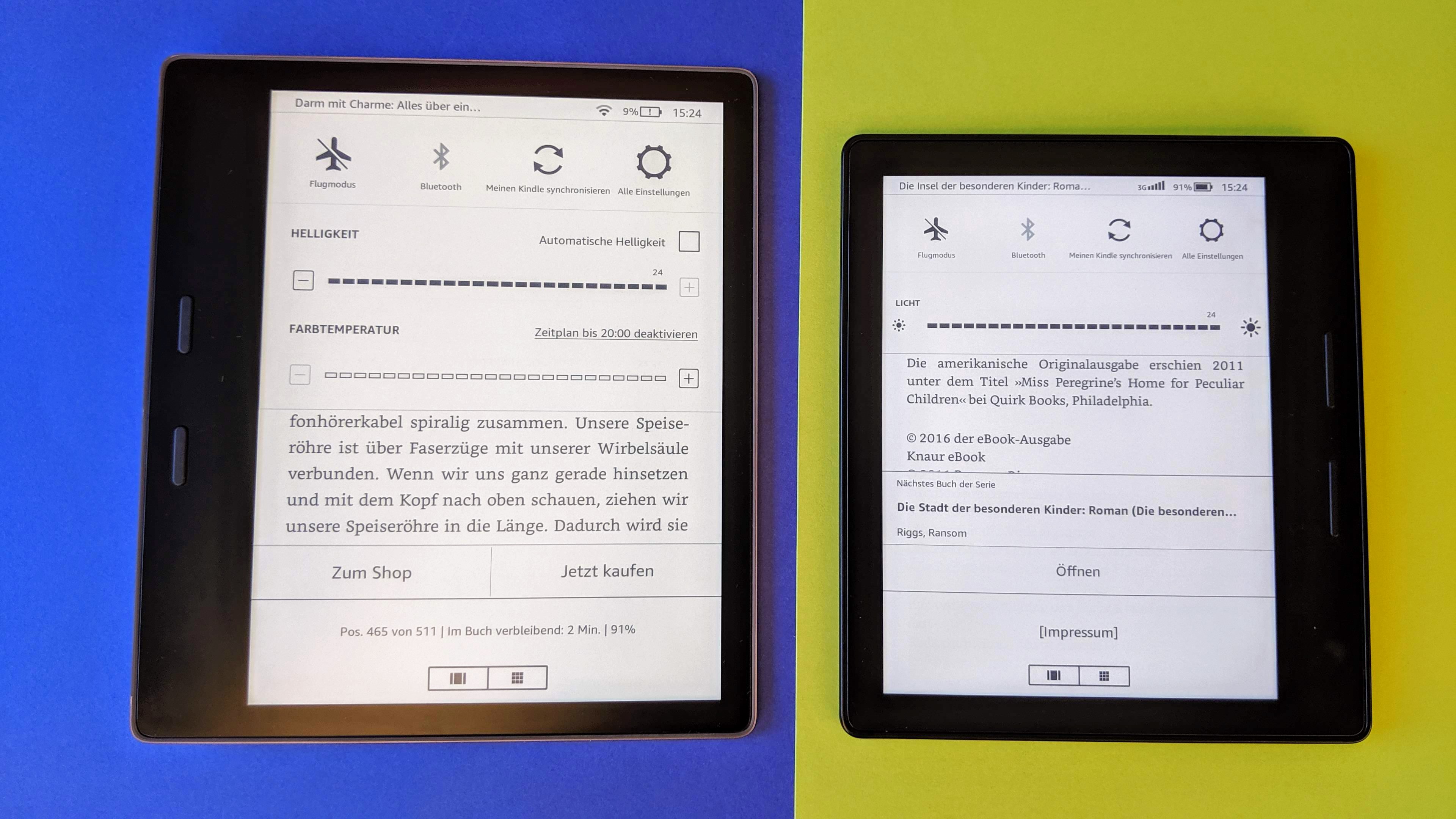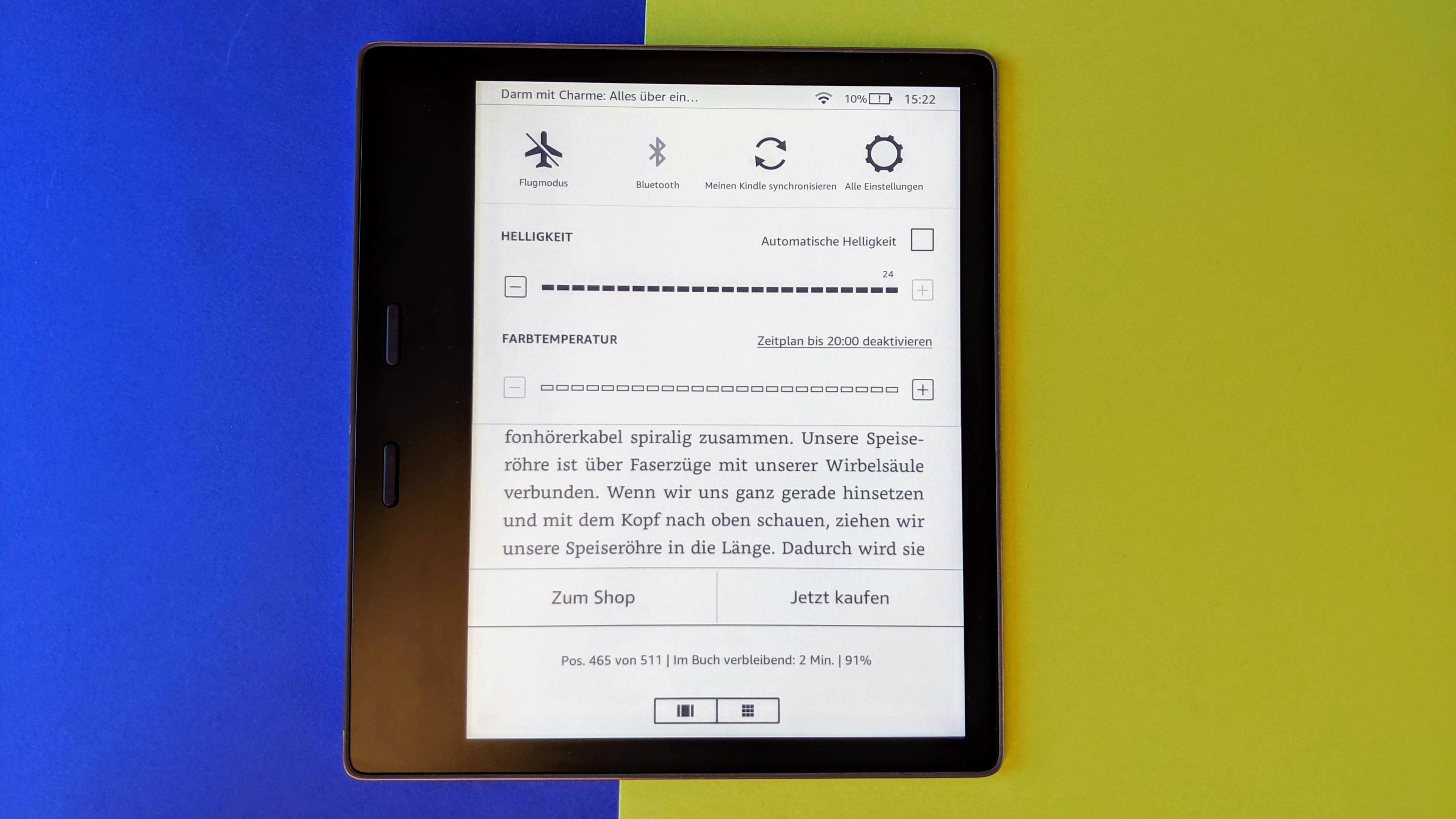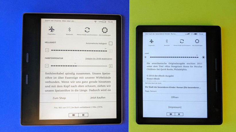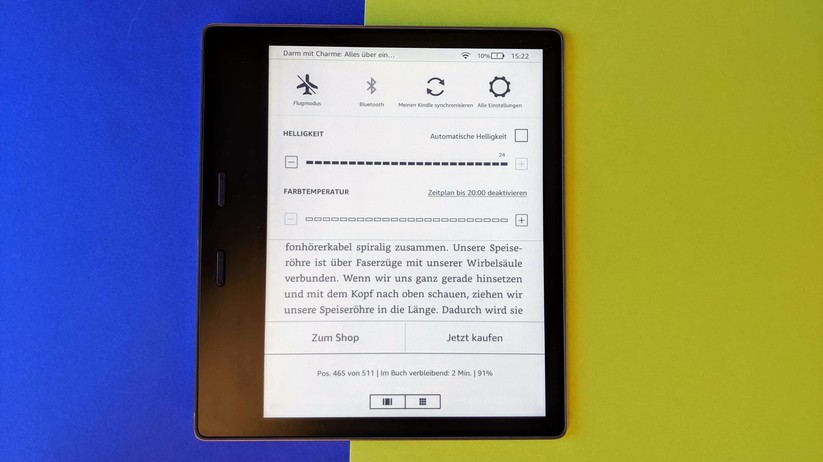 Wirklich neu ist bei Kindle Oasis 2019 das integrierte Nachtlicht. Es verändert die Farbtemperatur der Hintergrundbeleuchtung von kalt auf warm. Die reduzierten Blautöne sollen in den Abendstunden dabei helfen, besser einzuschlafen. Dafür erhöht Amazon die Anzahl der LEDs von 12 auf 25, wobei die Beleuchtung diesmal nicht nur aus blauen, sondern eben aus einer Mischung aus kaltweißen und warmweißen LEDs besteht. Die Ausleuchtung soll damit nicht nur heller, sondern auch gleichmäßiger sein. Leider haben wir den Kindle Oasis aus dem Jahr 2017 nicht in der Redaktion, können dessen Helligkeit also nicht messen und mit dem neuen vergleichen. Aber wir haben den Oasis von 2016 mit 6-Zoll-Display und 10 LEDs. Der kommt auf eine maximale Helligkeit von 150 cd/m². Der neue Oasis schafft bei kaltweißer Beleuchtung maximal 175, bei warmweißer Beleuchtung maximal 138 cd/m². Das ist ein absoluter Spitzenwert. Zum Vergleich: Der Amazon Kindle Paperwhite 2018 (Testbericht) erreicht 108 kalt, der Tolino Shine 3 (Testbericht) 122 kalt & 123 warm und der Pocketbook Touch 3 HD (Testbericht) 92 kalt & 58 cd/m² warm. Die Helligkeit passt der Oasis auf Wunsch über einen Sensor automatische an die Umgebung an. Die Farbtemperatur bestimmt man entweder selbst oder regelt sie über einen automatischen, an den Sonnenauf- und -untergang angepassten, oder manuellen Zeitplan.
