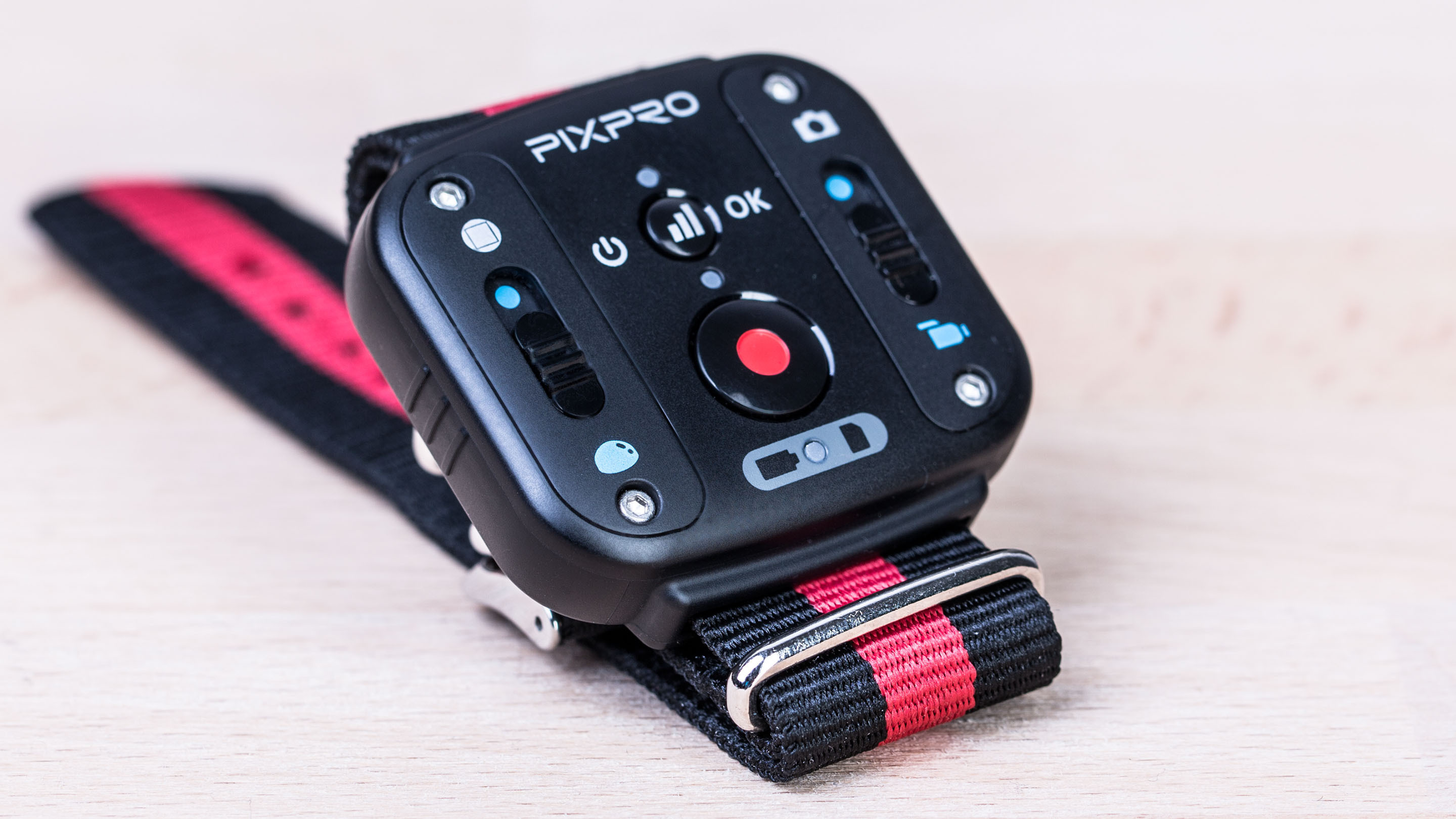 Auf der Oberseite des Gehäuses gibt es ein 1 Zoll großes Status-LCD, allerdings ohne Beleuchtung. Die Bedienung gestaltet sich einfach: Auf der von vorne gesehen linken Seite finden sich Ein/Aus/Modus-Schalter, Menü-Button, WLAN-Taste und ein großer Aufnahmeknopf. Die Knöpfe haben alle unterschiedliche Formen und sind so auch blind zu ertasten, wenn die Kamera beispielsweise auf einem Helm angebracht ist.