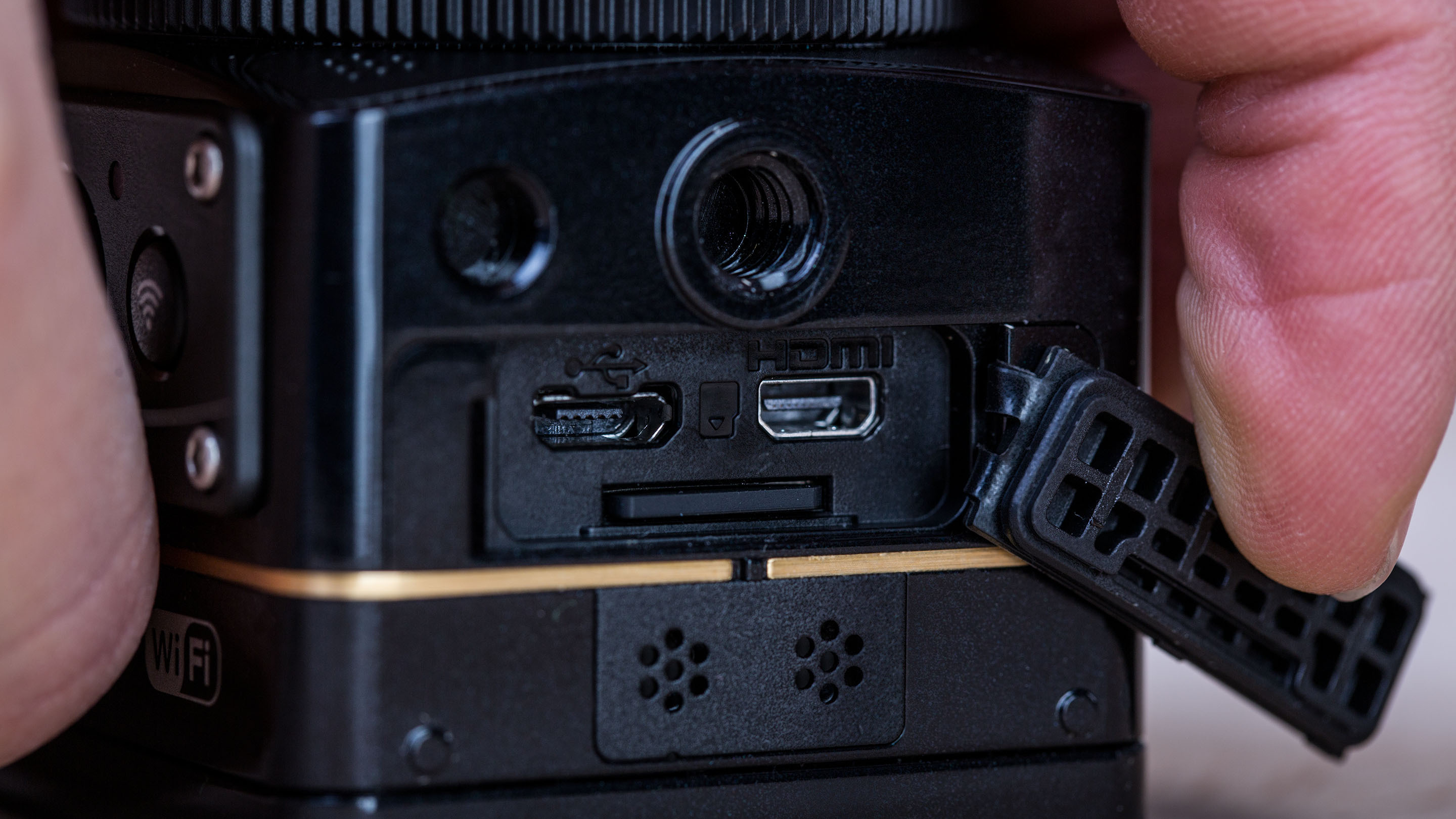Unten am Gehäuse befindet sich das bereits erwähnte Stativgewinde, außerdem gibt es hier auch einen microSD-Slot für bis zu 128 GByte große SDXC-Karten sowie eine HDMI-Ausgang und einen USB-Port. Aufgrund der Positionierung des Slots muss man die Kamera vom Stativ nehmen, um die Speicherkarte zu tauschen.