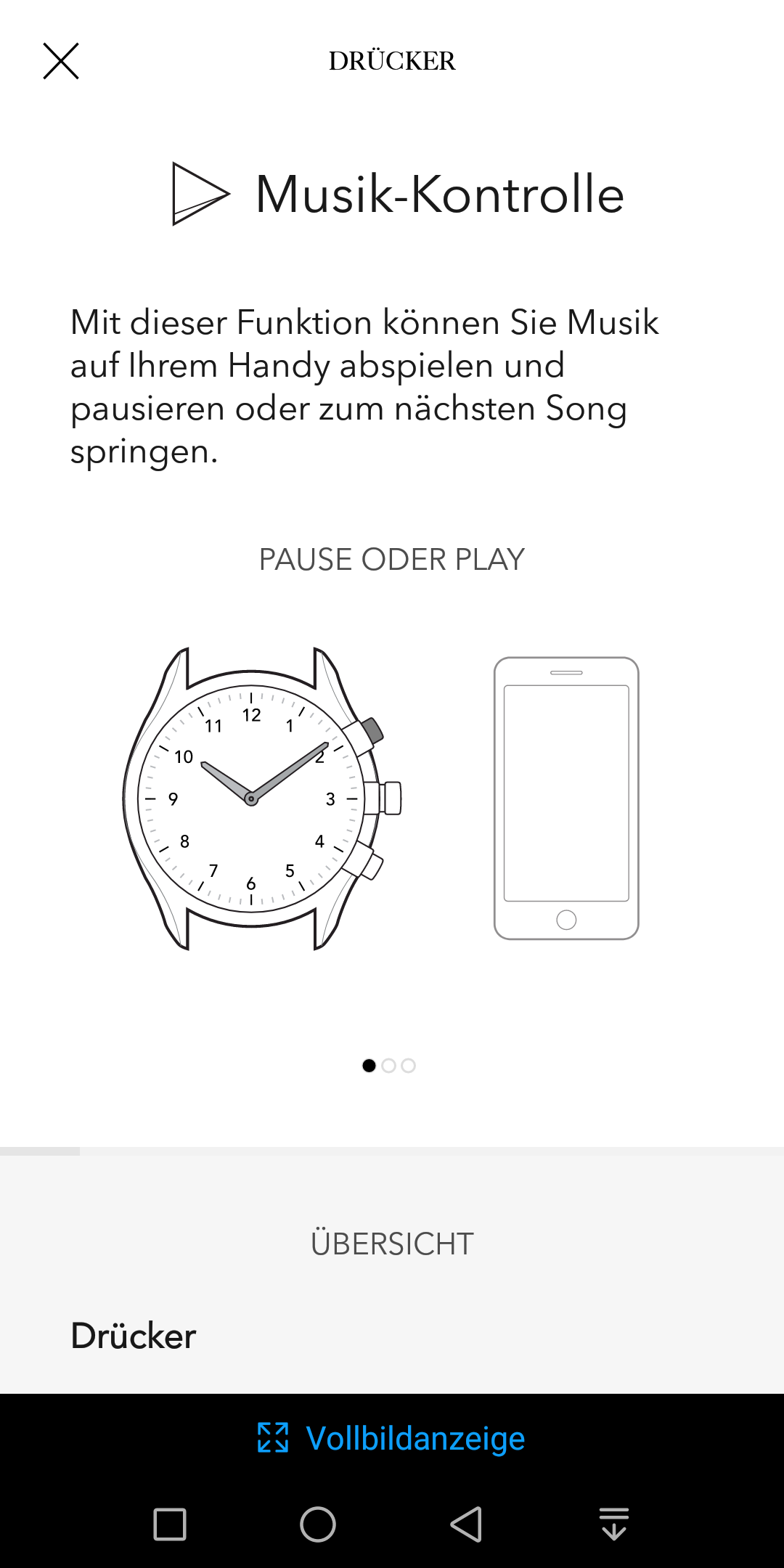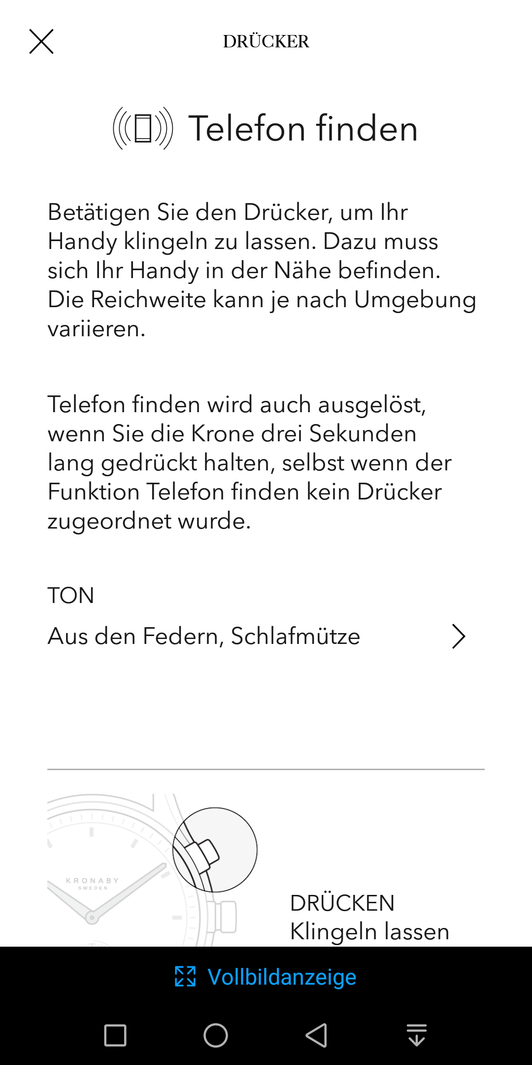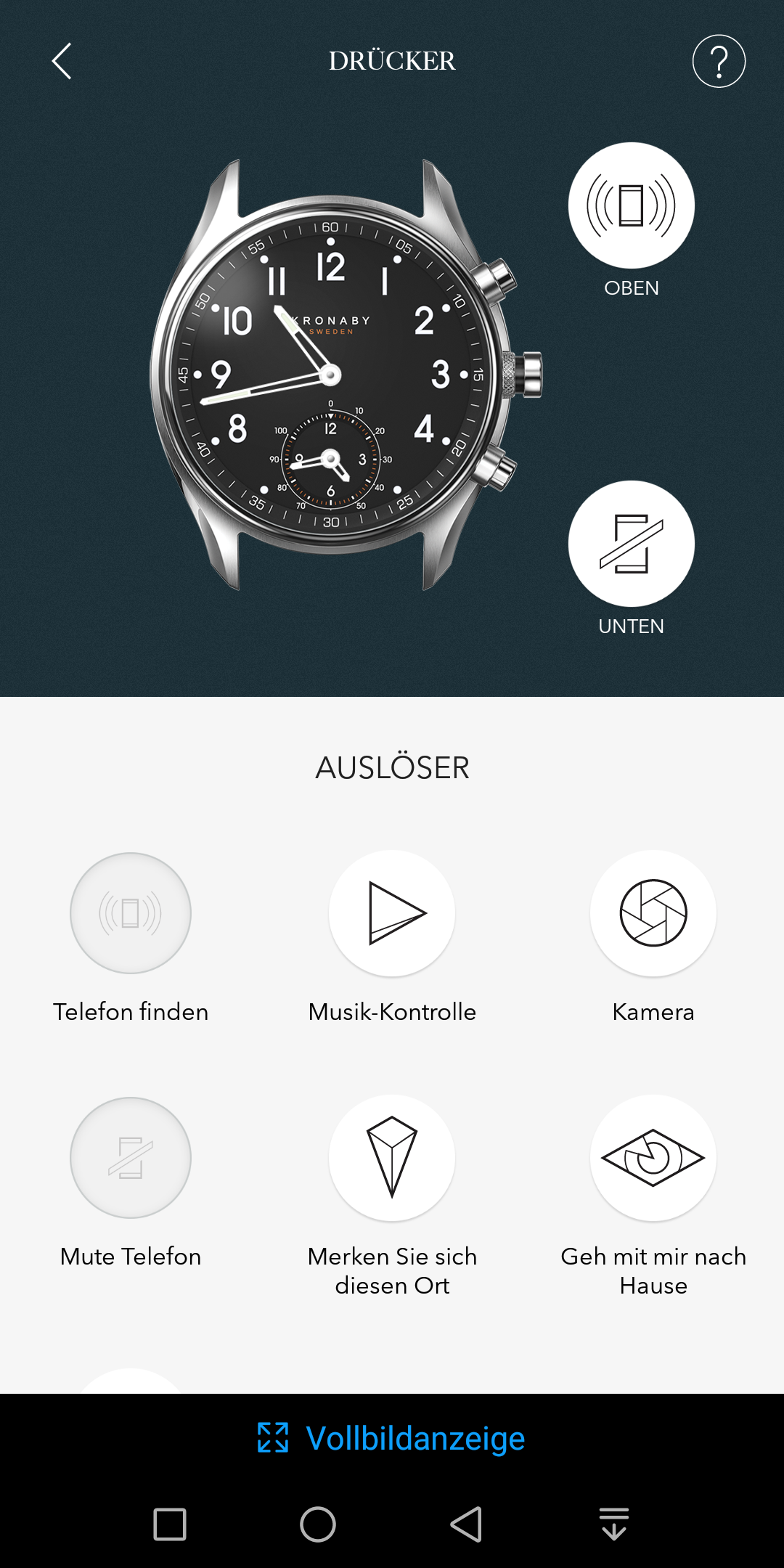 Für die Belegung der beiden kleineren Taster, den so genannten Drückern, stehen insgesamt sieben Funktionen zur Verfügung: Telefon finden, Musik-Kontrolle, Kamera-Fernbedienung, Stummschaltung aktivieren, GPS-Position speichern, Position senden und eine IFTTT-Aktion auslösen. Die genaue Funktionsweise wird mit einer kurzen Animation erläutert und so macht die Nutzung der gut durchdachten App wirklich Spaß.