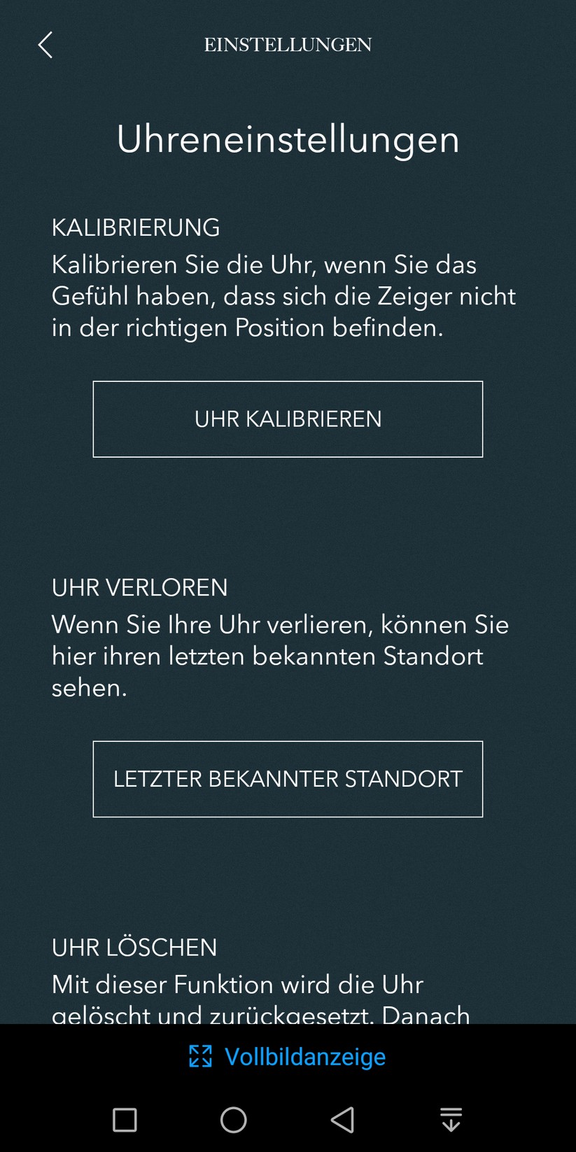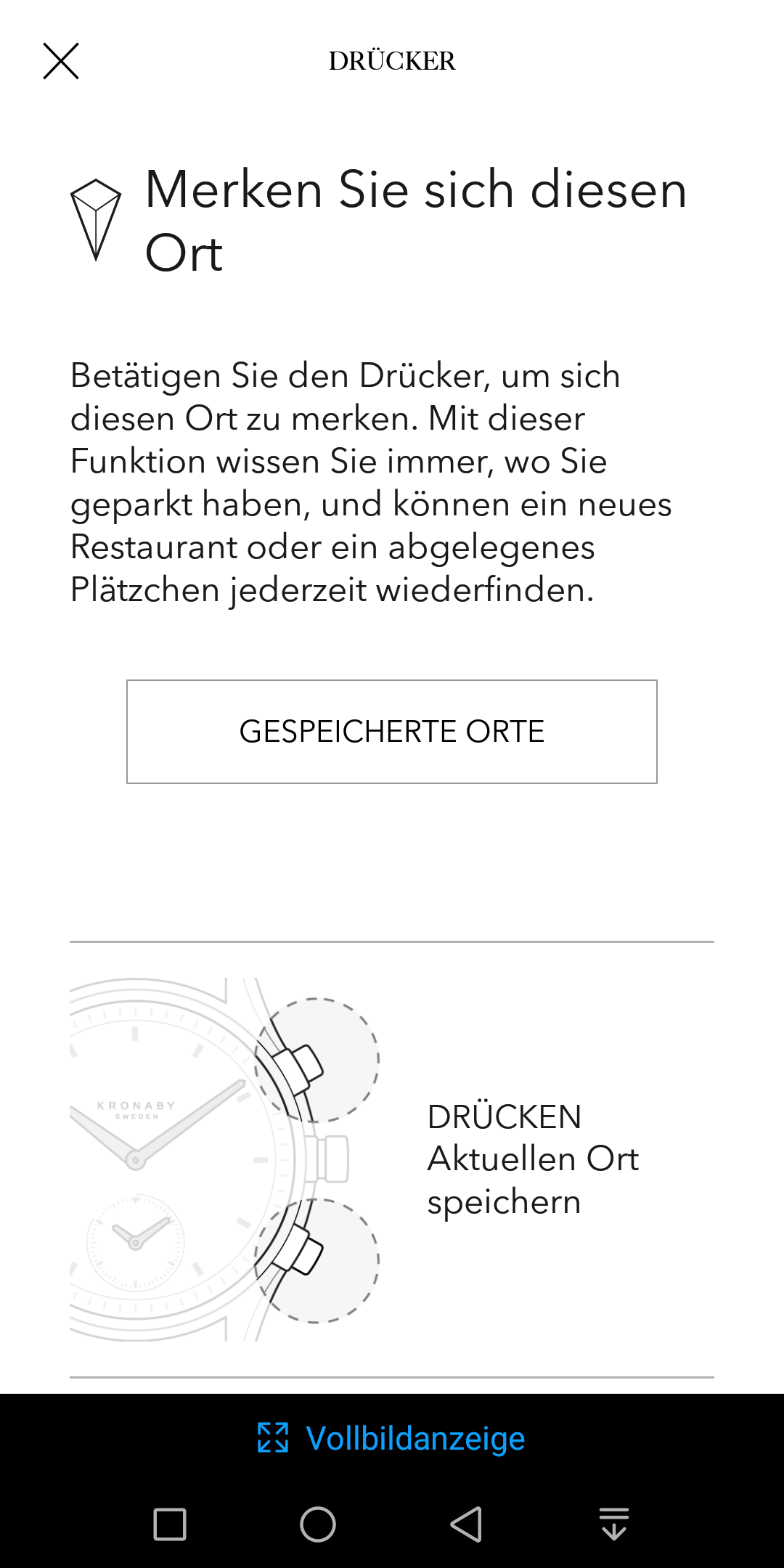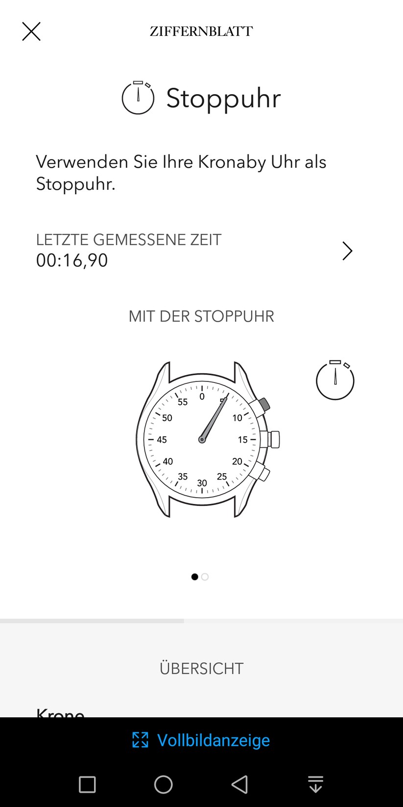Der größte Taster, die Krone, lässt sich ebenfalls mit einer zweiten Zeitzone oder der Schritt-Überwachung belegen. Die Werte zeigt die Uhr dann allerdings auf dem Haupt-Ziffernblatt an. Zusätzlich ermöglicht die Smartwatch, die Funktionen Timer, Stoppuhr und Datumsanzeige zu nutzen. Die genaue Funktionsweise erläutert die App in einer kurzen bebilderten Anleitung. Diese ist auf jeden Punkt im Menü abgestimmt, so dass die Bedienung keinerlei Probleme bereitet. Auch langes Blättern in einem digitalen Handbuch erübrigt sich dadurch. Zusätzlich besteht die Möglichkeit, drei Kontakte zu hinterlegen. Deren Anrufe und Nachrichten signalisiert die Uhr dann mit einem Vibrationsalarm. Wer seine Uhr verlegt, bekommt die letzte bekannte Position der Smartwatch ebenfalls in der App angezeigt.