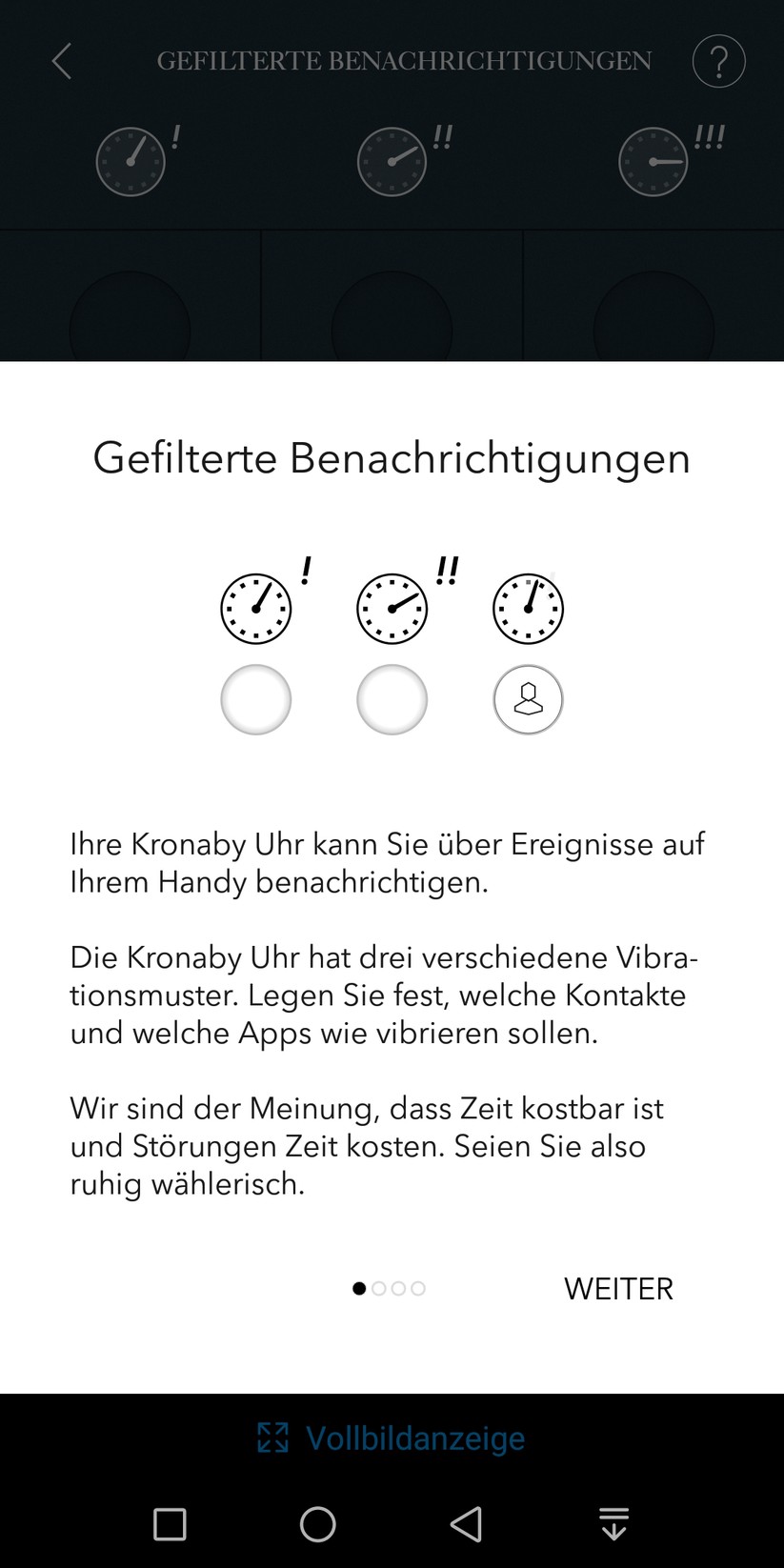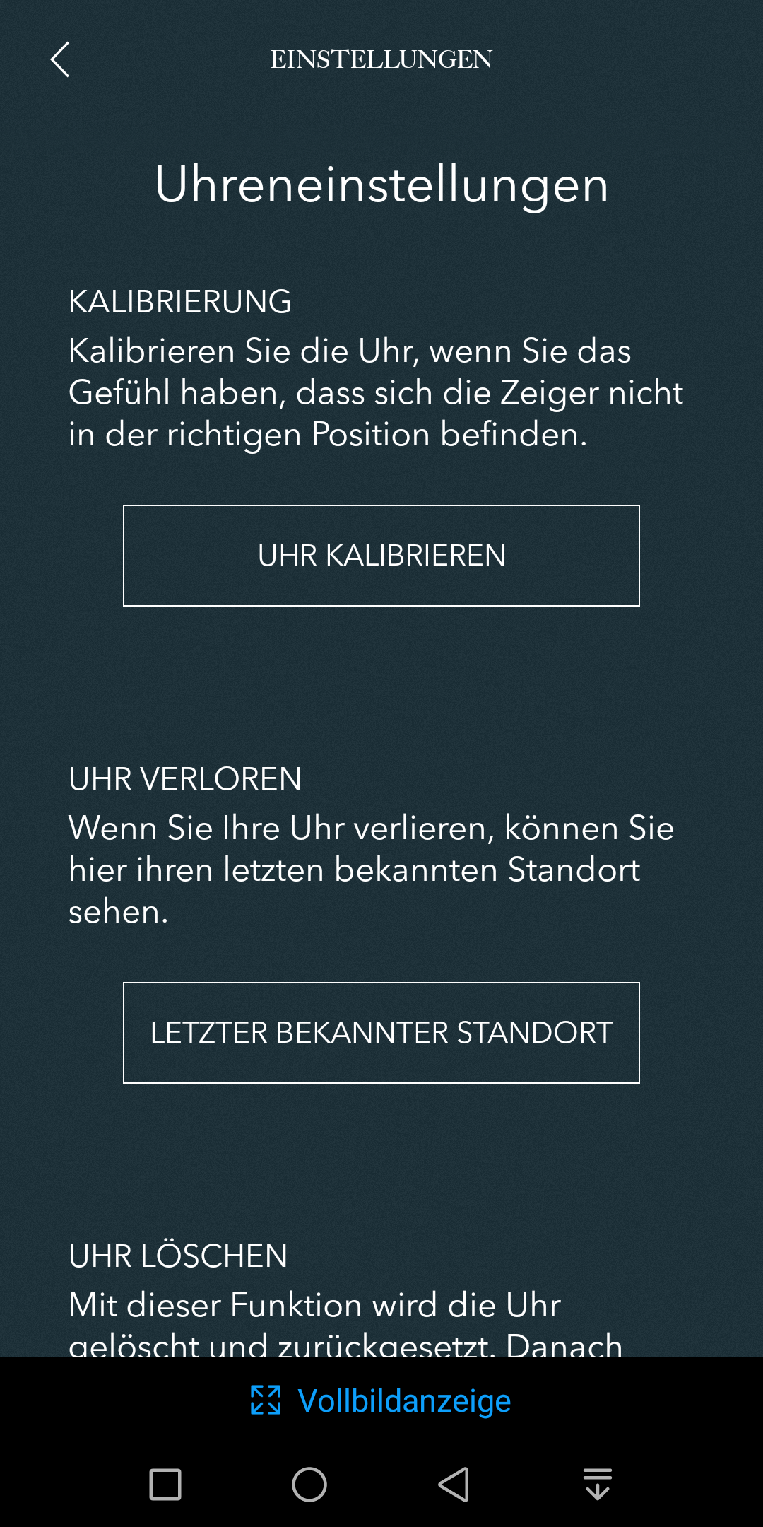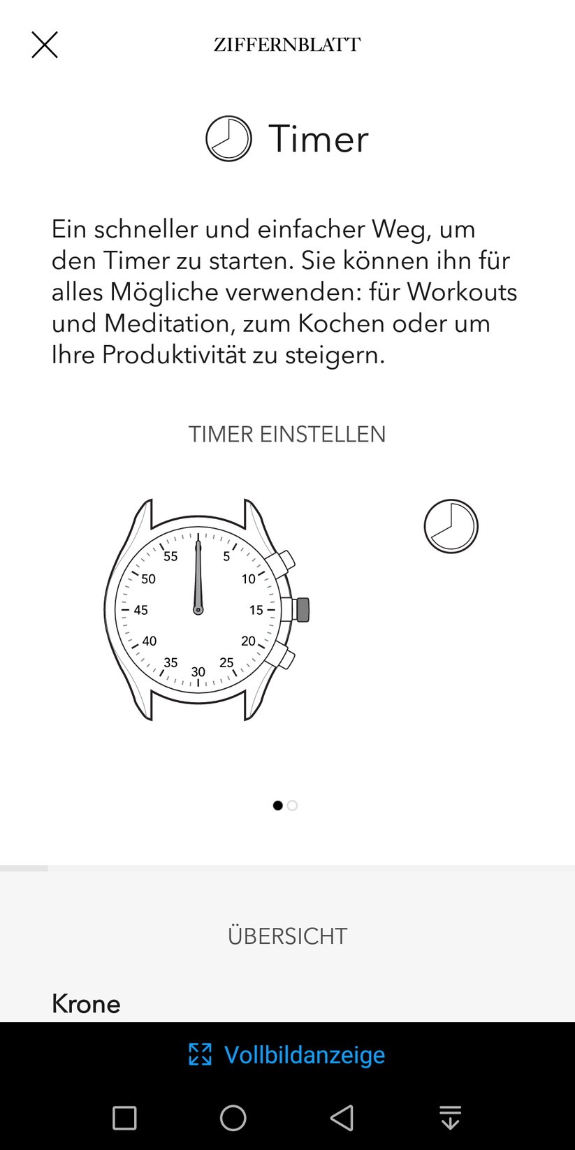 Der größte Taster, die Krone, lässt sich ebenfalls mit einer zweiten Zeitzone oder der Schritt-Überwachung belegen. Die Werte zeigt die Uhr dann allerdings auf dem Haupt-Ziffernblatt an. Zusätzlich ermöglicht die Smartwatch, die Funktionen Timer, Stoppuhr und Datumsanzeige zu nutzen. Die genaue Funktionsweise erläutert die App in einer kurzen bebilderten Anleitung. Diese ist auf jeden Punkt im Menü abgestimmt, so dass die Bedienung keinerlei Probleme bereitet. Auch langes Blättern in einem digitalen Handbuch erübrigt sich dadurch. Zusätzlich besteht die Möglichkeit, drei Kontakte zu hinterlegen. Deren Anrufe und Nachrichten signalisiert die Uhr dann mit einem Vibrationsalarm. Wer seine Uhr verlegt, bekommt die letzte bekannte Position der Smartwatch ebenfalls in der App angezeigt.