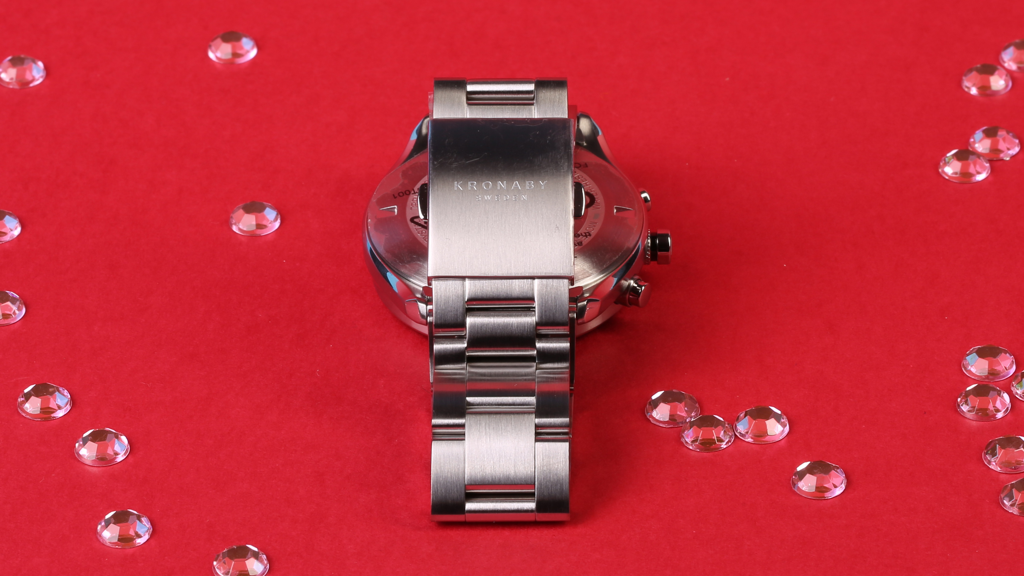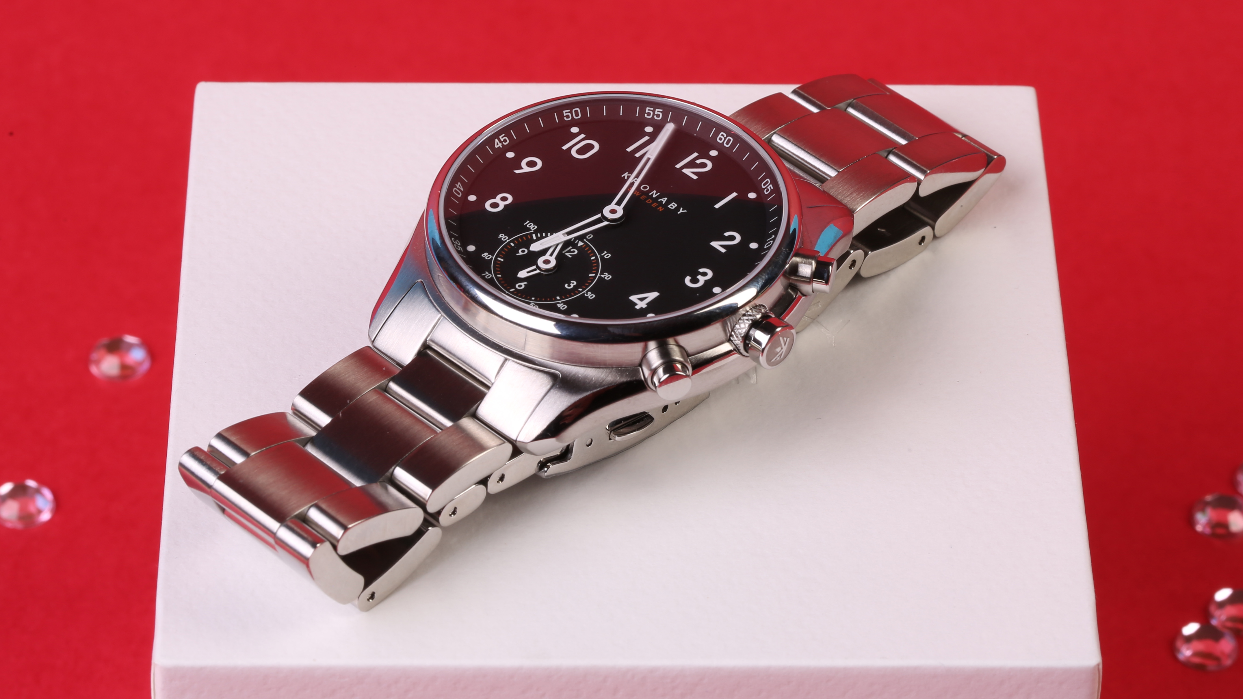 Die Kronaby Hybrid-Uhr kommt edel verpackt beim Kunden an: Der Deckel der Uhren-Schachtel ist mit Stoff bezogen und die Hybrid-Watch ruht auf einem ebenfalls bezogenen Kissen. Beim Herausnehmen der Uhr setzt sich der hochwertige Eindruck fort: Die Uhr ist überraschend schwer; 175 Gramm bringt sie auf die Wage. Zusätzlich ist sie rundherum durch Folie geschützt. Unser schwedisch Testmodell heißt Sekel – auf deutsch Jahrhundert, besitzt ein silbernes Gehäuse und ein ebenfalls silbernes Metallarmband mit Kippfaltschließe.