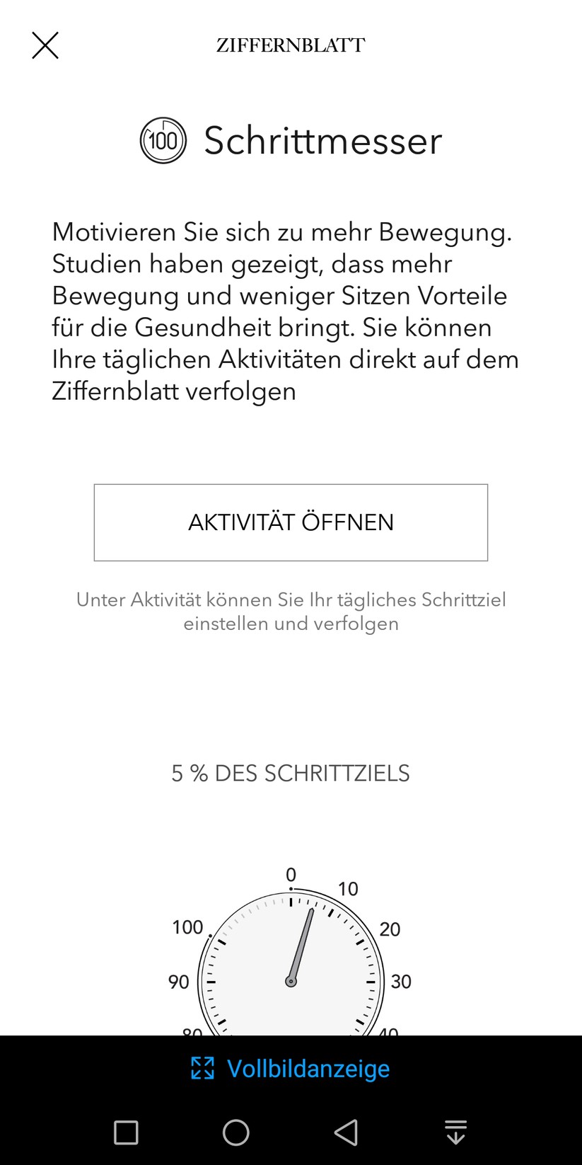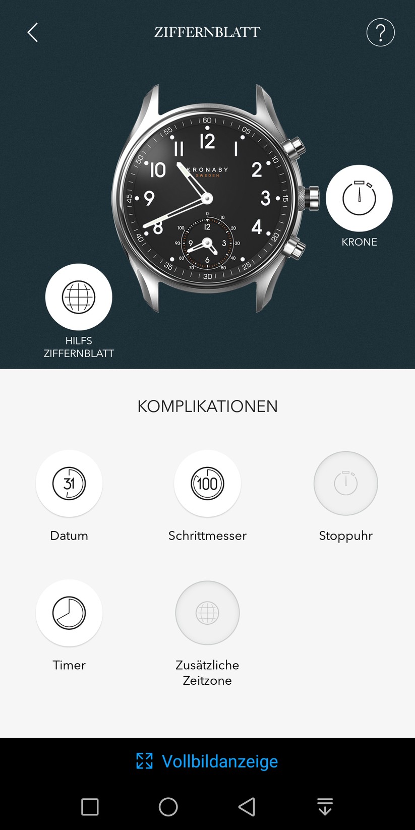 Die drei Bedientaster der Uhr lassen sich von Nutzern mit Hilfe der kostenlosen App individuell mit Funktionen belegen. Zuvor gilt es, Smartphone und Uhr per Bluetooth zu verbinden. Das funktioniert problemlos und dauert nicht einmal zwei Minuten. Ein kleines Hilfs-Ziffernblattes zeigt – je nach Einstellung – wahlweise eine zweite Zeitzone oder dient als Schrittzähler. Dazu hinterlegt man ein Schritt-Ziel in der App, und die Uhr zeigt auf Knopfdruck den Erfüllungsgrad in Prozent an.