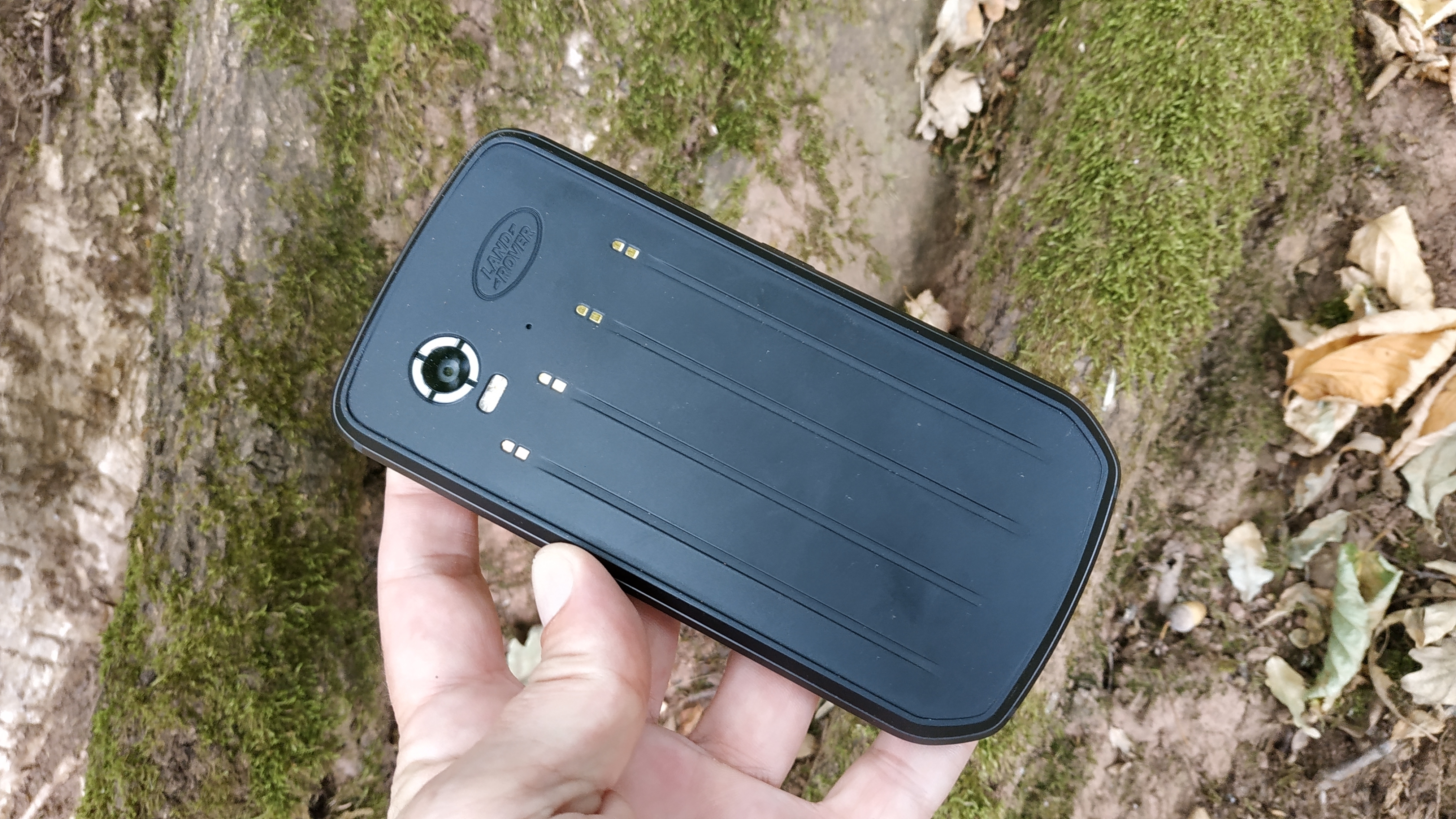 Die robuste Haptik verdankt das Explore in erster Linie dem rundum laufenden Metallrahmen, der einen unverwüstlichen Eindruck macht. Dieser setzt sich beim Power-Button und Lautstärkewippe auf der linken Seite fort. Die Tasten sind aus Metall und haben ein eingefrästes Muster, das sie sehr griffig macht. Unten am Handy ist ein USB-Typ-C-Anschluss, oben eine Kopfhörerbuchse. Auf der Rückseite findet sich oben im linken Bereich die Hauptkamera des Smartphones, rechts davon ist das Land-Rover-Logo in die gummierte Oberfläche eingestanzt. Die Abmessungen des Land Rover Explore betragen 152 × 75,3 × 14 Millimeter bei einem Gewicht von 232 Gramm.