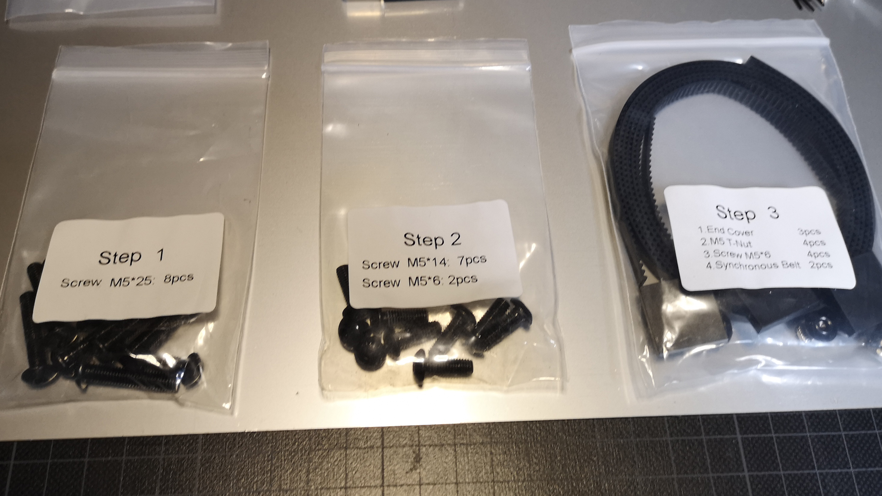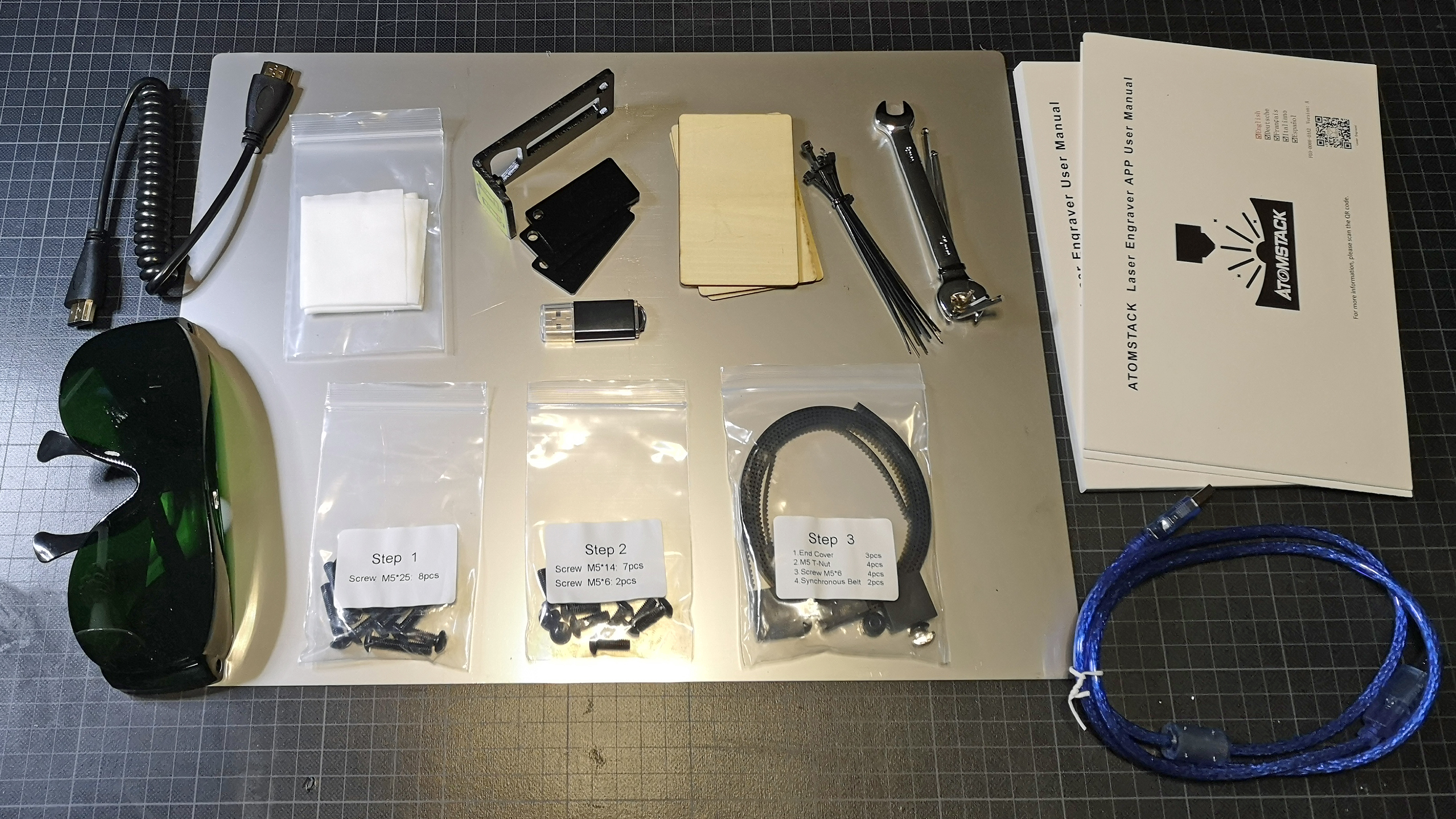 Der Bausatz des A20 Pro M50 kommt ordentlich verpackt und dick gepolstert bei uns an. Im Karton liegen die Einzelteile des Rahmens inklusive Schrauben und Werkzeug, der ungewohnt große Laser-Kopf, das Bedienteil mit Mainboard, der Touchscreen, der Air-Assist-Kompressor samt Luftschlauch, ein USB-Kabel, einige Musterstücke zum Gravieren und eine Anleitung. Auch ein großes Blech als Schutz der Tischplatte ist beigelegt. Die Einzelteile und Komponenten sind alle ordentlich verarbeitet und entgratet und hinterlassen einen hochwertigen Eindruck. Eine Laser-Schutzbrille ist ebenfalls beigelegt – grün und unbequem, weshalb wir im Test unsere private Schutzbrille benutzen.
