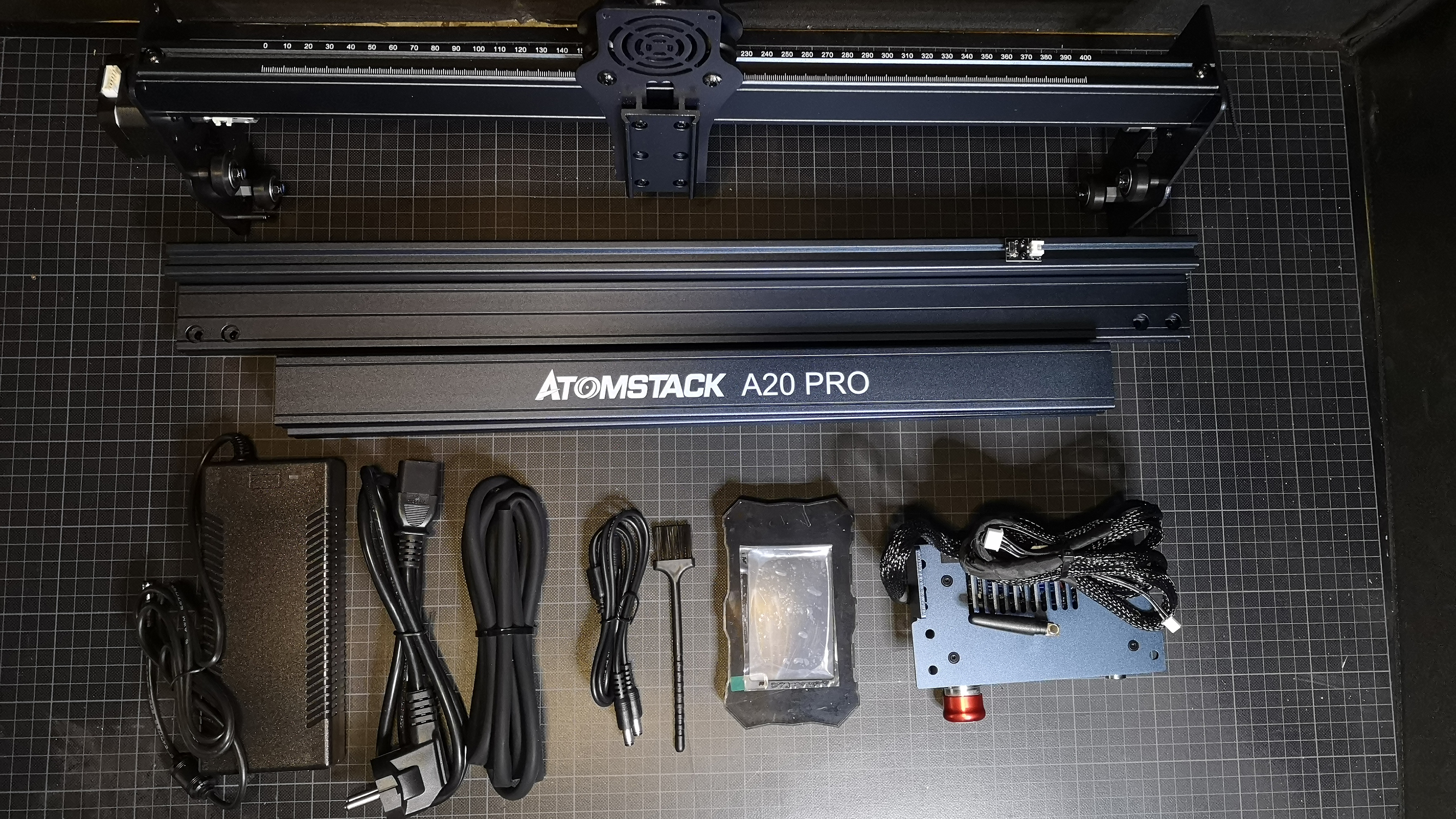 Die Größe des Arbeitsbereichs und der Grundaufbau des Rahmens sind mit anderen Modellen des Herstellers identisch. Ohne optionale Erweiterung beträgt der Arbeitsbereich 41 × 40 cm. Damit ist der A20 Pro so groß wie der Atomstack A5 M50 Pro (Testbericht) und etwas größer als der Twotrees TTS-55 (Testbericht).